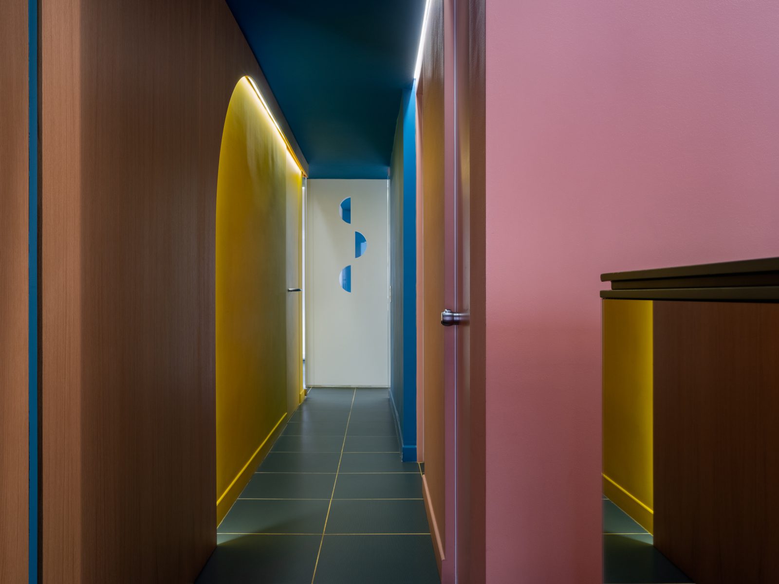 Ο χρωματικός συνδυασμός συνεχίζεται άφοβα και στον διάδρομο, συμπεριλαμβάνοντας πόρτες που σχεδόν εξαφανίζονται από το εφέ καμουφλάζ των χρωμάτων. Λευκά διάτρητα πάνελ, διαχωρίζουν ανάλαφρα τους πίσω χώρους και συνυπάρχουν δυναμικά με τα υπόλοιπα χρώματα. Ακόμη και το απόλυτο λευκό των αποστειρωμένων χειρουργικών αιθουσών συνυπάρχει σε κάποια σημεία με σχήματα και χρώμα.