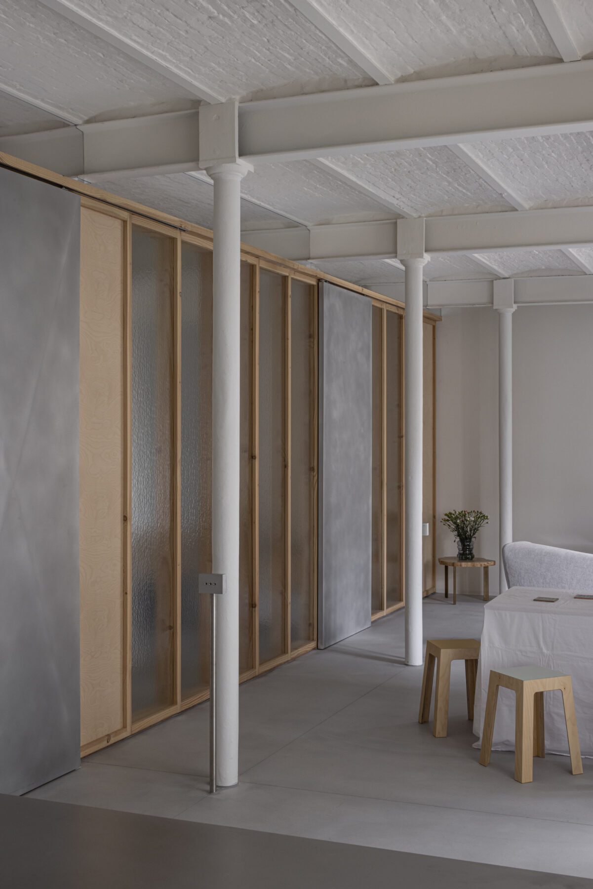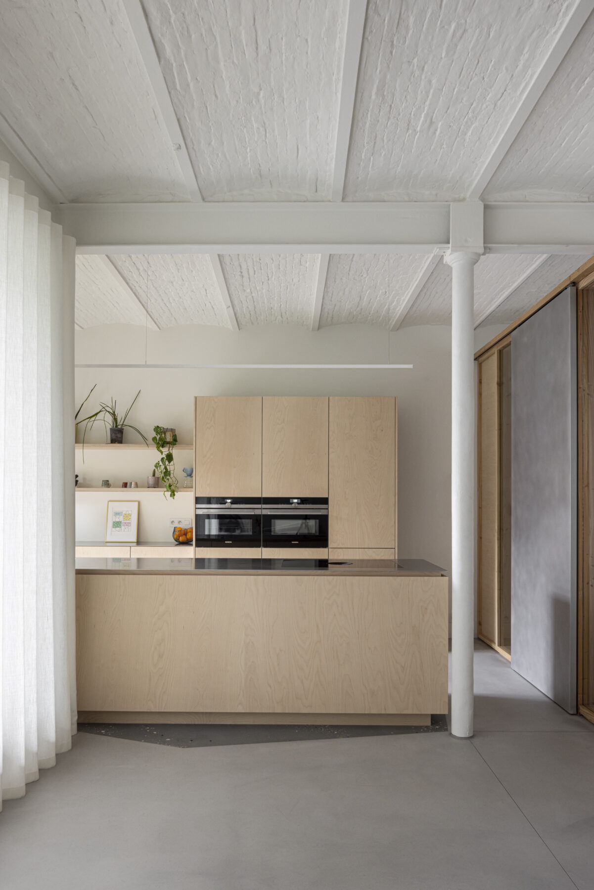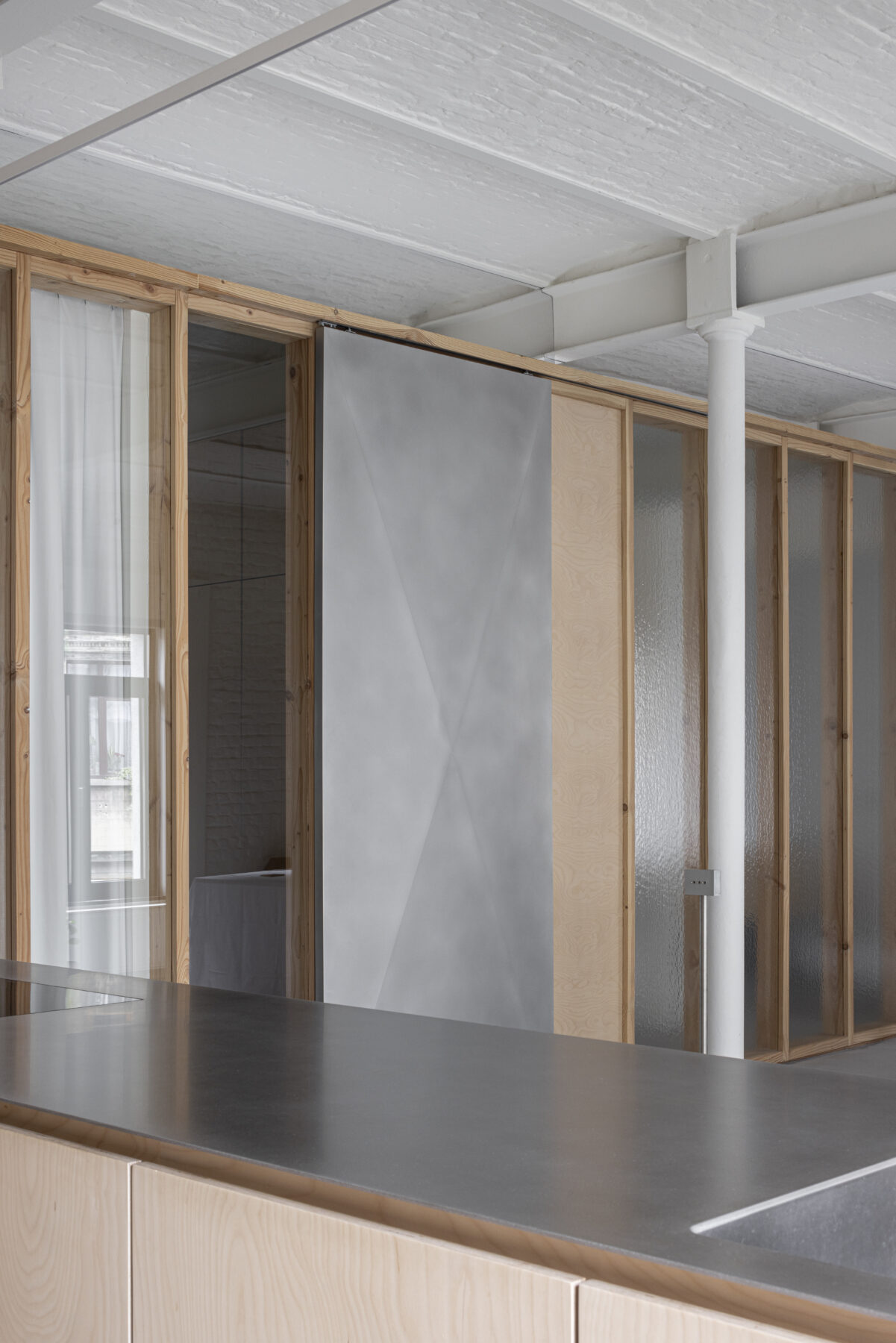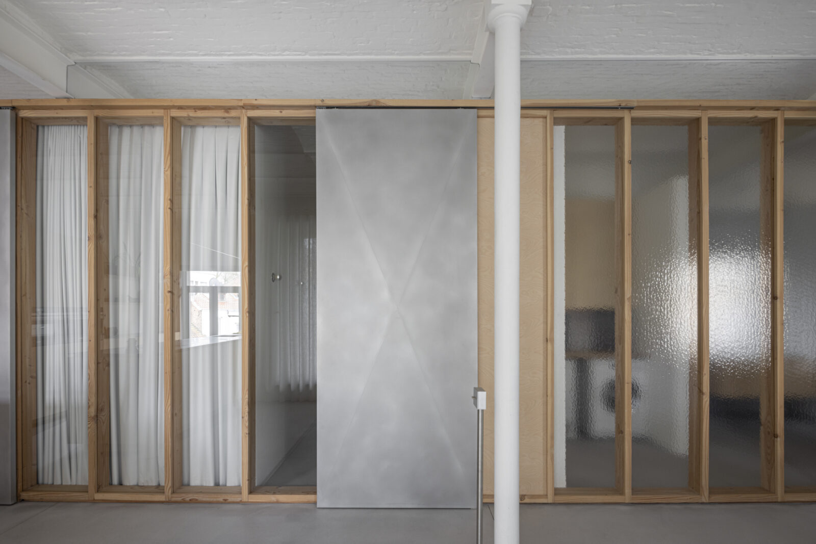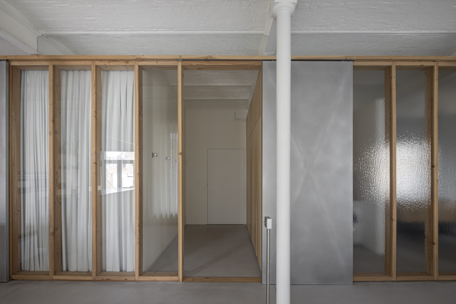 The moving elements are made from a different material than the fixed parts, so that the sliding doors are highly intuitive to use. By leaving the panels open, the feeling of a loft is kept alive, but if need be, the resident can also retreat in peace and quiet behind closed panels, which separate her from the other residents but with still a lot of natural light to enjoy.