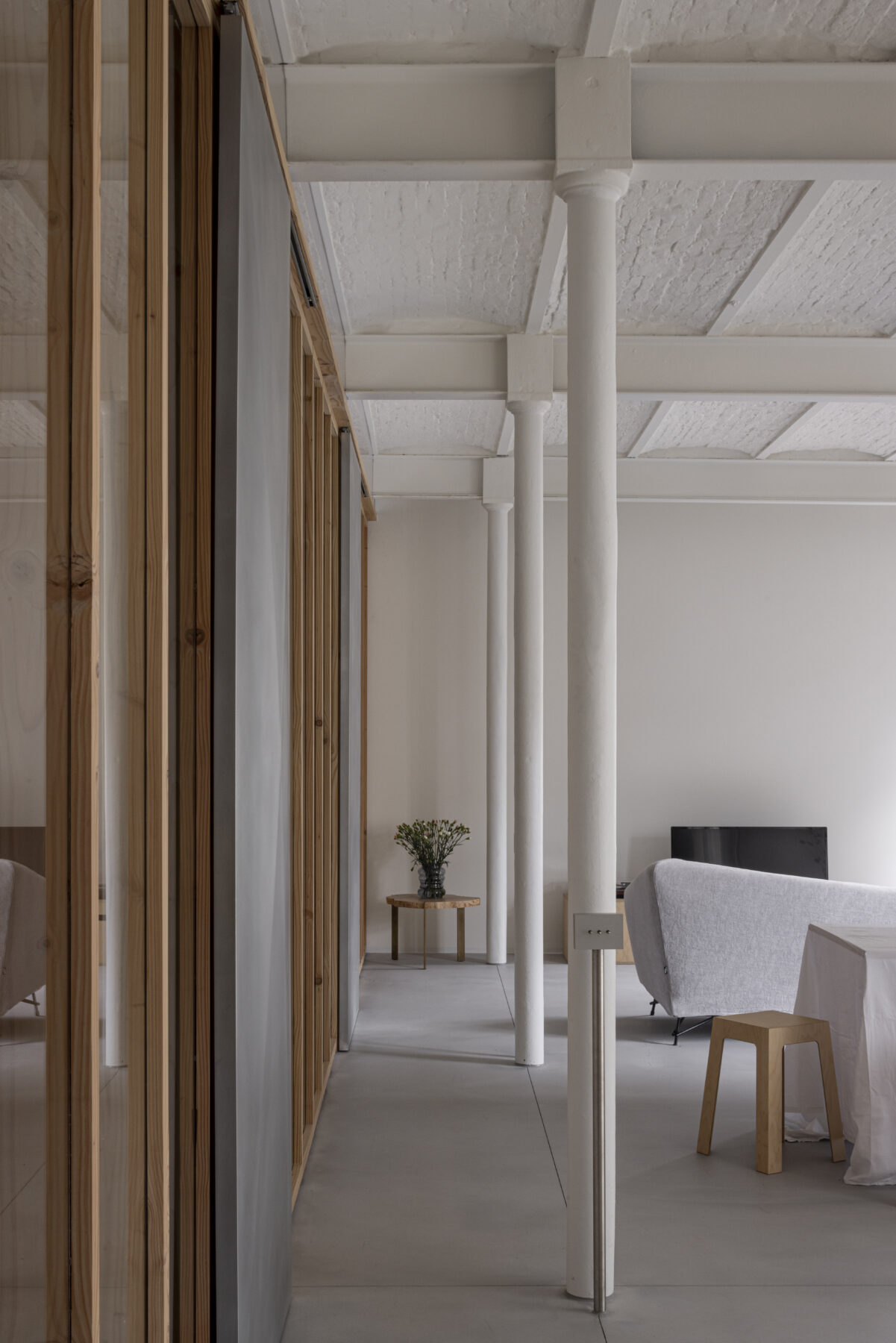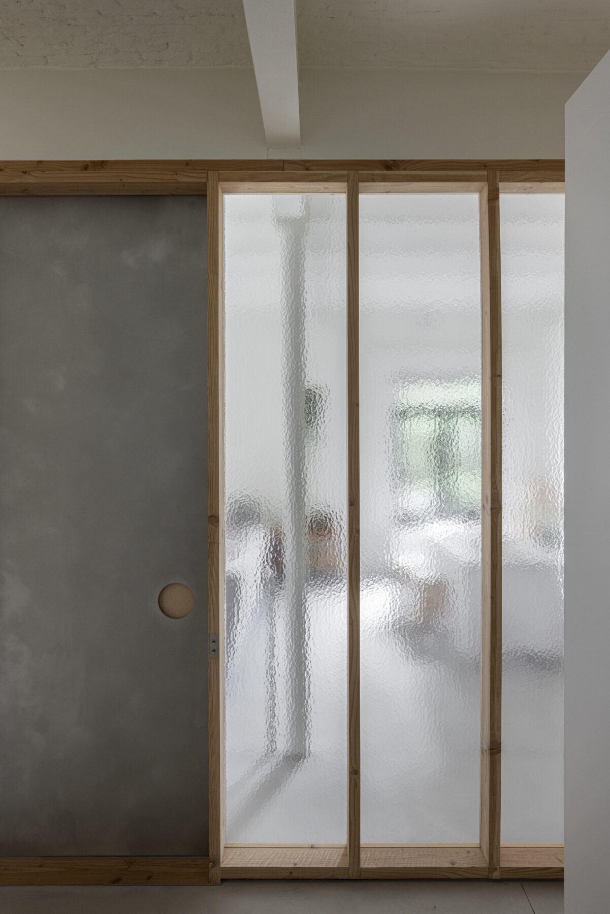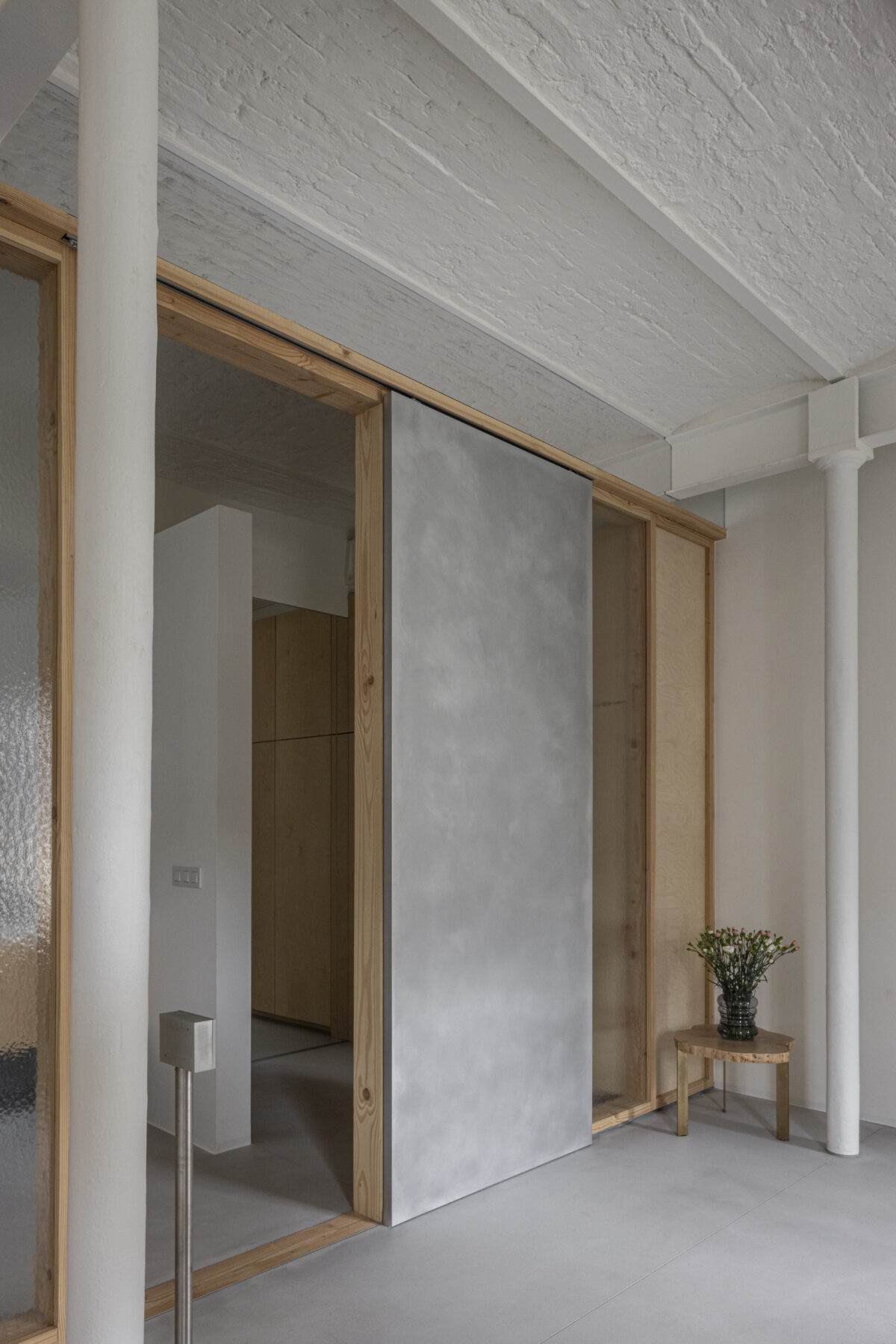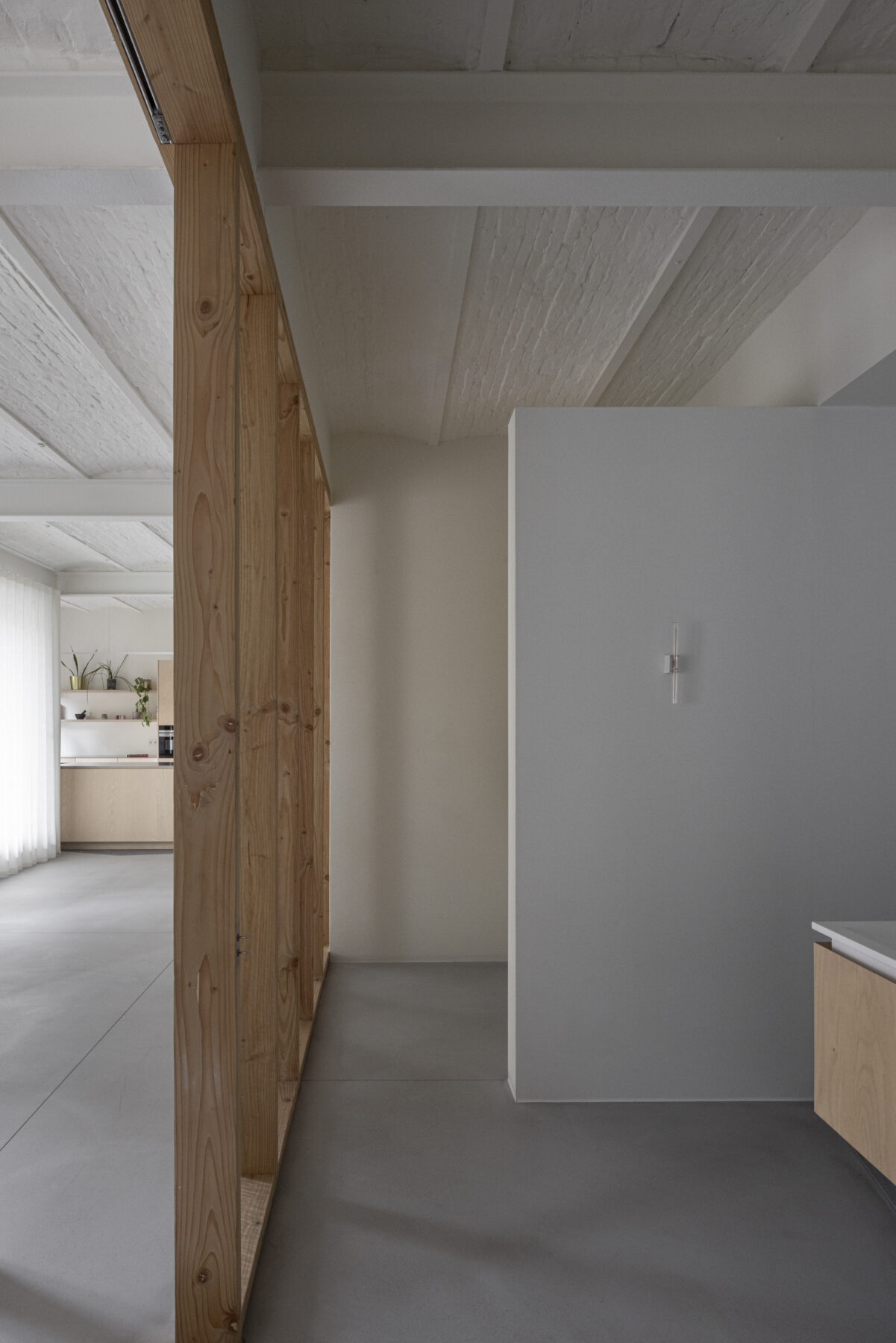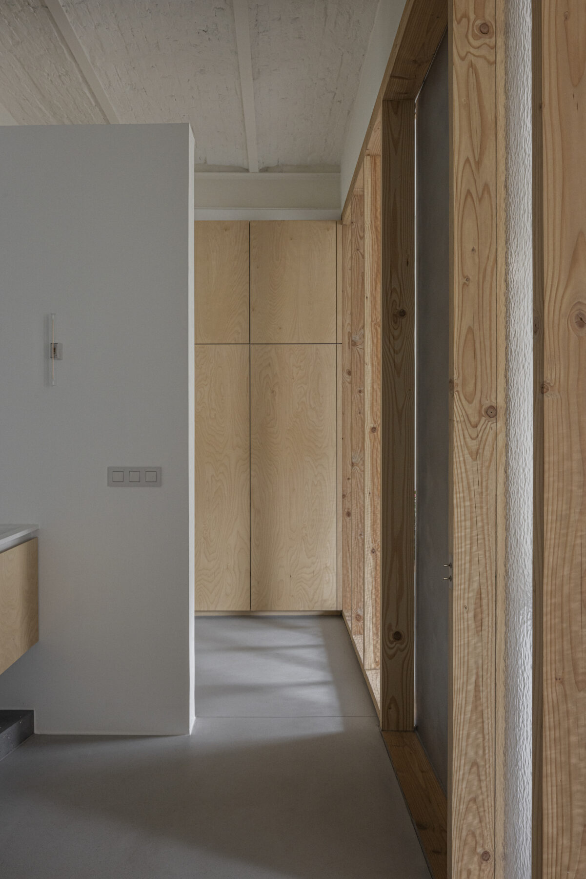 The moving elements are made from a different material than the fixed parts, so that the sliding doors are highly intuitive to use. By leaving the panels open, the feeling of a loft is kept alive, but if need be, the resident can also retreat in peace and quiet behind closed panels, which separate her from the other residents but with still a lot of natural light to enjoy.