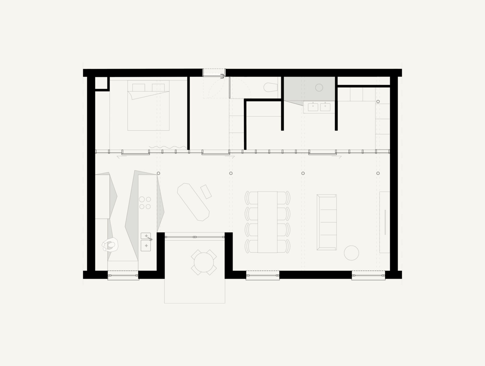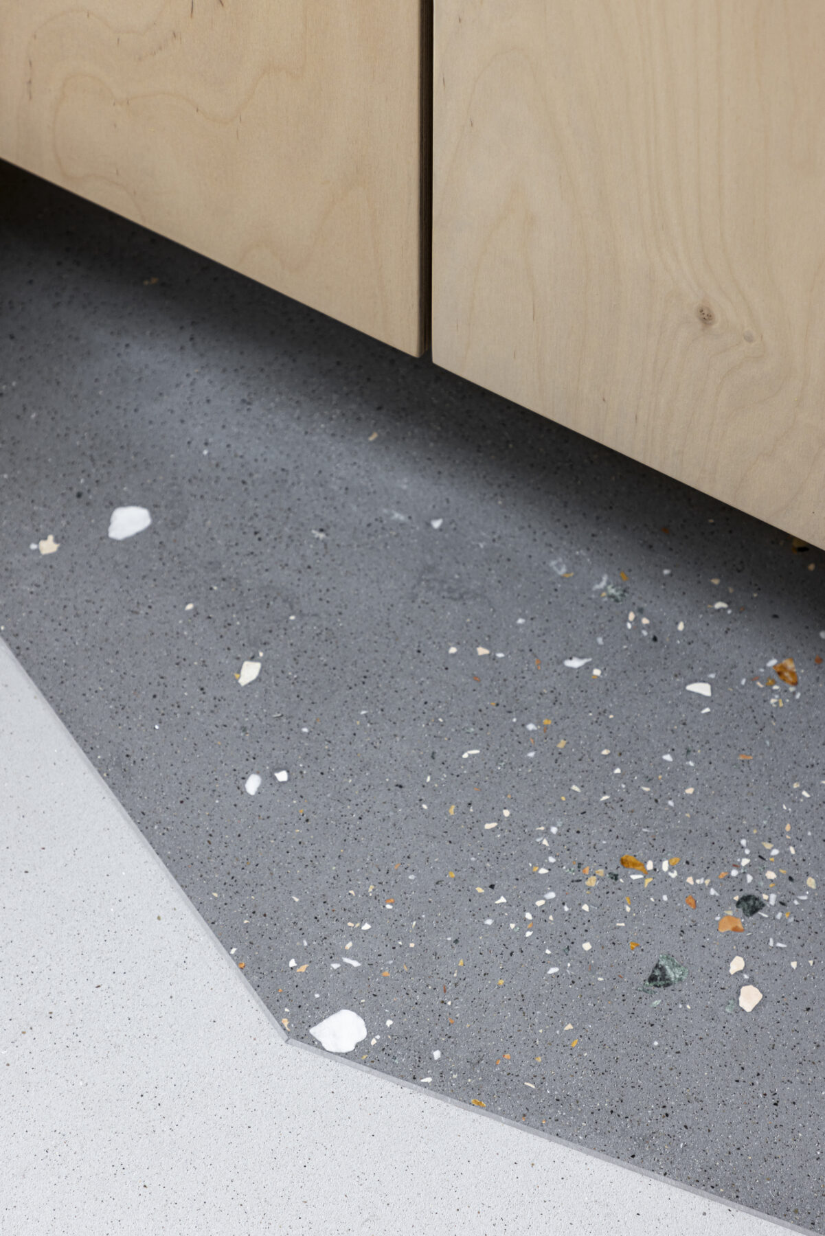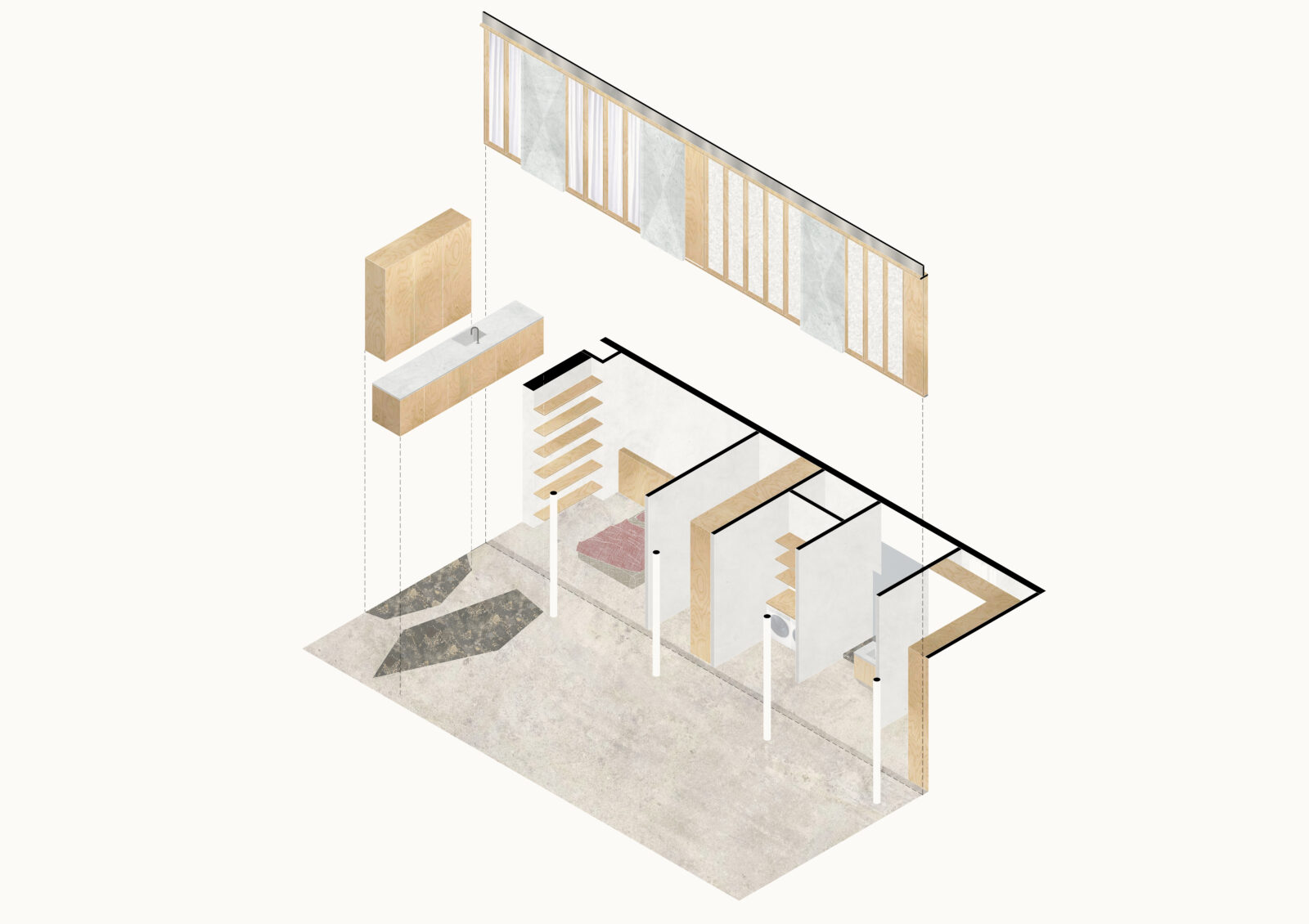 The approach reinforced the concept where we wanted to subtly guide the resident along the different functional spaces fostering an intuitive flow. Similarly, we employed different floor finishes around the fixed furniture in the kitchen and bathroom. This also establishes implicit boundaries without a real physical presence, instead relying on suggestive intentions.