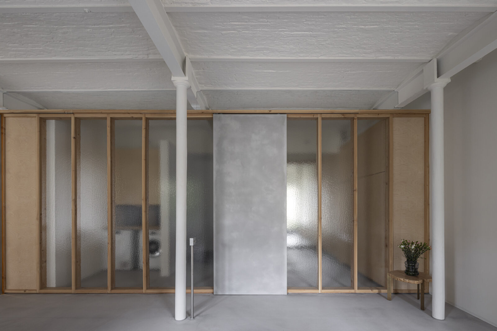 POESENVANHIEL architects design 1902 loft in Belgium in an open space plan with discreet private rooms divided with a glass curtain wall.