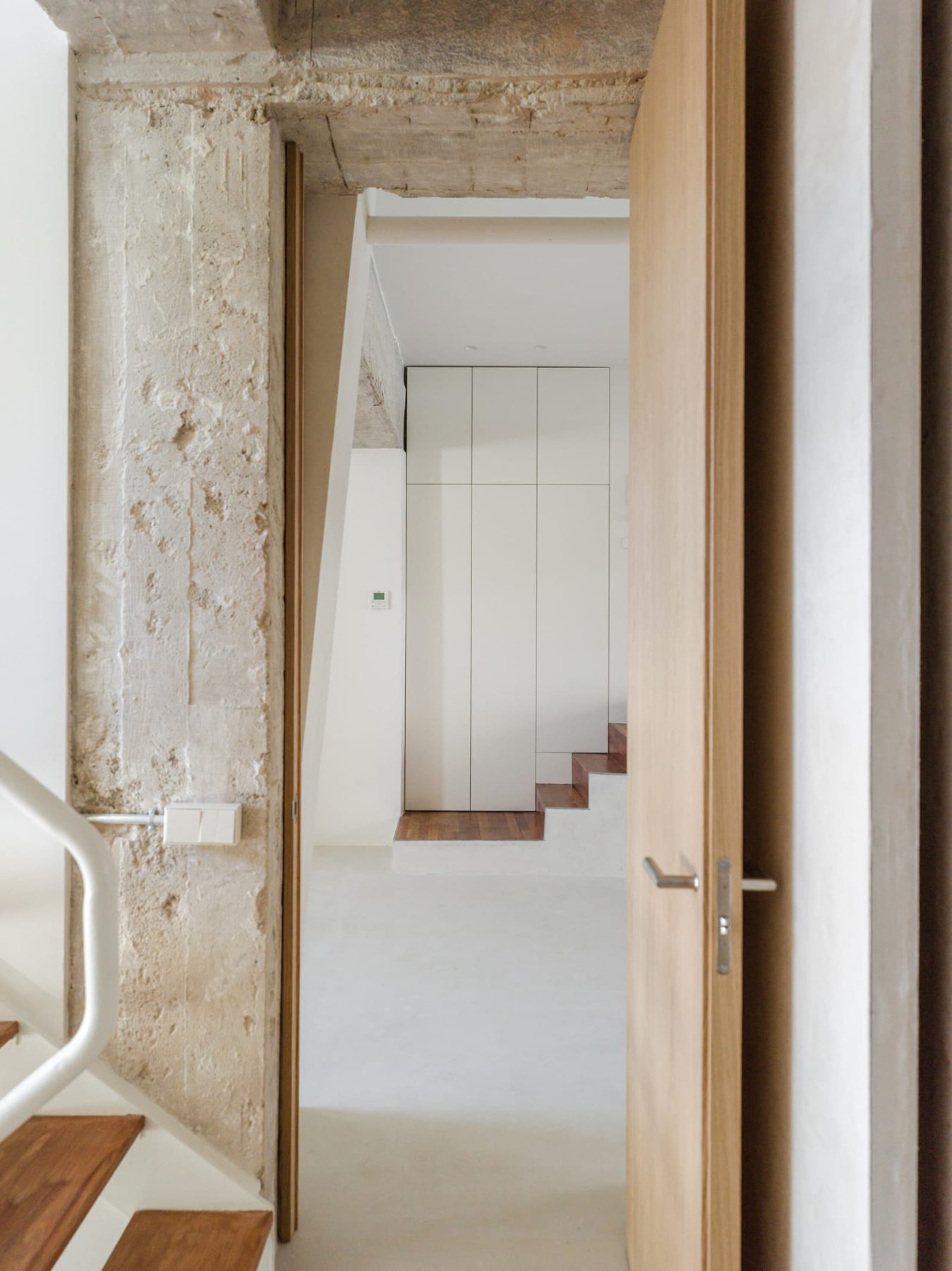 The transformation of this space starts with a fundamental idea: exposing the structure to enhance its spatial qualities and create a seamless connection between the two facades, linking the street to the inner courtyard while increasing natural light.