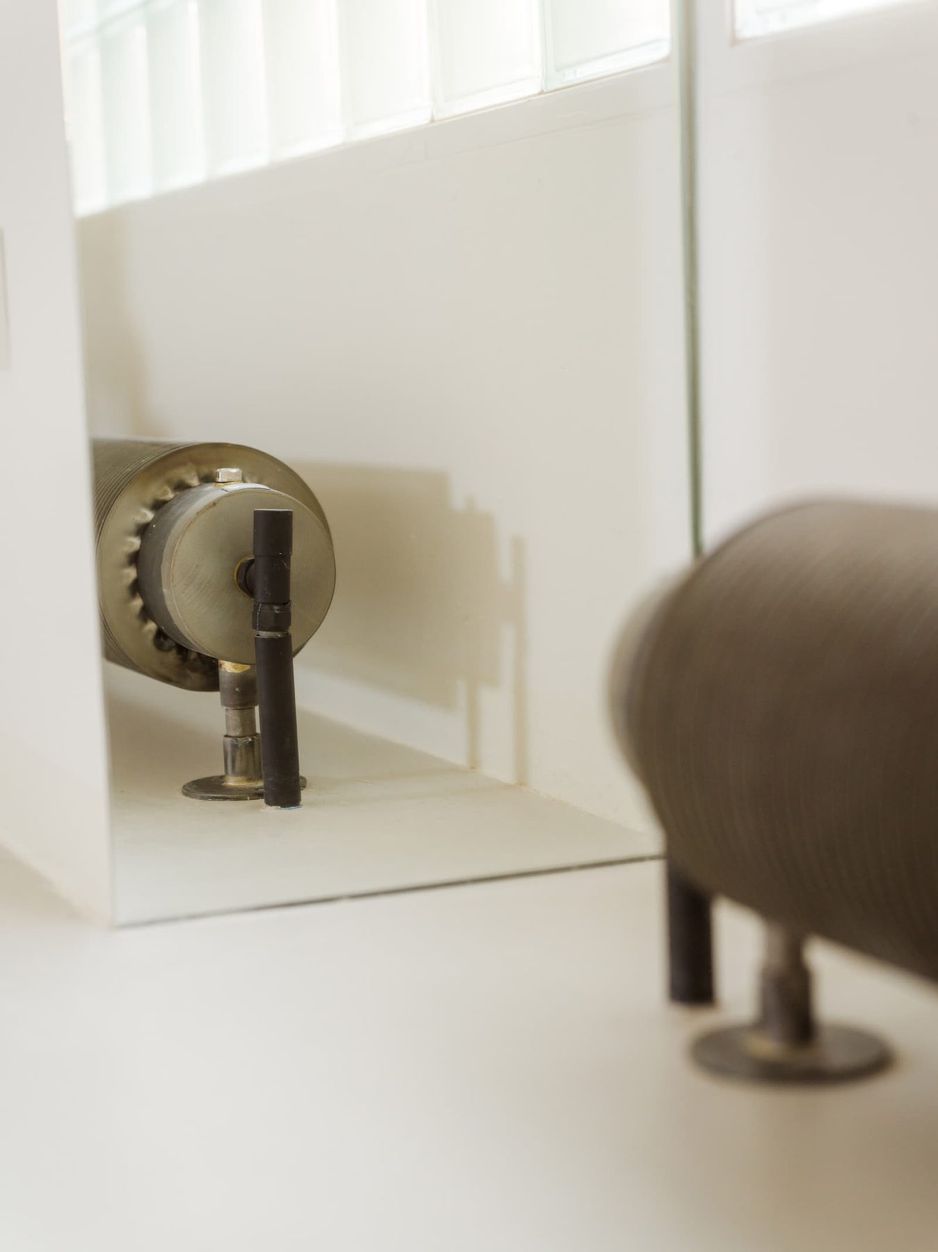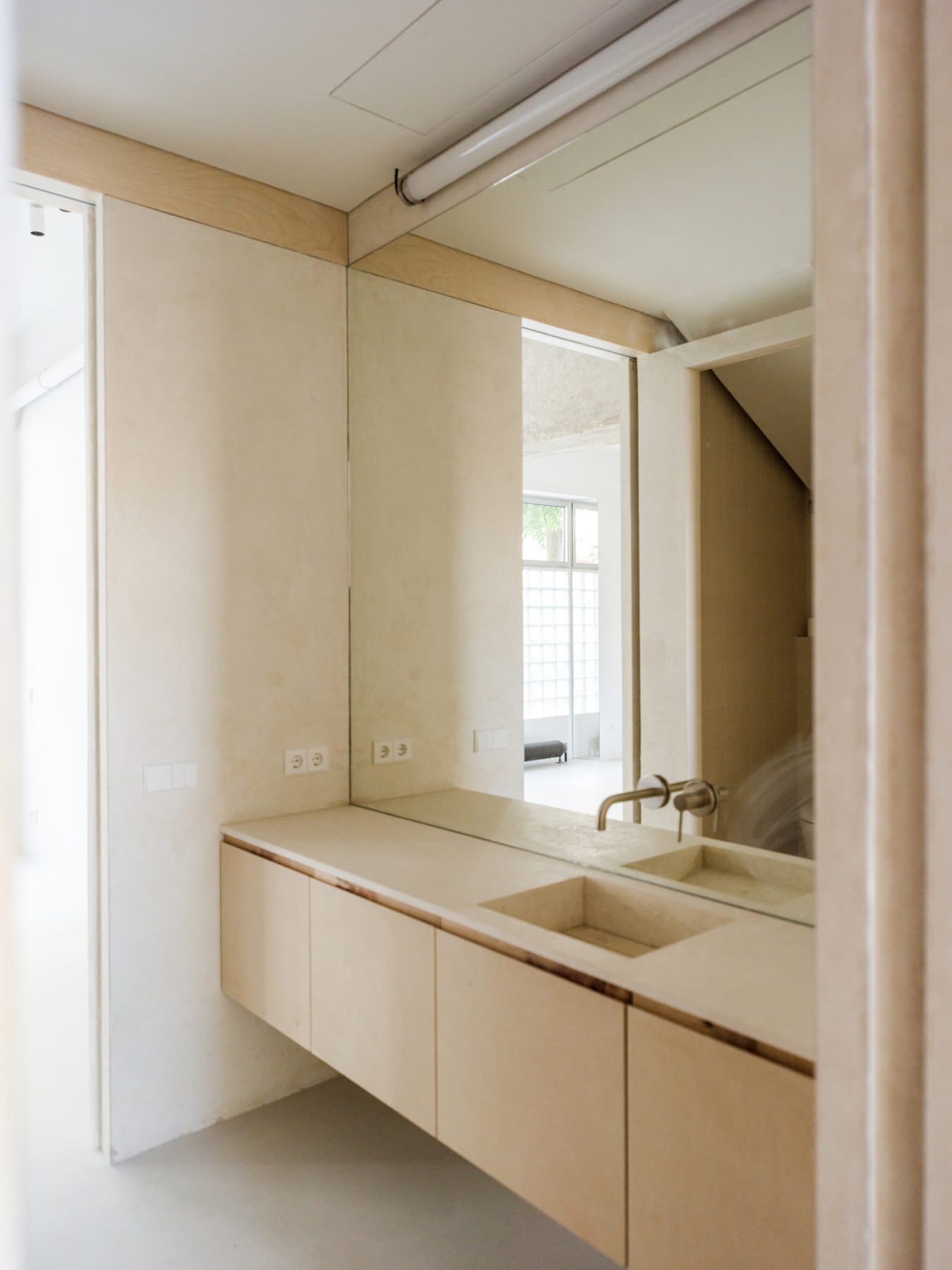 The existing flooring, salvaged and reinstalled, reinforces the overall character of the space, complemented by the solidity of limestone in the bathroom and the sleek stainless steel in the kitchen and railing. The seamless self-levelling mortar floor unifies the space, creating a neutral base that enhances both flow and light, further accentuated by mirrors in the jambs of the glass block windows.