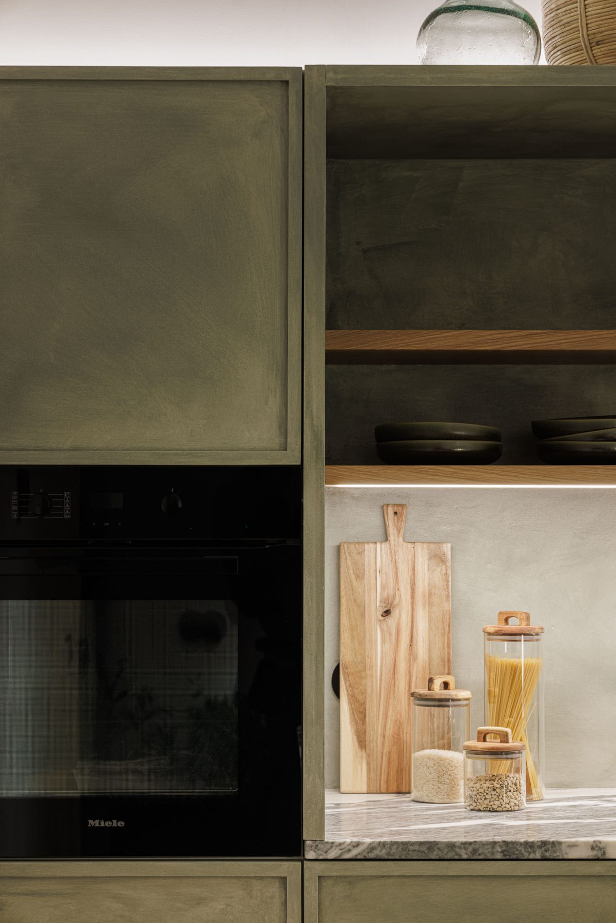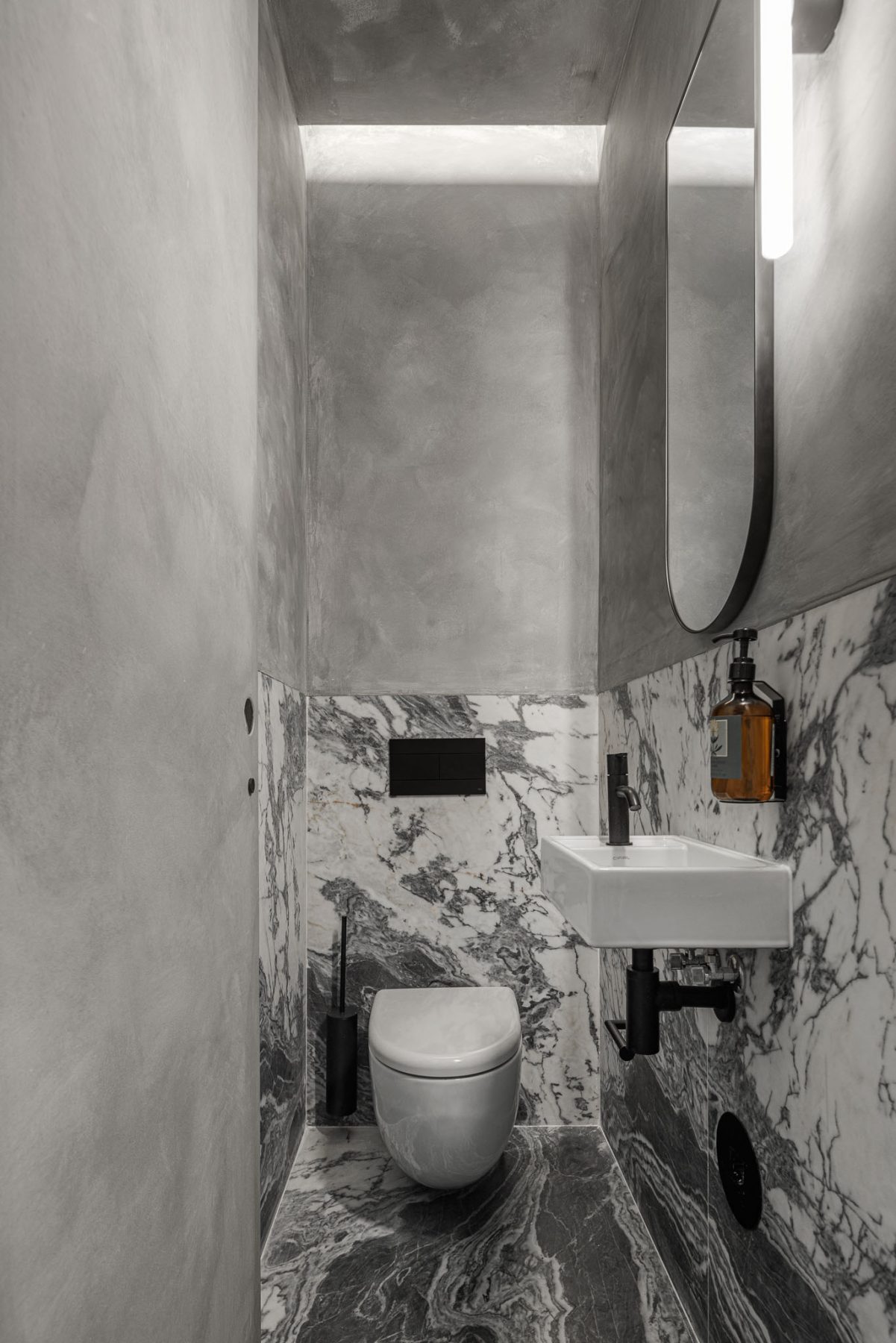 Oak wood, tiger-skin marble, linen textiles, and mineral paints in neutral tones establish a tactile and sensorial environment. Carefully selected lighting and furniture complement these materials, enhancing the tranquil atmosphere and supporting the diverse activities taking place within the space.