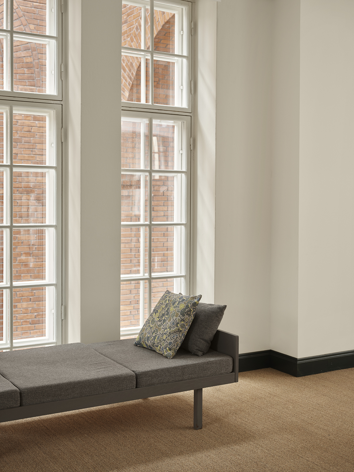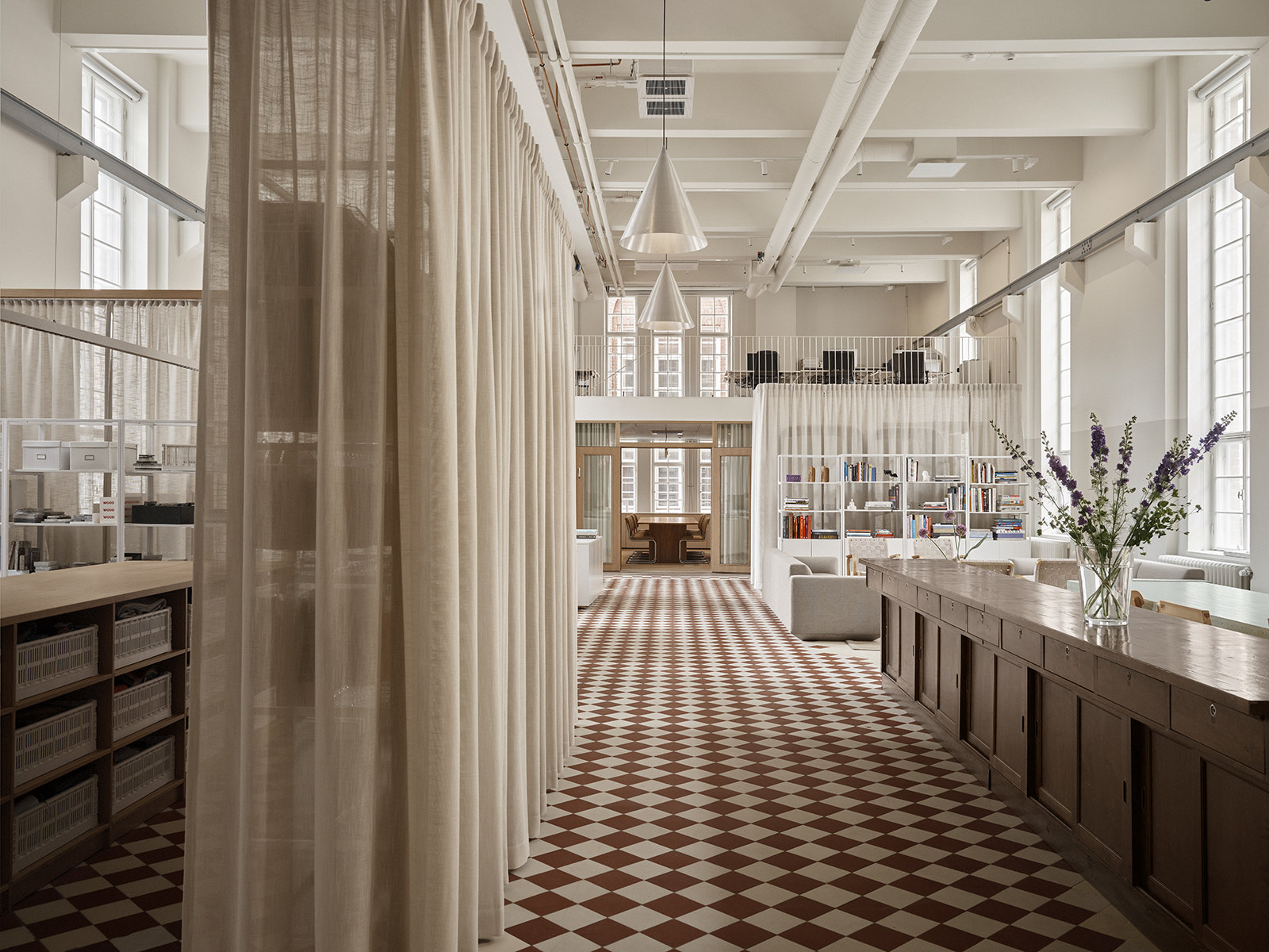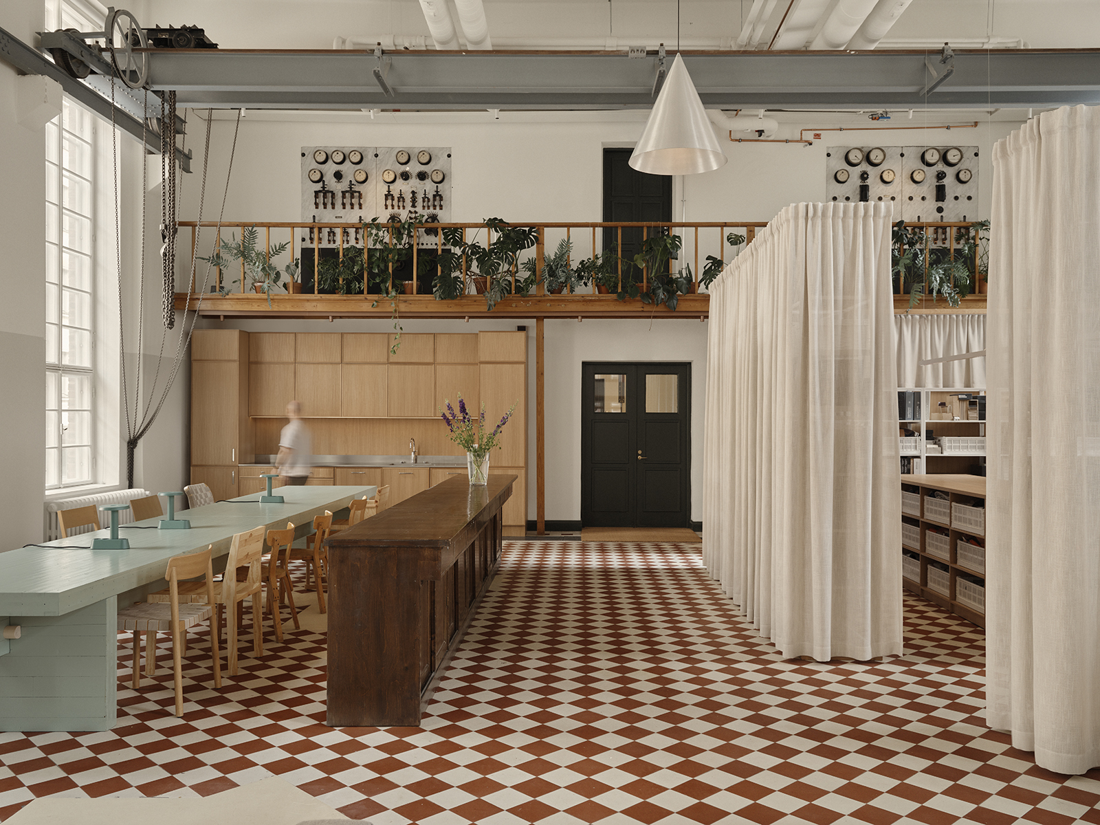 Many original features, from the floors and doors to the skirtings, have been preserved. The shade and style of the wall paint were chosen to match the original, while old technical features, such as cranes, electrical panels, and display cabinets, have been preserved on the premises as reminders of the building’s past as a school.