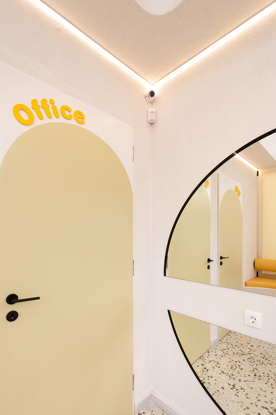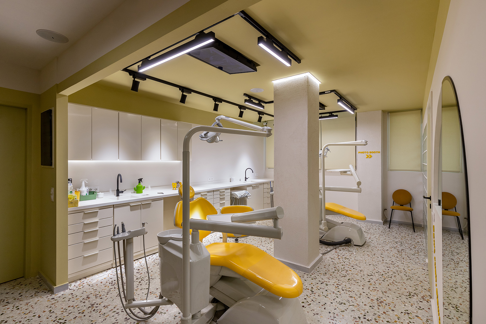 Η εμπειρία ενισχύεται από λεπτομέρειες που κάνουν τη διαφορά: τηλεοράσεις στην οροφή του εξεταστηρίου, καθρέφτες σε σημεία παιχνιδιού, και φωτεινά φινιρίσματα που ενεργοποιούν τις αισθήσεις. Μαύρες πινελιές σε φωτιστικά και χειρολαβές προσδίδουν μοντέρνα ισορροπία.