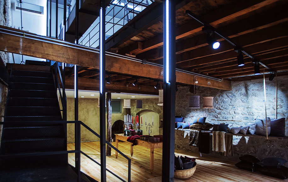The concept of artificial lighting, through LED tape, constitutes the backbone of the project. Firstly, led tape is placed on the frames, stressing the spatial structure while, at the same time, it has been included in the design of the tables and boxes giving emphasis on the exhibited products as well as on the materials and design details of the furniture. LED and fluorine lamps are being hung from the frame structure, thus completing the concept of the linear exhibitional axis.