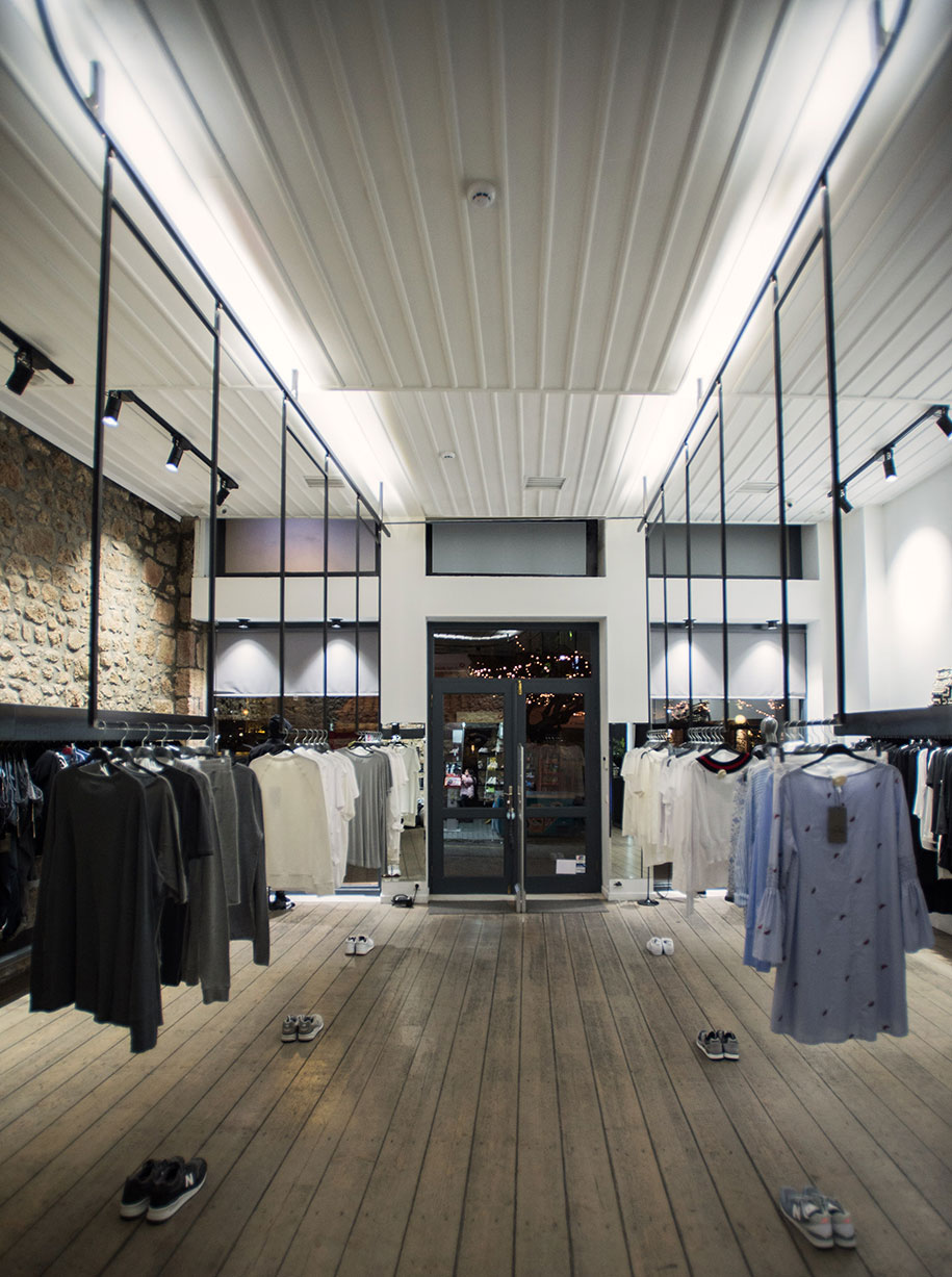 The main interval, opposite the boutique’s entrance, frames the existing masonry wall, facilitating the customers’ move towards the far end. This wall, as well as all the rest of the perimeter walls, bear newly placed steel selves, enhancing a sense of continuity and enclosure. The latter is accentuated by the shape of the roof structure. The roof is an arc emitting diffused light which guides the costumers’ footsteps as they stroll around the virtual geometry generated by the hangers.