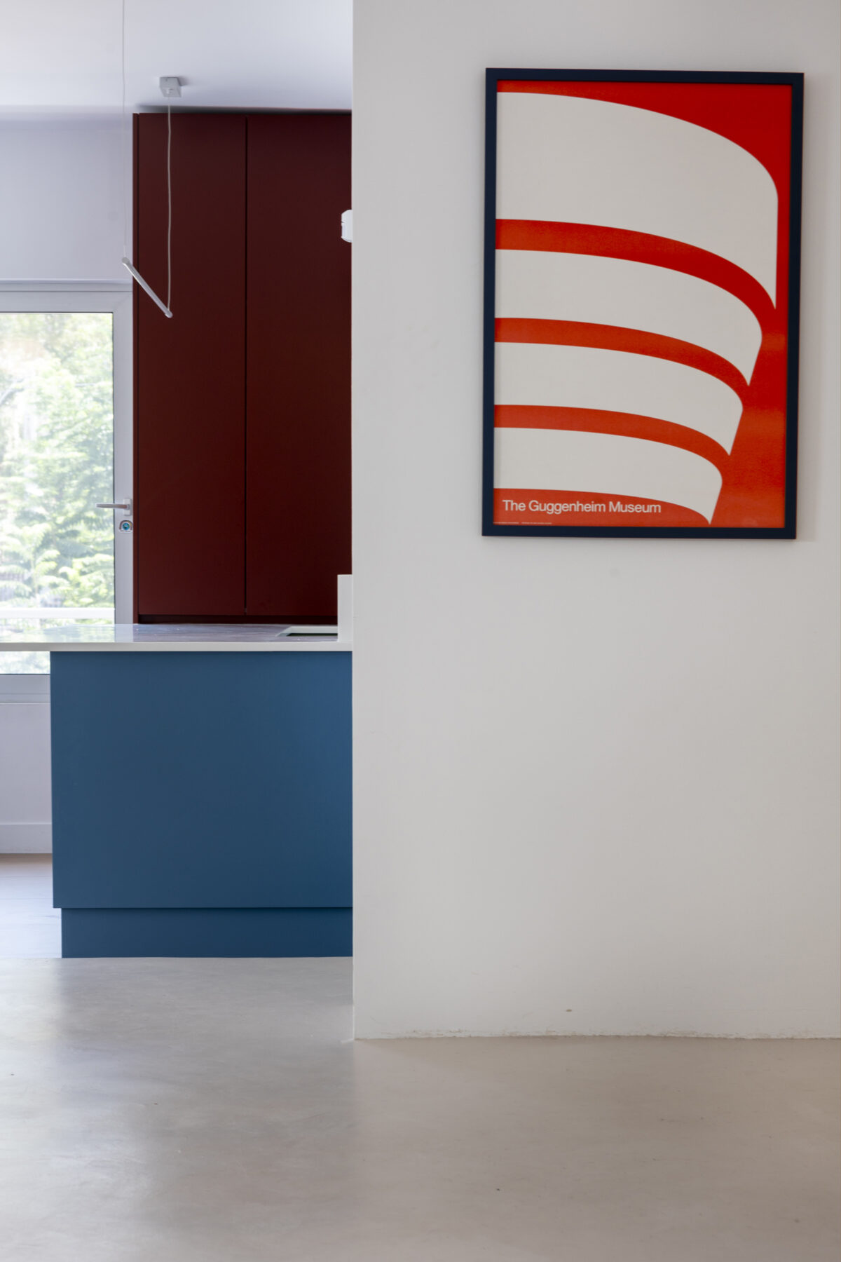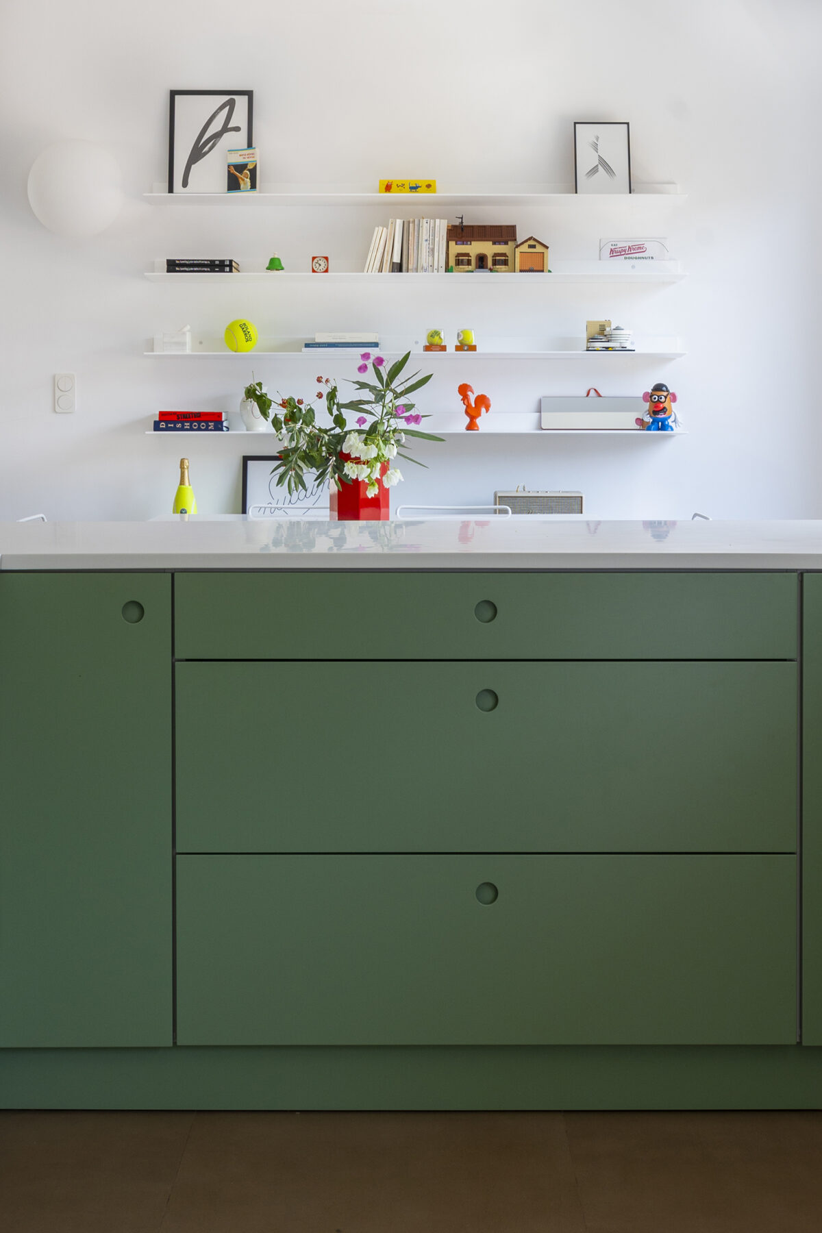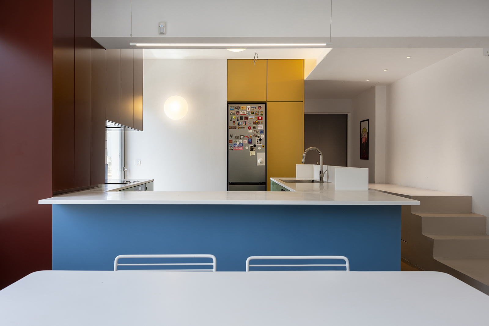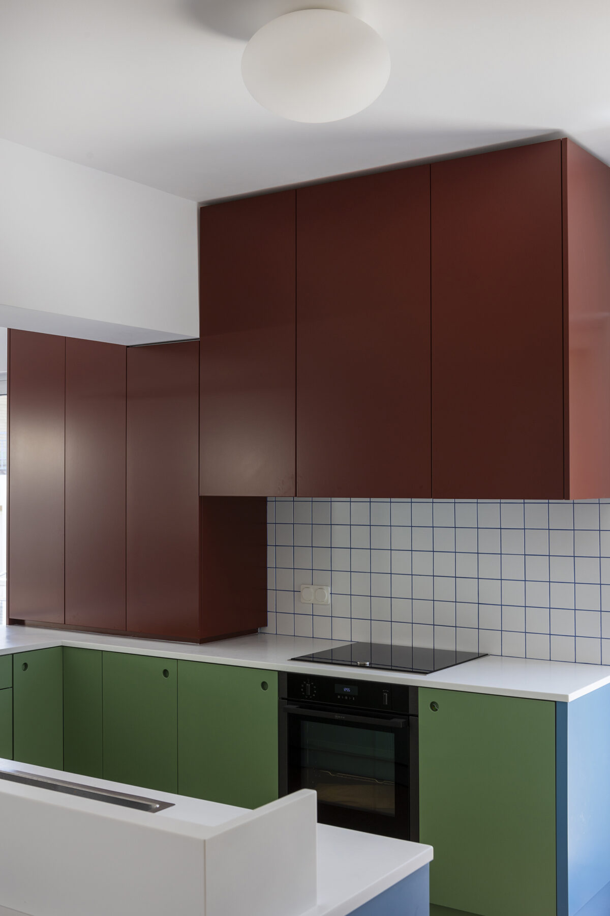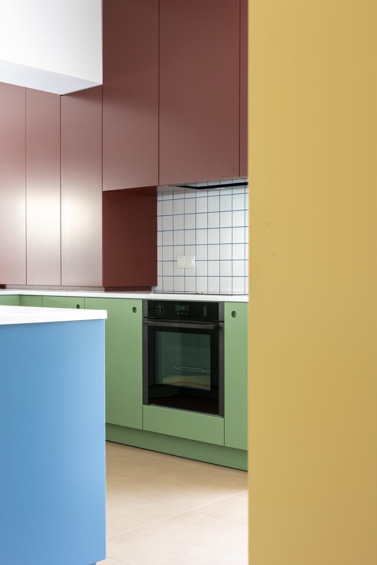 At the apartment’s core lies the vibrant open kitchen. Radiating a sense of playfulness, its multi-colored fronts enliven the living space.