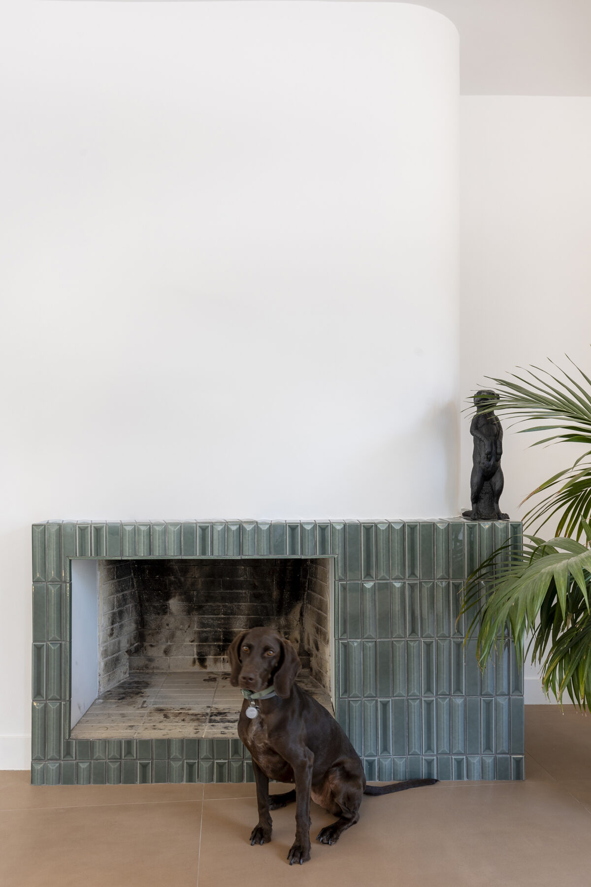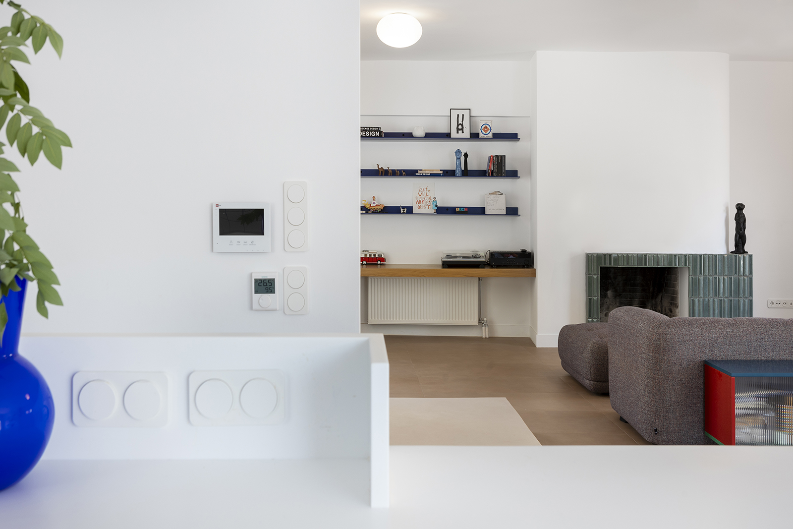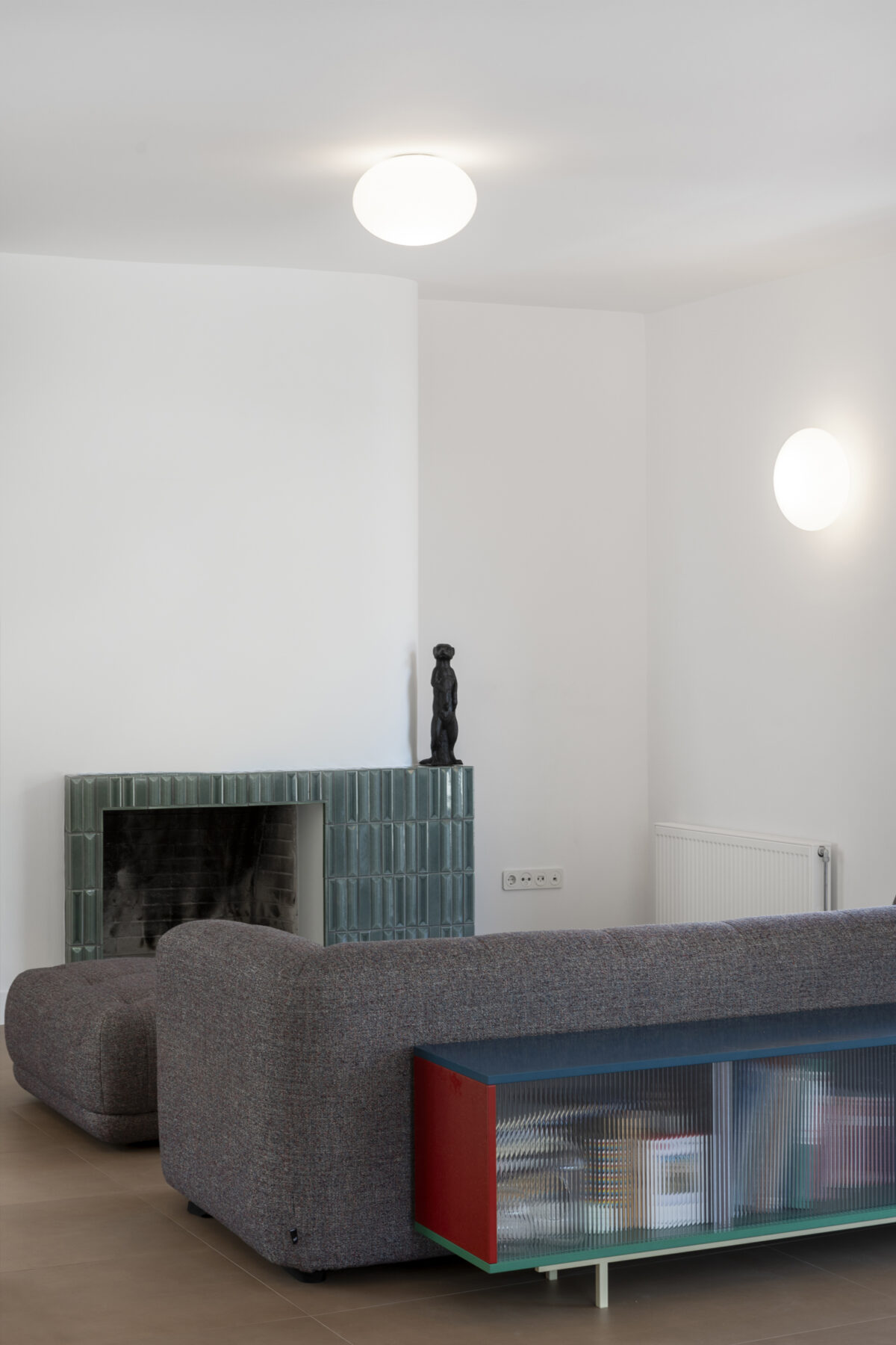 To ensure a harmonious and earthy ambiance, the flooring showcases expansive tiles in a subtle terracotta hue. This choice not only resonates with the vivid kitchen but also contributes to the apartment’s cozy atmosphere. Additionally, to tackle the existing variations in floor elevation, a new cement-covered floor in a matching shade ensures a smooth and uninterrupted transition throughout the living space.