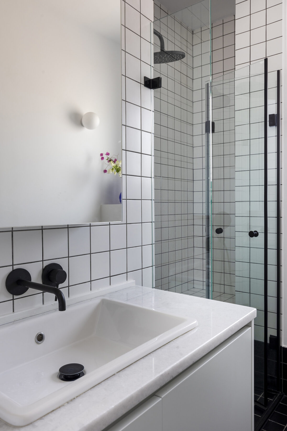 In a deliberate deviation from the apartment’s chromatic theme, the bathroom adopts a stark “monochrome” palette. Dominated by matte black and white tones, this space is curated to provide a serene oasis, offering a counterpoint to the lively vibrancy of the main living zones.