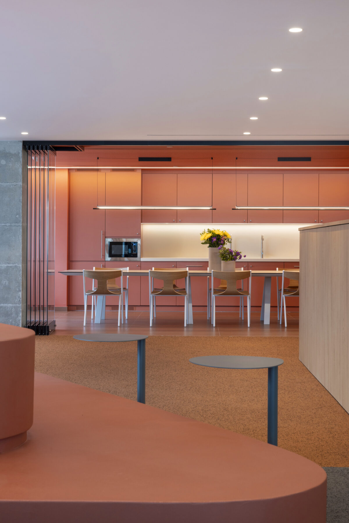 Στο ανατολικό άκρο του κεντρικού άξονα βρίσκονται οι χώροι εκτόνωσης – μεγάλες χρωματιστές κερκίδες που ευνοούν την πιο casual συνεργασία, η μεγάλη κοινόχρηστη τραπεζαρία σε μονοχρωματική τονικότητα και μία κατάφυτη, προσβάσιμη βεράντα.