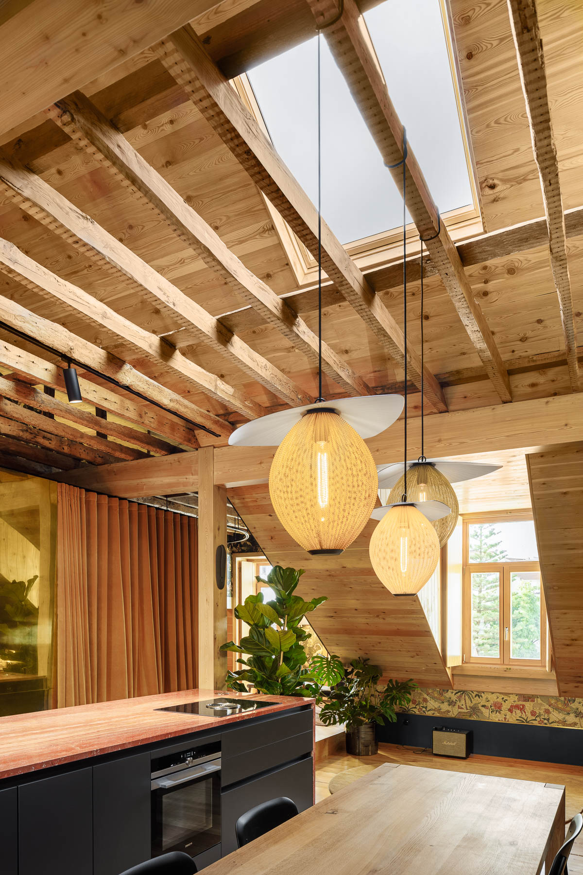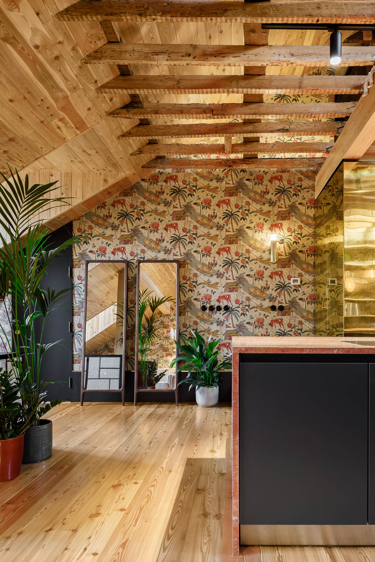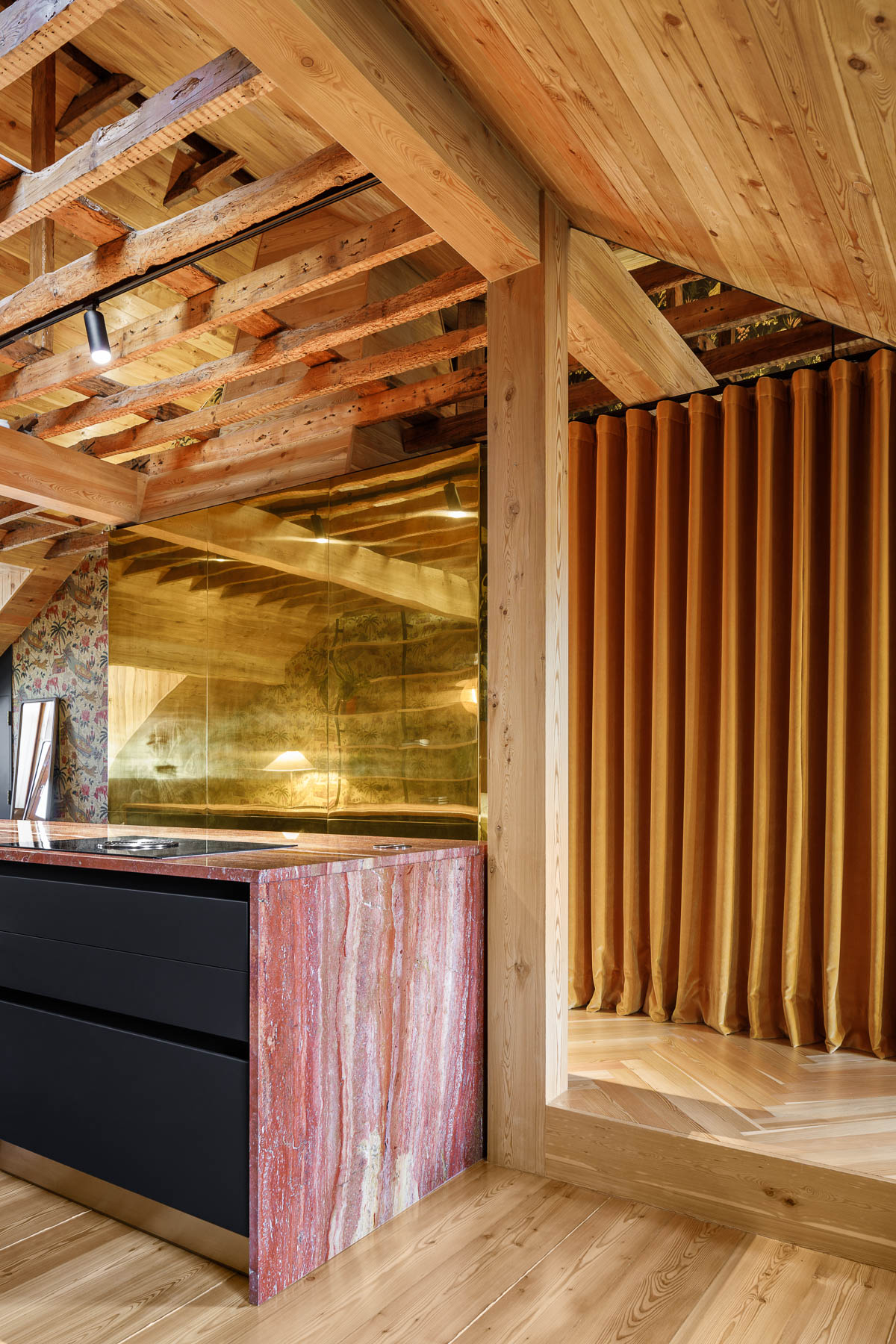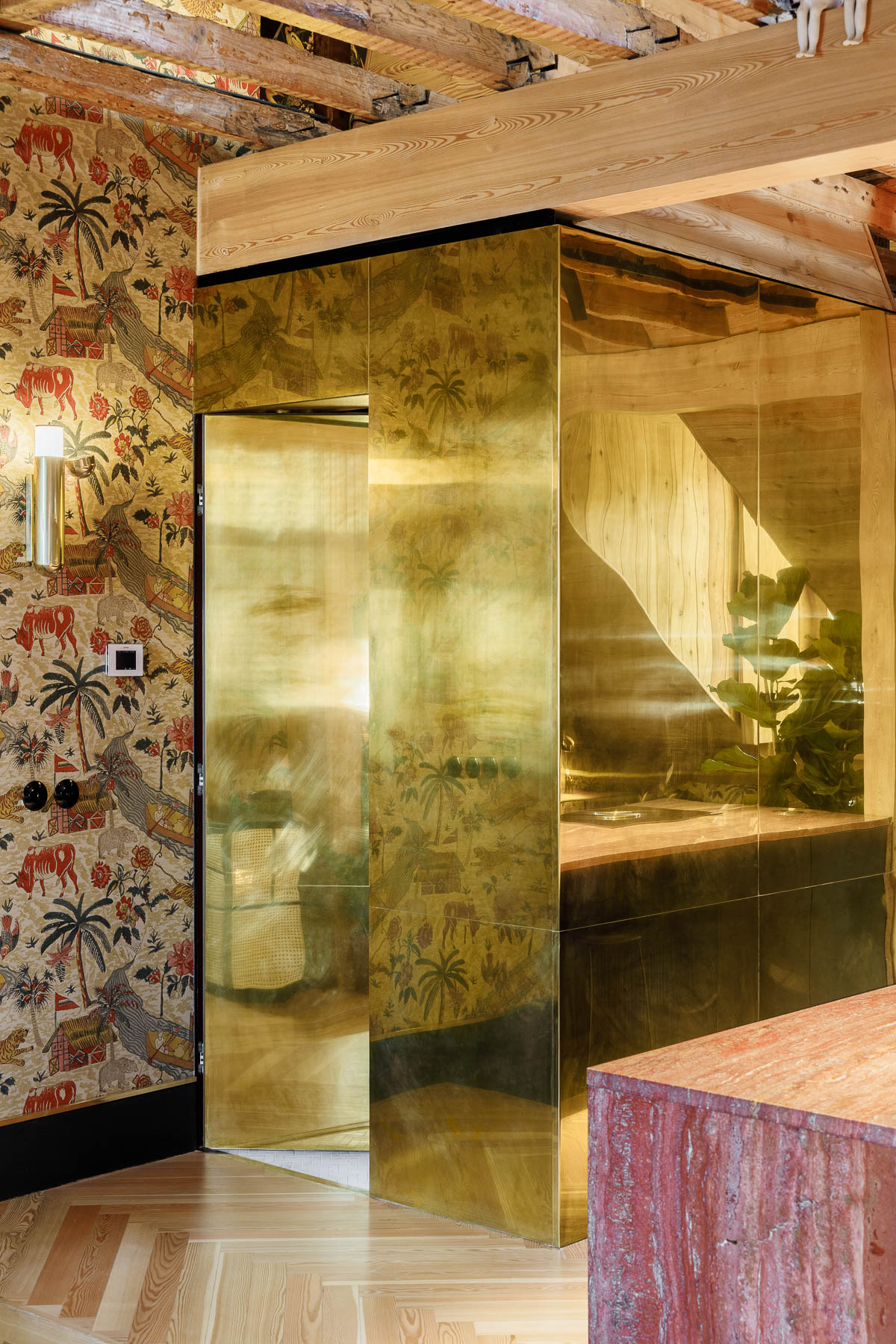 The closed kitchen space is abandoned and a large kitchen countertop and dining room are defined in the central space with a greater ceiling height. The relocation of the bathroom to the interior of the apartment makes it possible to free all the windows to the central space. This bathroom becomes the only interior space of the house, in which a light tunnel with skylight is introduced. This new interior and central volume stand out from the attic as it is covered in polished brass, reflecting the spaces around it.