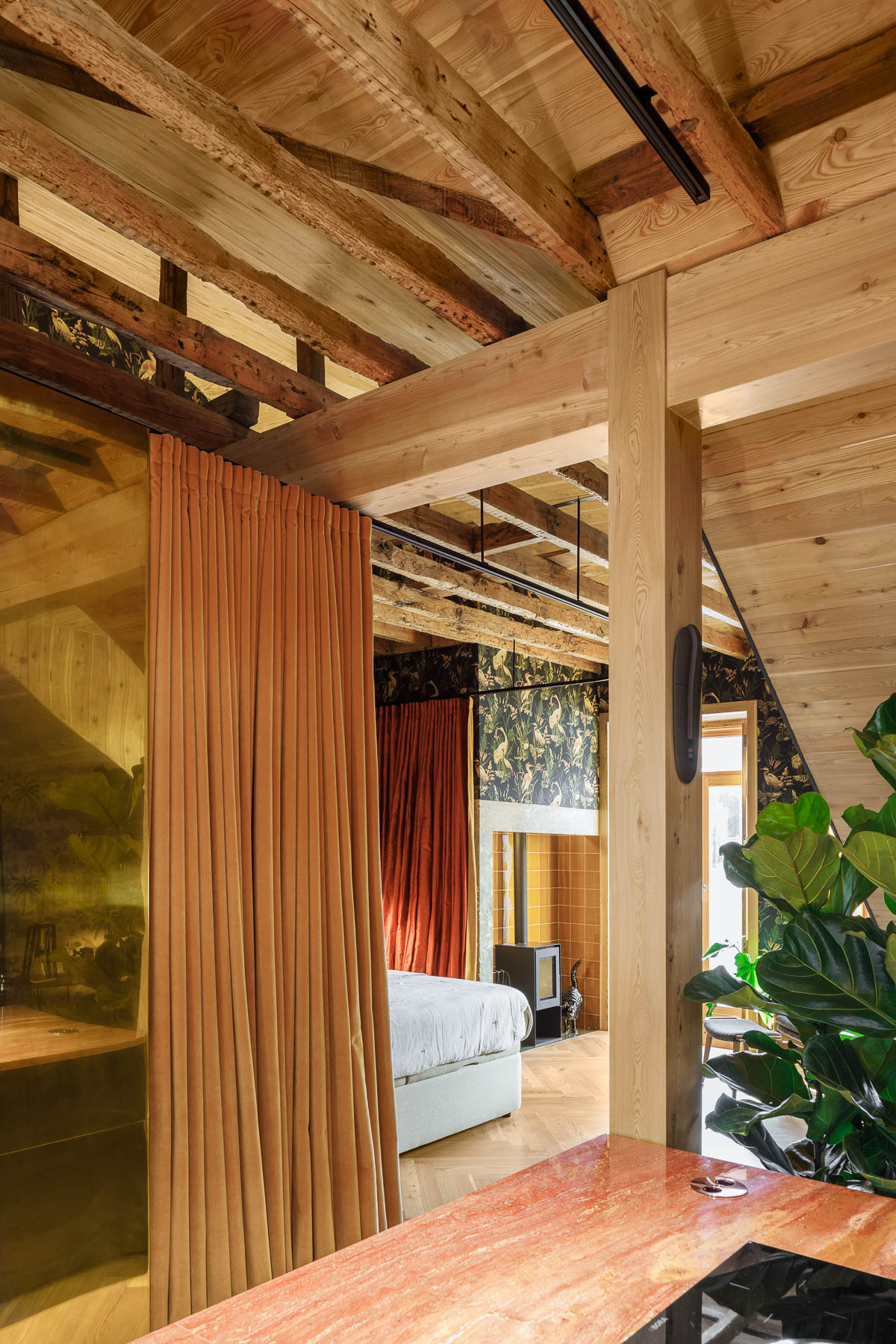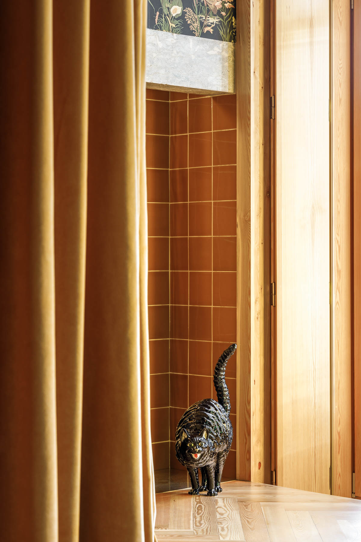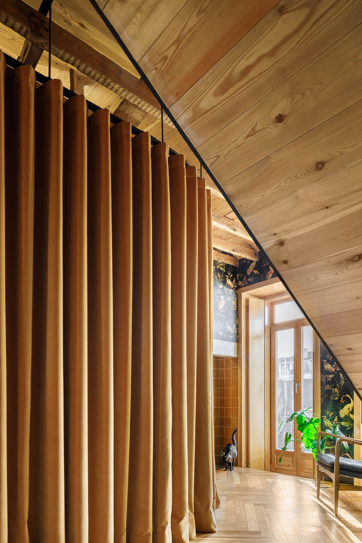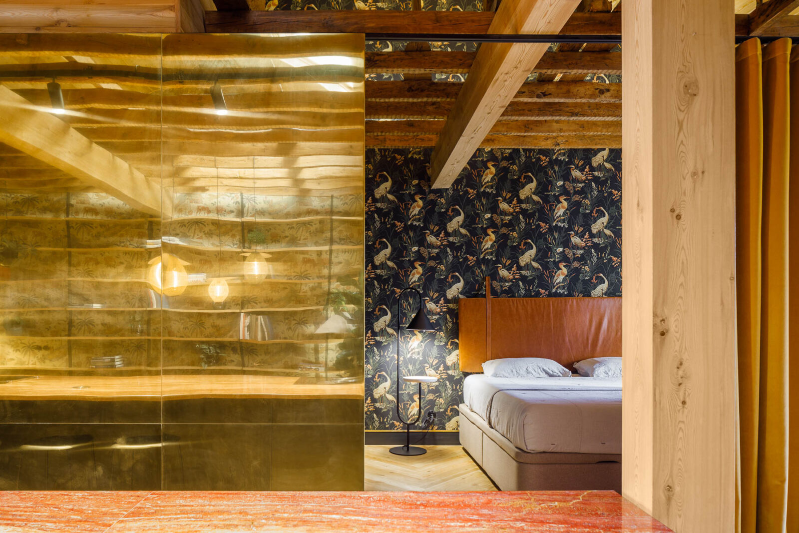 The informal bedroom space relates to the others in the house and can be opened or closed through a scenic element – a golden velvet and silk curtain – that runs along the extension of the brass wall. The wallpaper introduces a rich chromatic palette, which spreads to the ceramic tiles of the old chimney and bathroom walls and to the kitchen countertop stone. Furniture, lamps, rugs and the plants were carefully selected as an extension of the architectural project narrative.
