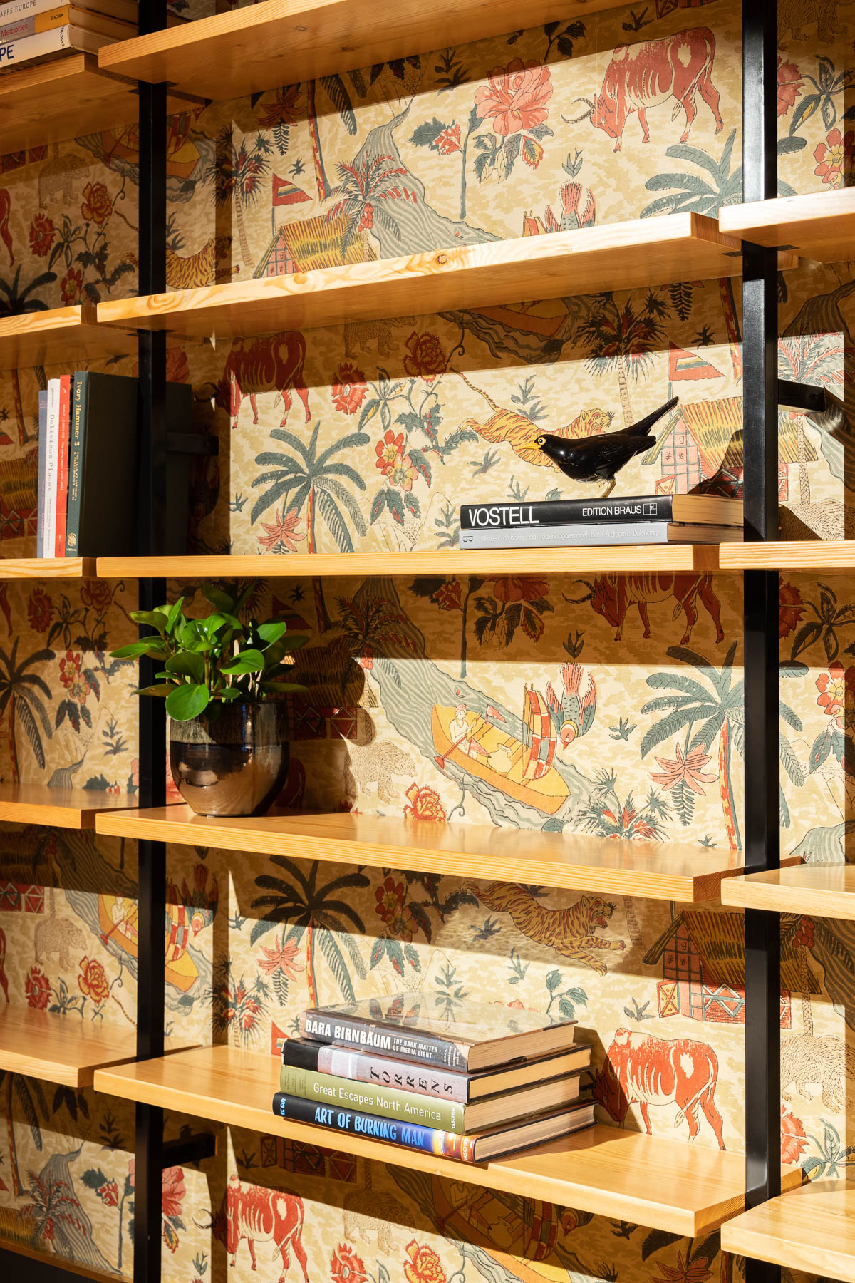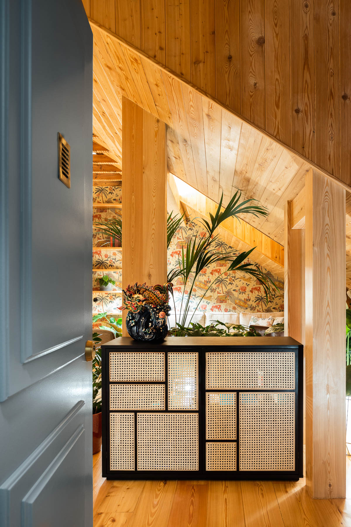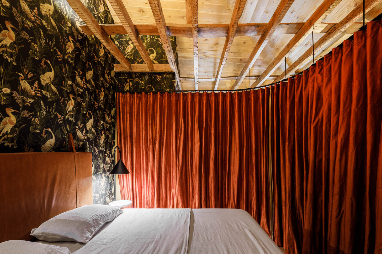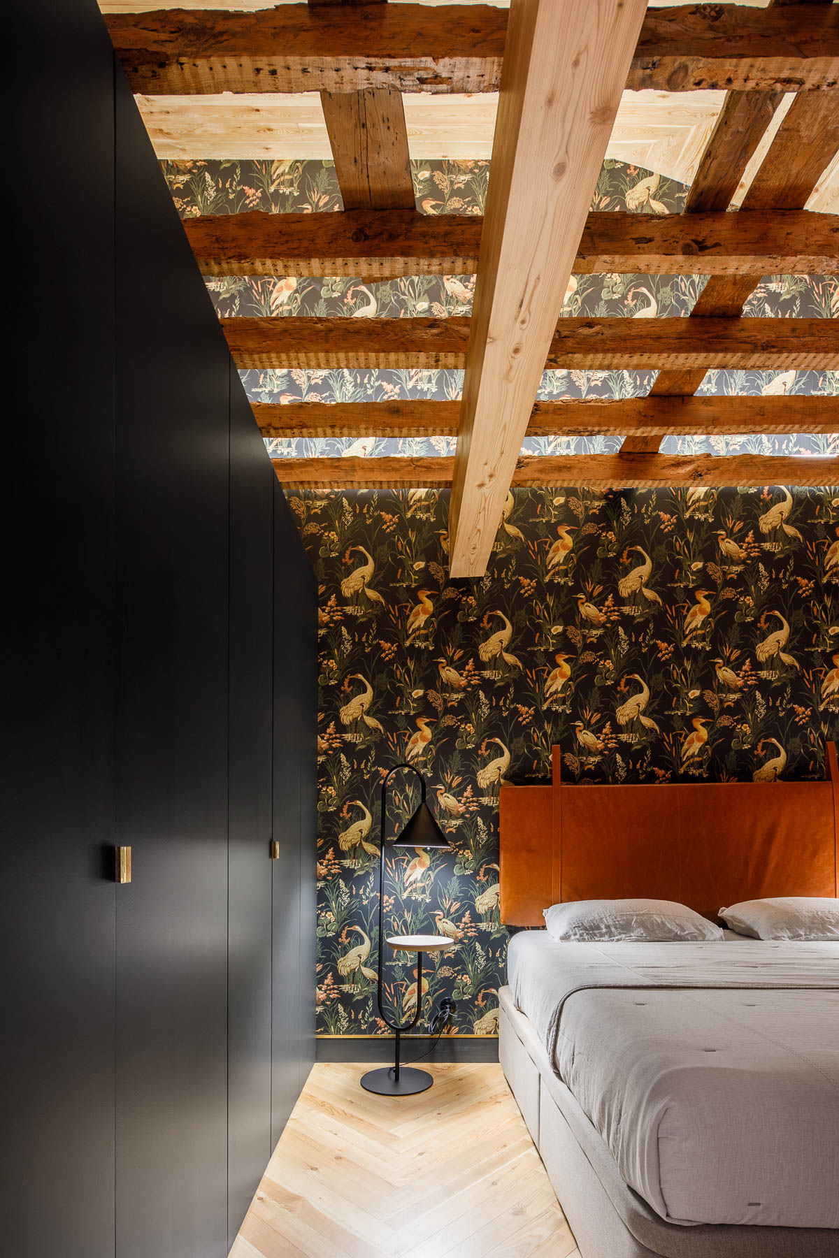The informal bedroom space relates to the others in the house and can be opened or closed through a scenic element – a golden velvet and silk curtain – that runs along the extension of the brass wall. The wallpaper introduces a rich chromatic palette, which spreads to the ceramic tiles of the old chimney and bathroom walls and to the kitchen countertop stone. Furniture, lamps, rugs and the plants were carefully selected as an extension of the architectural project narrative.