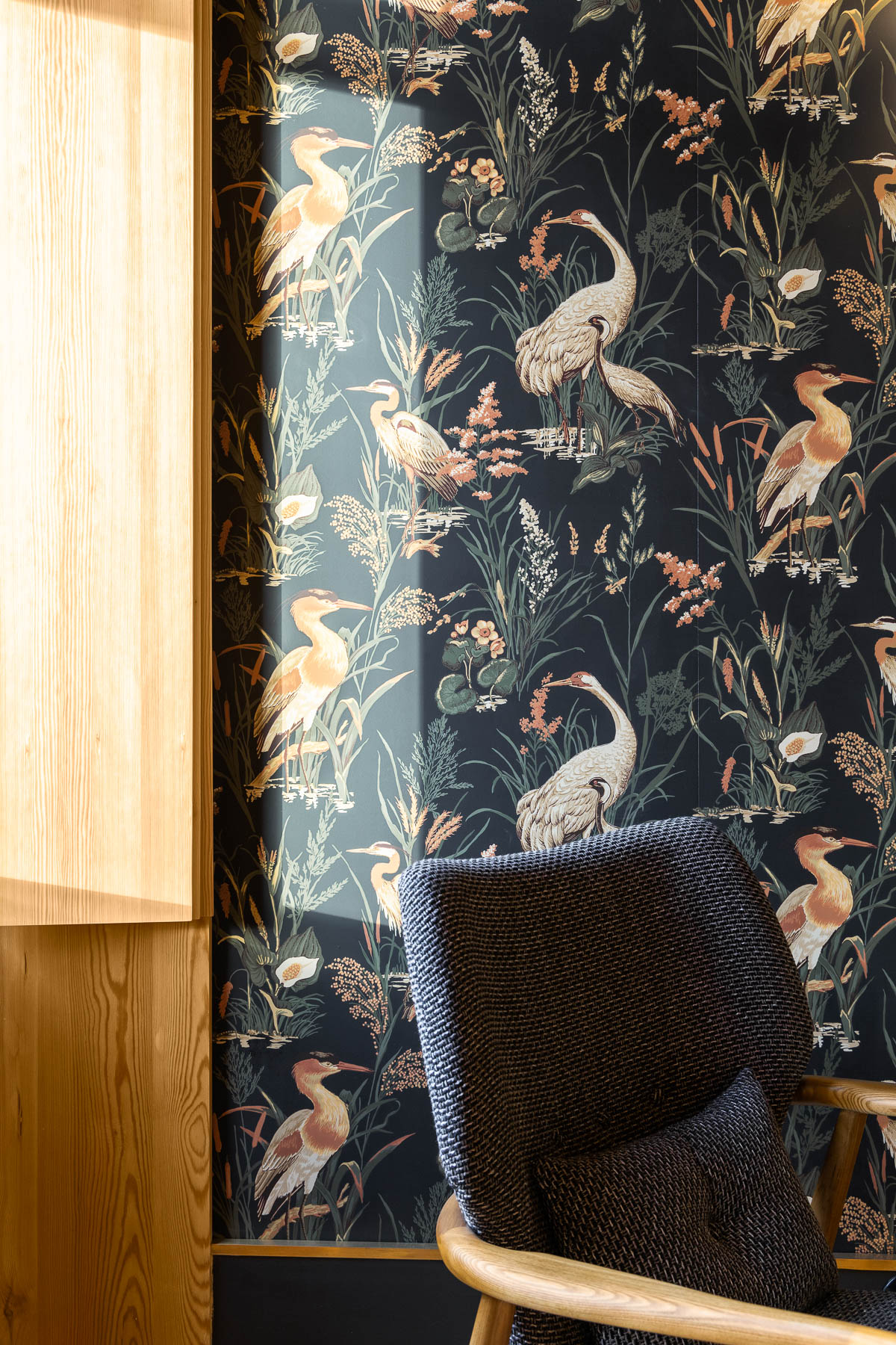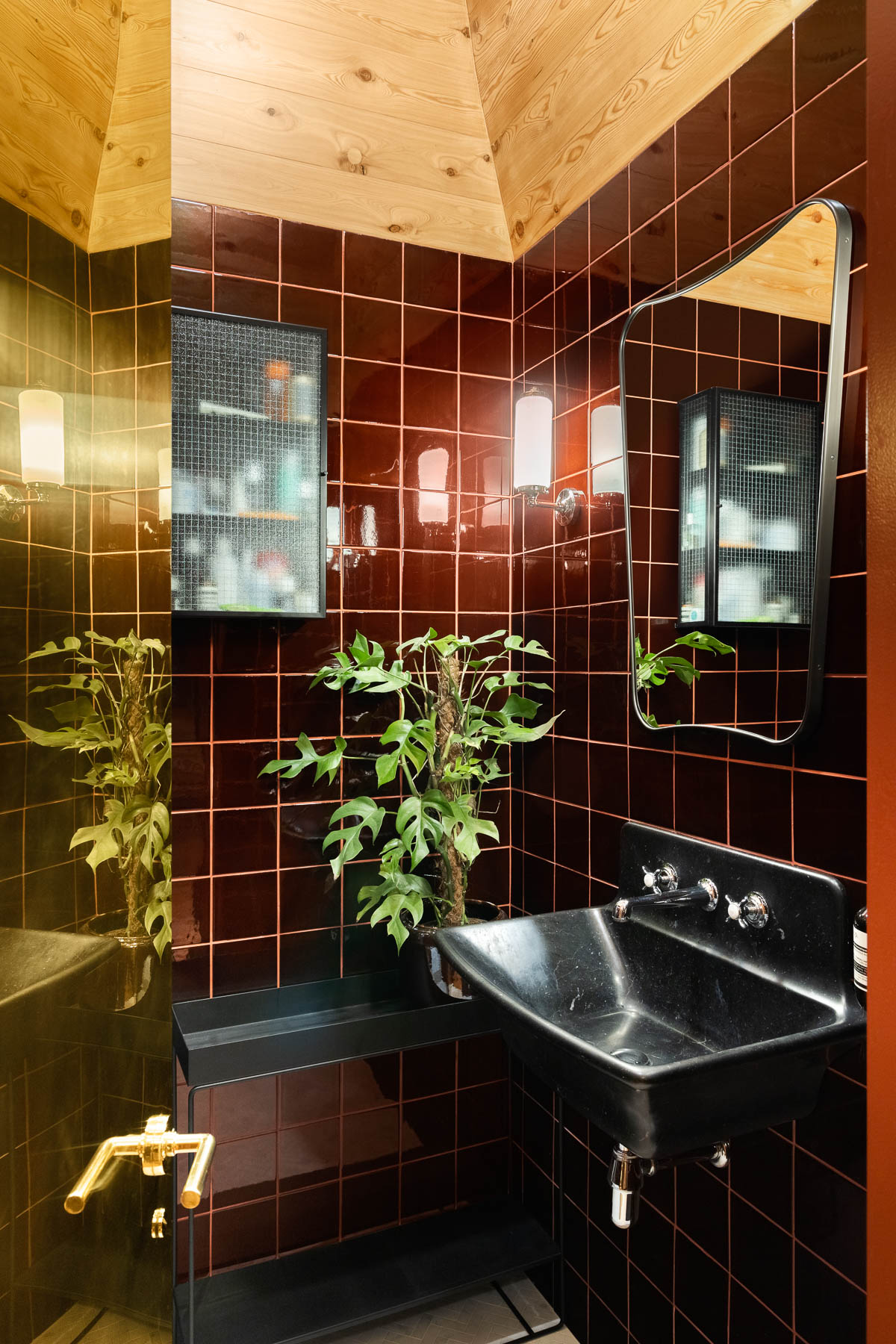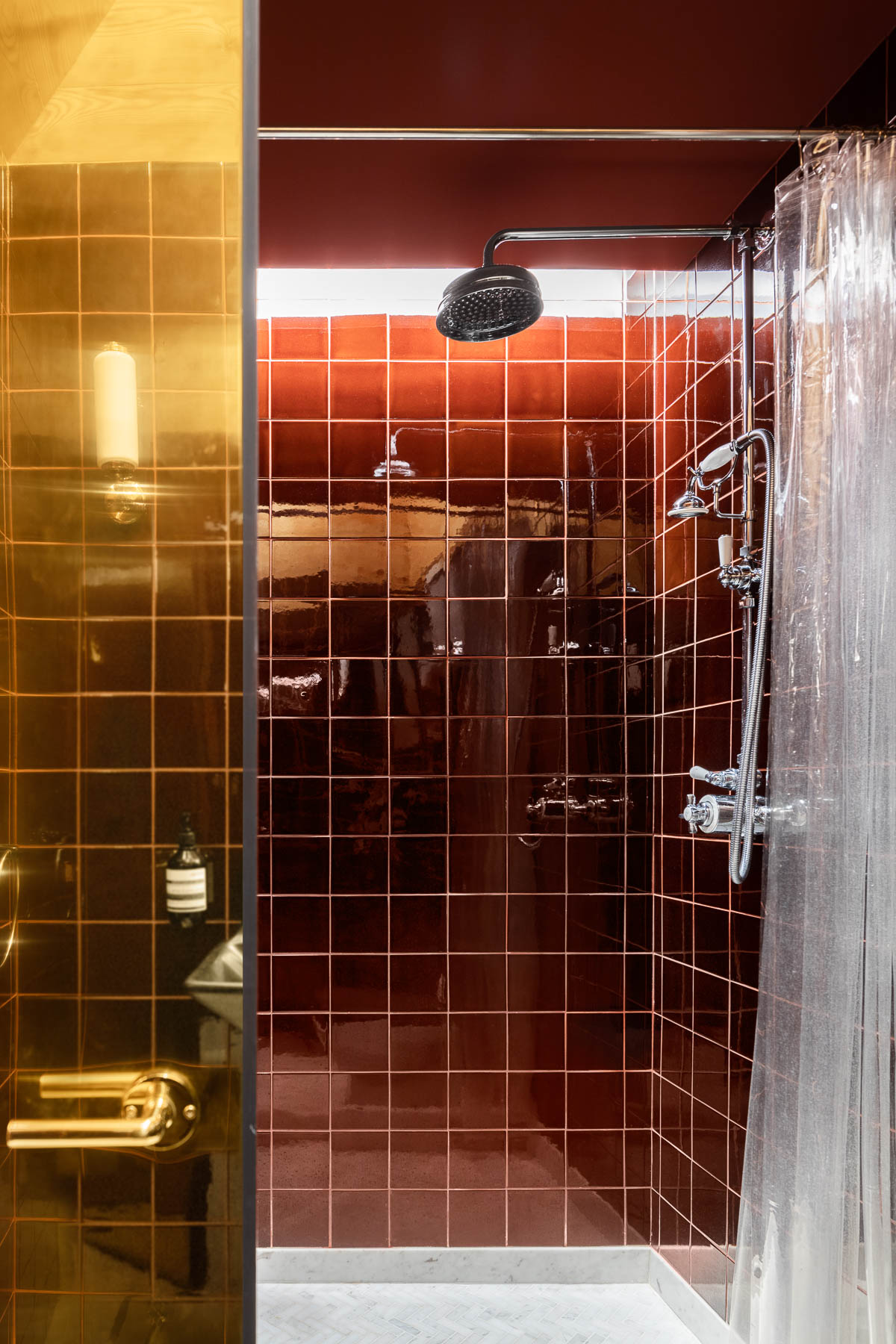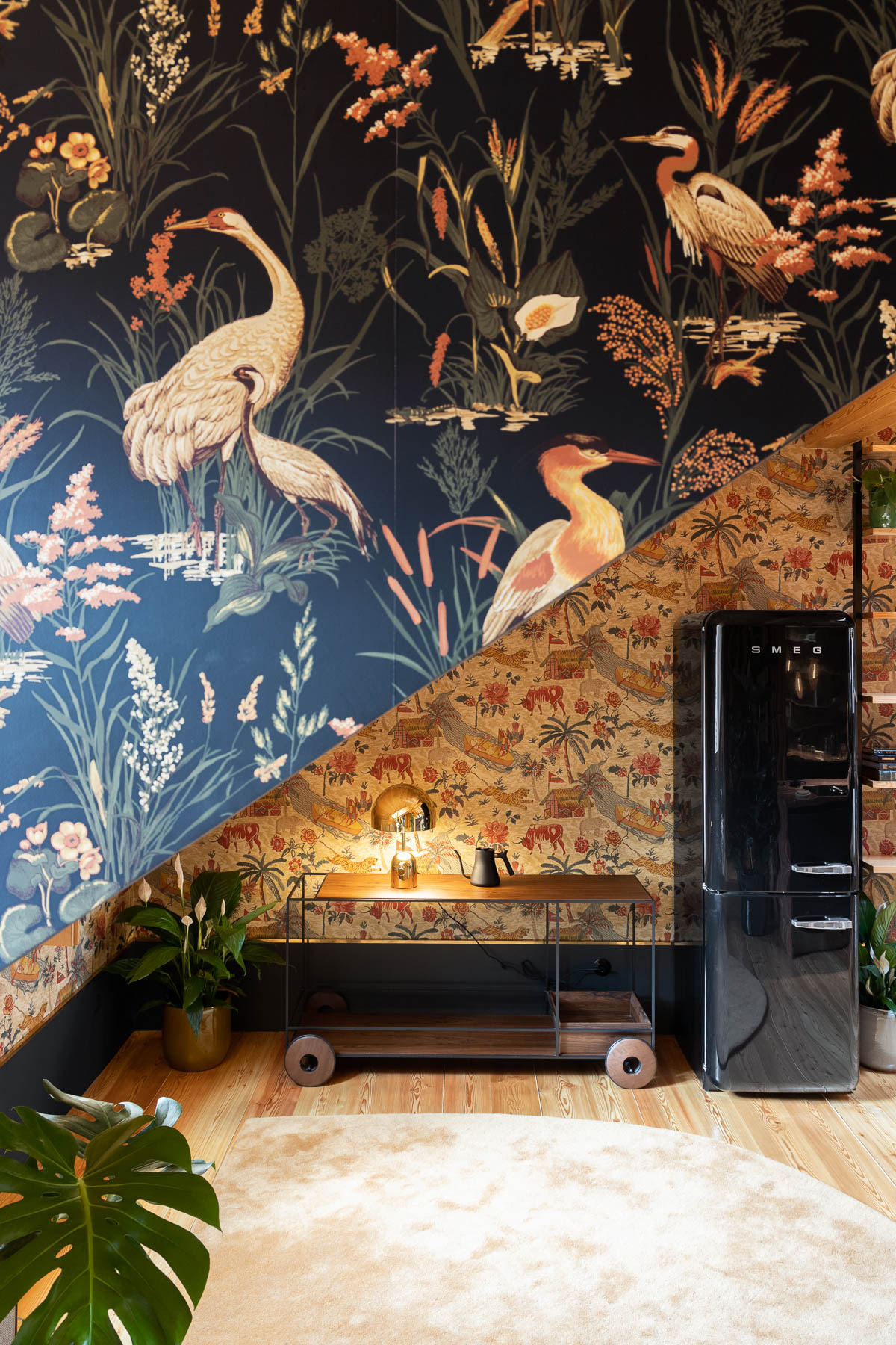 The informal bedroom space relates to the others in the house and can be opened or closed through a scenic element – a golden velvet and silk curtain – that runs along the extension of the brass wall. The wallpaper introduces a rich chromatic palette, which spreads to the ceramic tiles of the old chimney and bathroom walls and to the kitchen countertop stone. Furniture, lamps, rugs and the plants were carefully selected as an extension of the architectural project narrative.