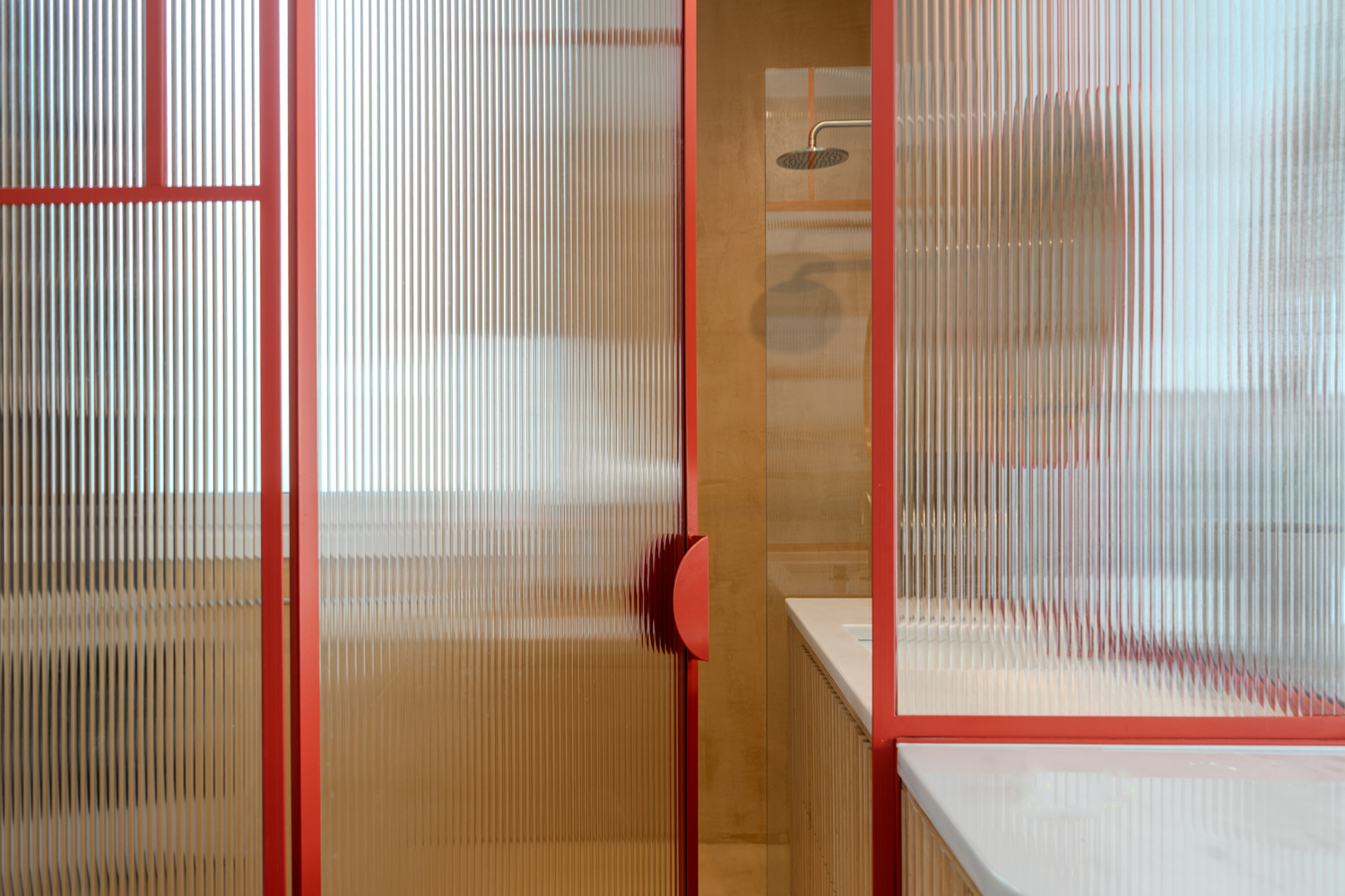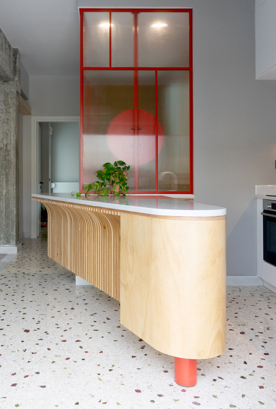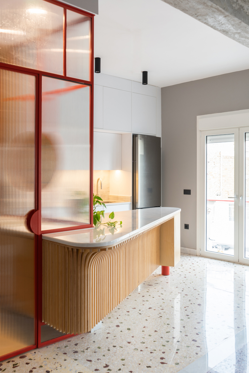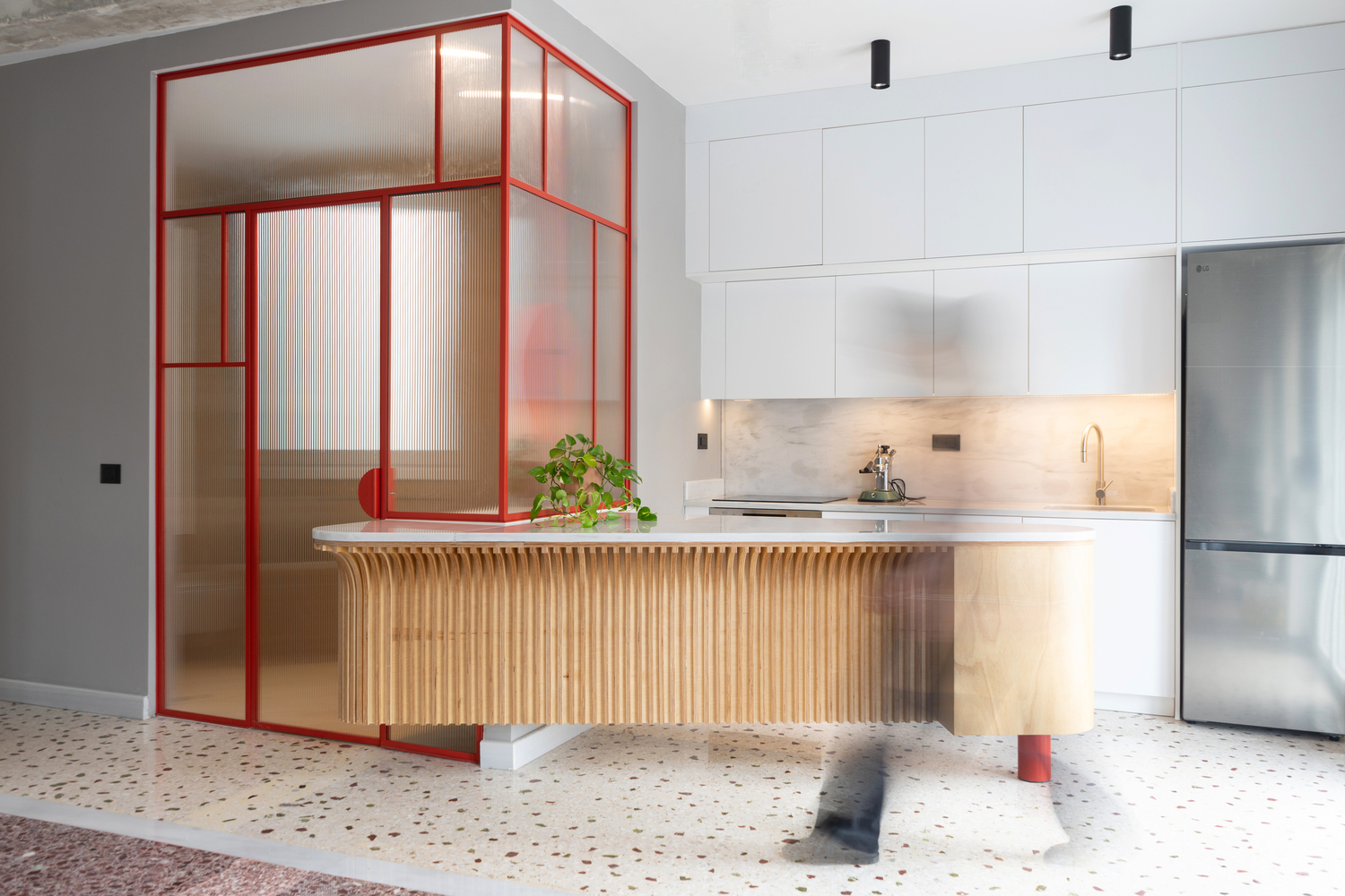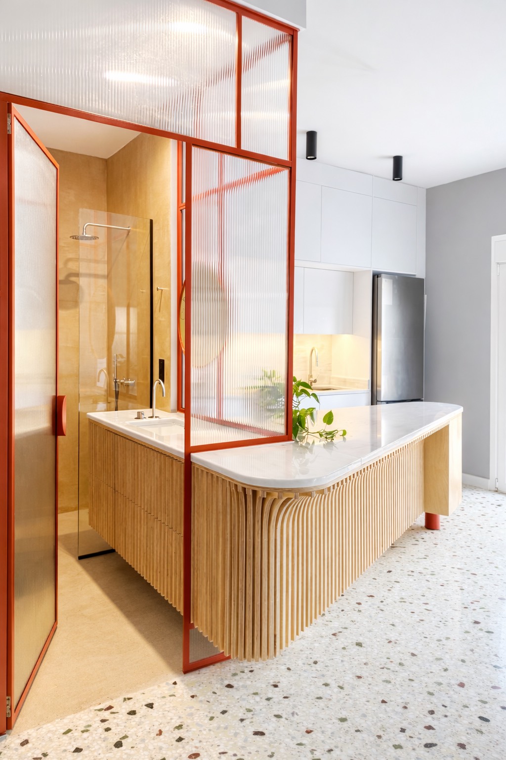 A key feature of the design is the triangular plywood kitchen island, clad in marble, which appears to float above the mosaic floor. Its bold geometry acts as both a spatial and visual focal point, while its design logic extends into the bathroom, where it transforms into a washbasin. Through this gesture, a morphological continuity is established, blurring the boundaries between spaces. The use of fluted glass in the bathroom allows natural light to diffuse through, further enhancing the sense of spatial unity.