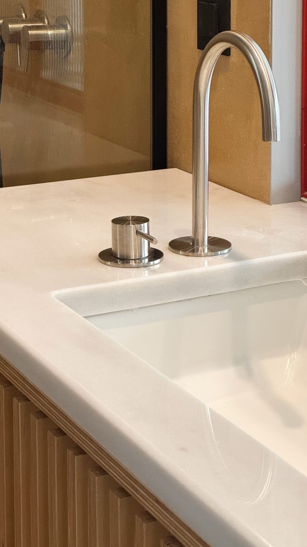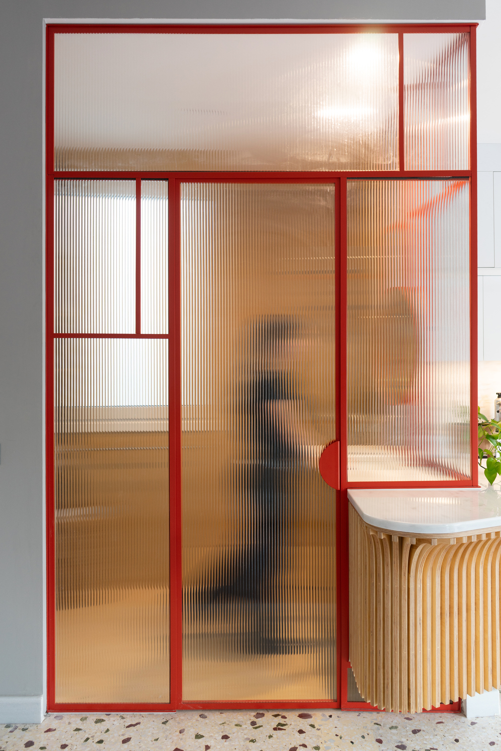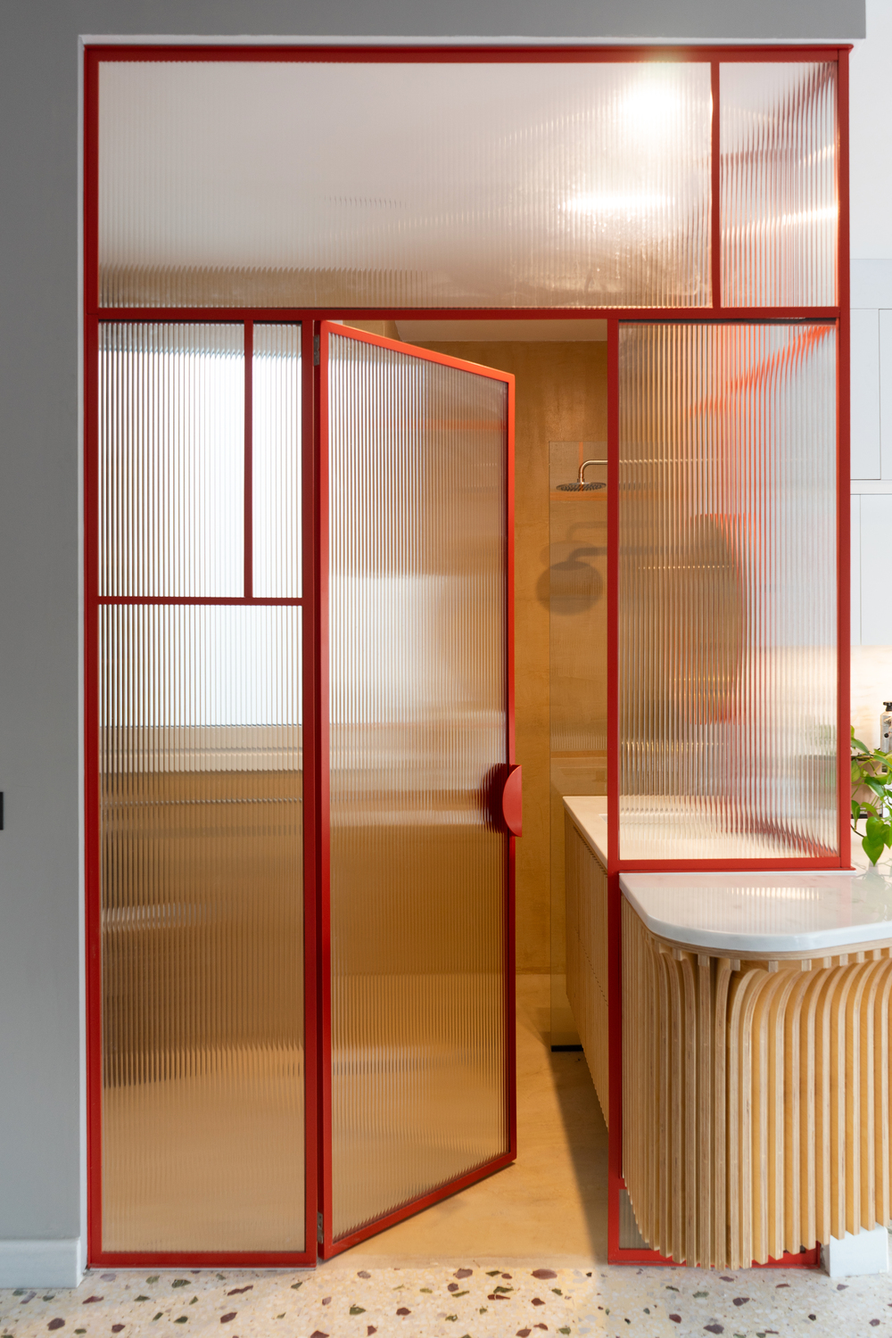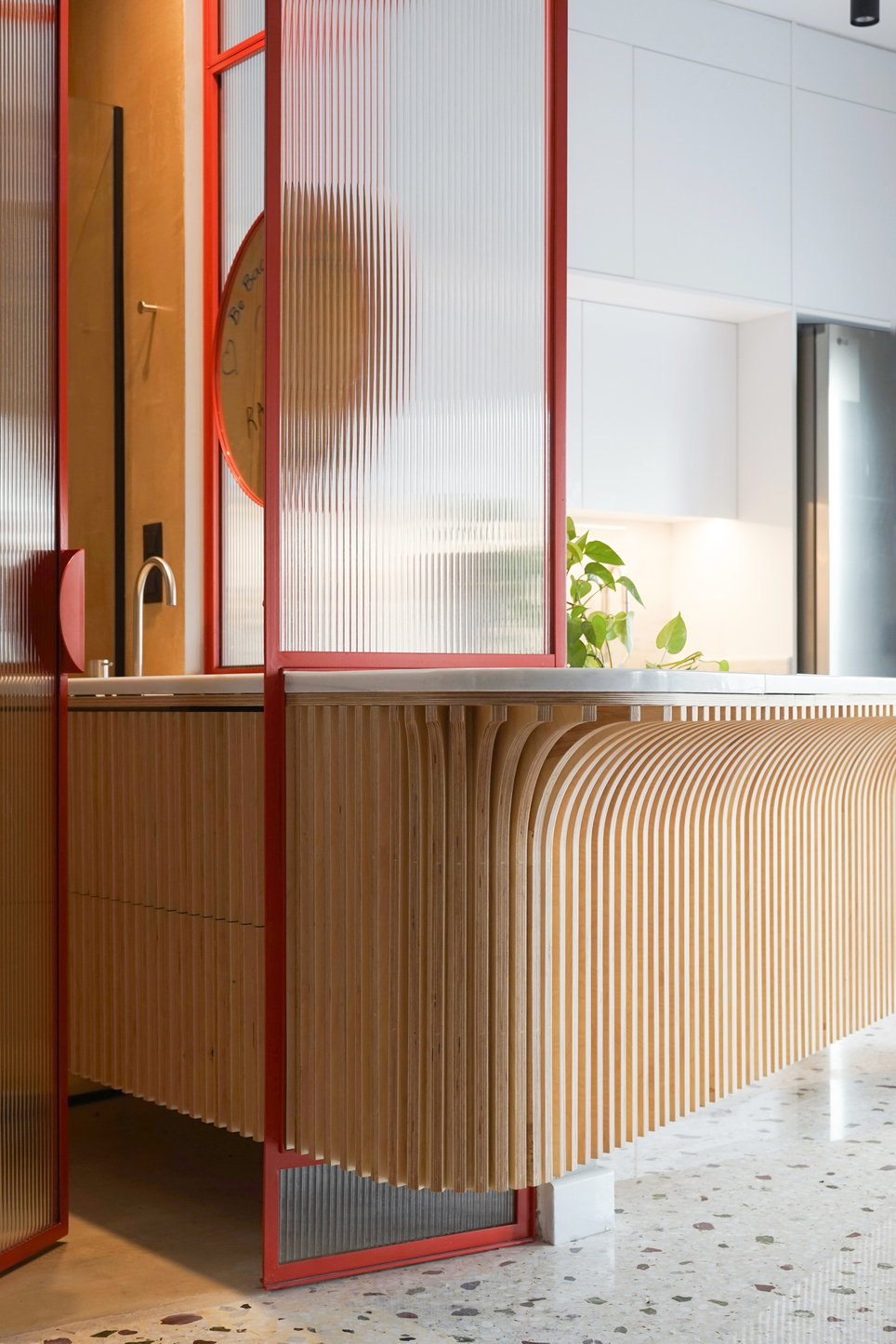 A key feature of the design is the triangular plywood kitchen island, clad in marble, which appears to float above the mosaic floor. Its bold geometry acts as both a spatial and visual focal point, while its design logic extends into the bathroom, where it transforms into a washbasin. Through this gesture, a morphological continuity is established, blurring the boundaries between spaces. The use of fluted glass in the bathroom allows natural light to diffuse through, further enhancing the sense of spatial unity.