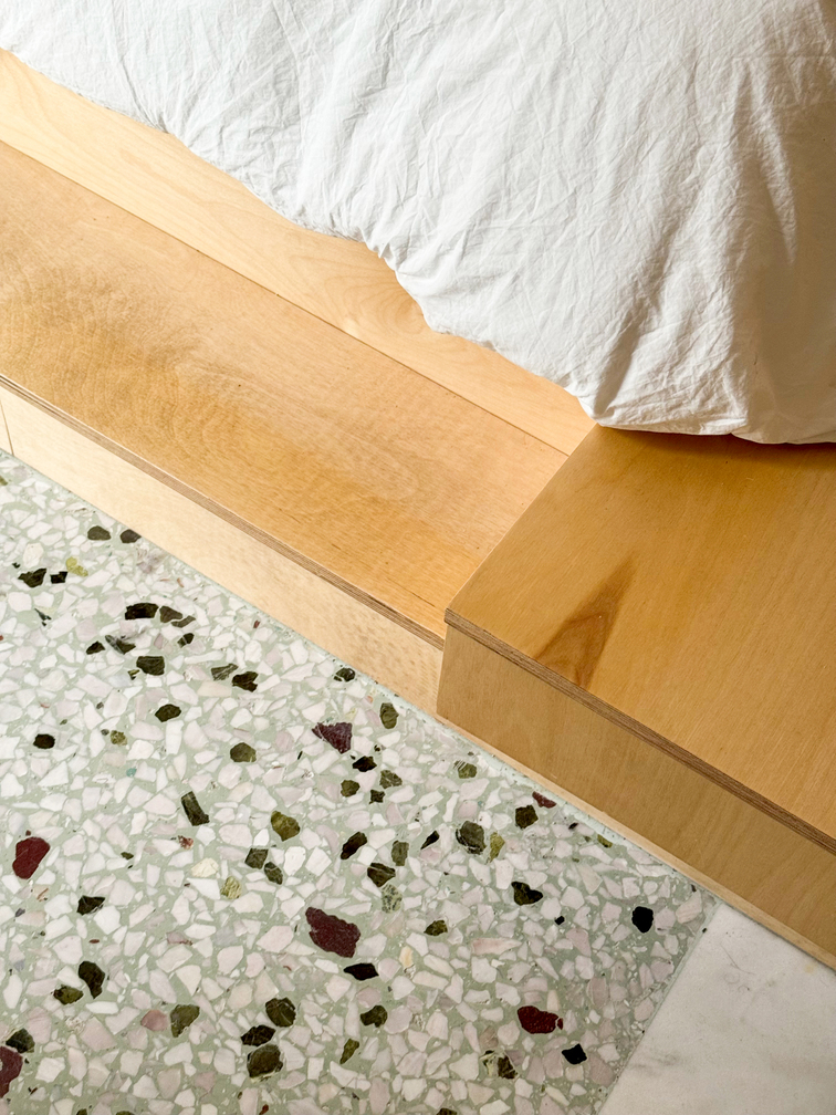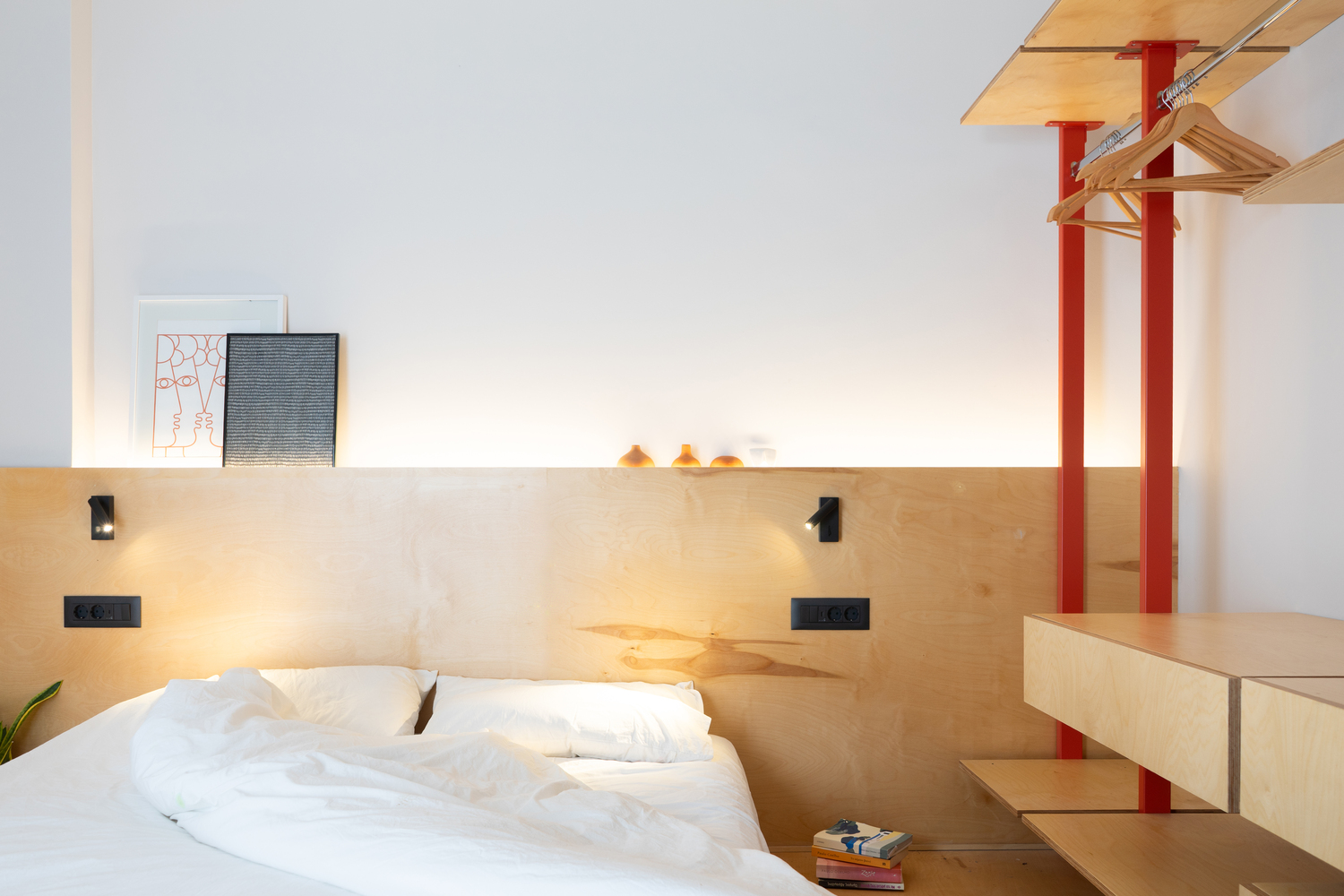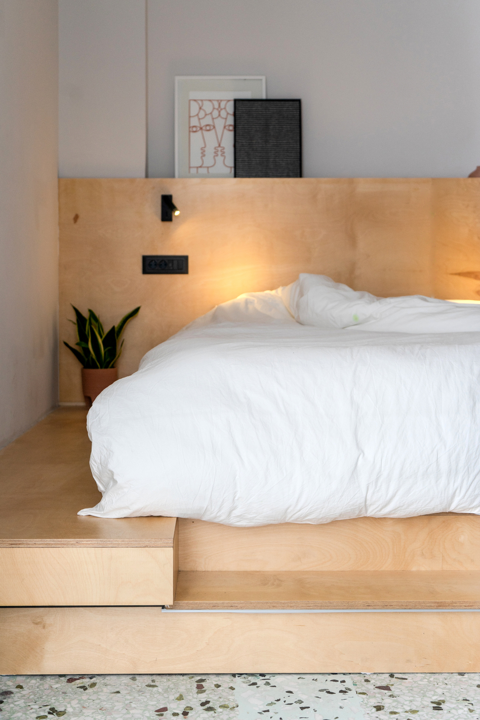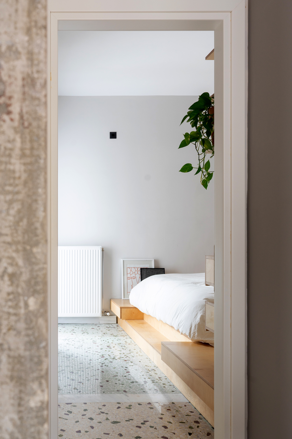 Στο πίσω τμήμα του διαμερίσματος, το υπνοδωμάτιο αντιμετωπίζεται ως ευέλικτος χώρος χαλάρωσης. Το κρεβάτι από κόντρα πλακέ τοποθετείται κατά μήκος του τοίχου, συγκροτώντας μια καθαρή οριζόντια γραμμή που ενσωματώνεται αρχιτεκτονικά στον χώρο και ενισχύει τη λιτή, γεωμετρική γλώσσα της πρότασης.