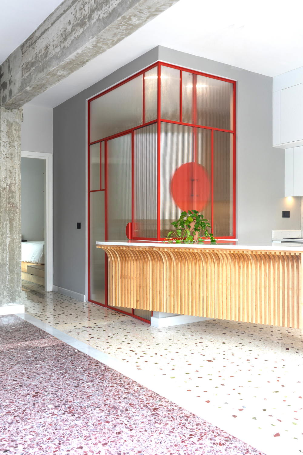 Κομβικό στοιχείο του σχεδιασμού αποτελεί η τριγωνική νησίδα της κουζίνας από κόντρα πλακέ, επενδεδυμένη με μάρμαρο, η οποία μοιάζει να αιωρείται πάνω από το μωσαϊκό δάπεδο.