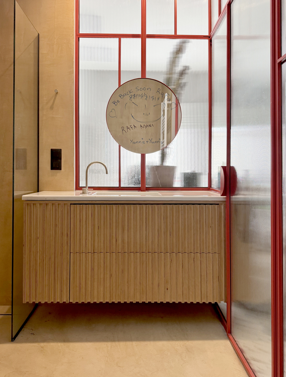 Η έντονη γεωμετρία της λειτουργεί ως χωρικό και οπτικό σημείο αναφοράς, ενώ η σχεδιαστική της λογική επεκτείνεται στο λουτρό, όπου μετασχηματίζεται σε νιπτήρα. Μέσα από αυτή τη χειρονομία, δημιουργείται μια μορφολογική συνέχεια που θολώνει τα όρια ανάμεσα στους χώρους. Η χρήση αυλακωτού γυαλιού στο λουτρό επιτρέπει τη διάχυση του φυσικού φωτός, ενισχύοντας παράλληλα την αίσθηση του ενιαίου χώρου.