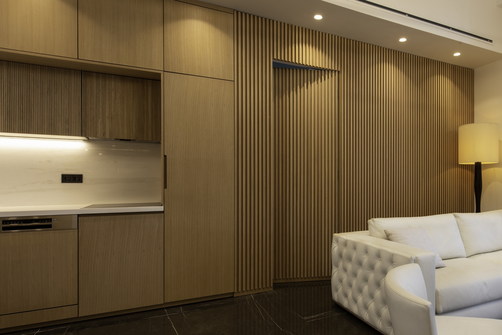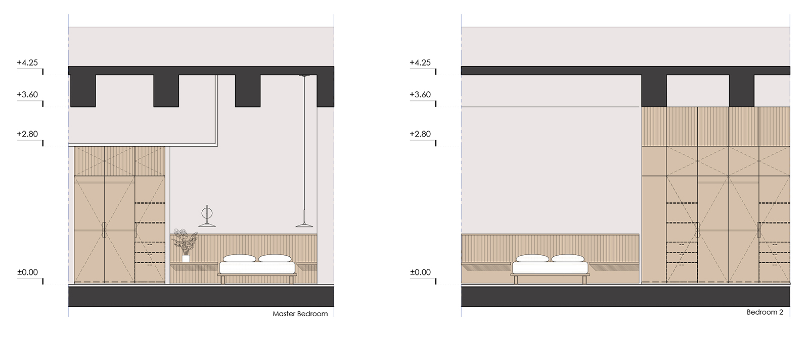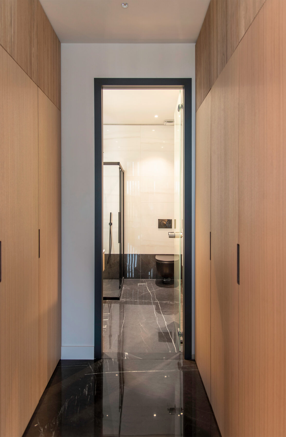 Next to the kitchen is the master bedroom. The wooden cladding creates a more textured look on the walls, with minimal aesthetic. On the cladding is hidden the door of the bedroom without visible trim. Moreover, this construction creates an exciting texture palette. In contrary to the living room, there are gypsum ceilings in the bedroom and bathrooms in order to install lighting fixtures and MEP equipment.