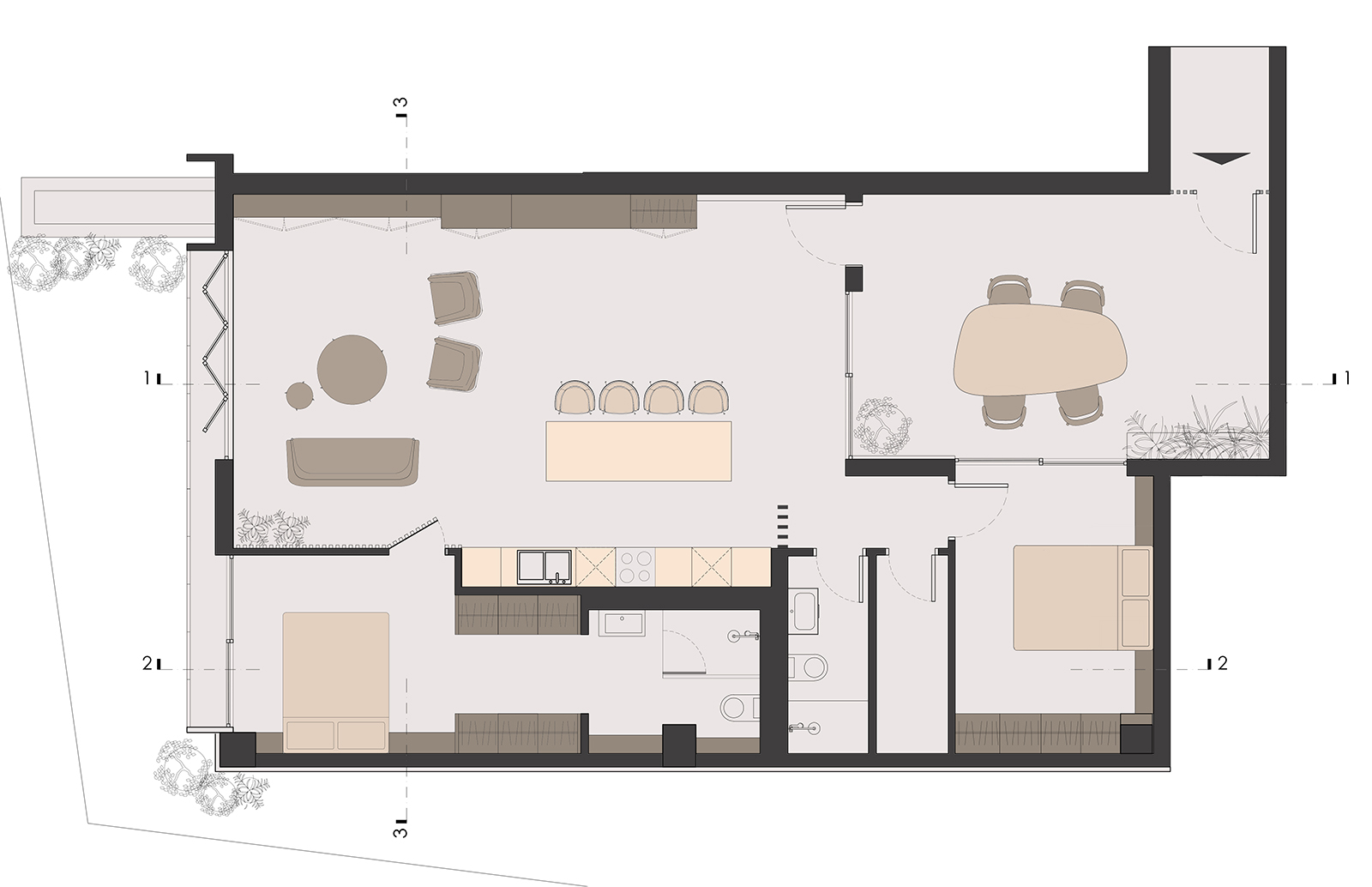 Furthermore, the apartment entrance is through a semi-covered area used as private patio, which also works as natural light source for the second bedroom. A distinct detail of the building is the tall beams running through both axis of the slab, a detail we wanted to include in our proposal to keep a more industrial/brutal style.