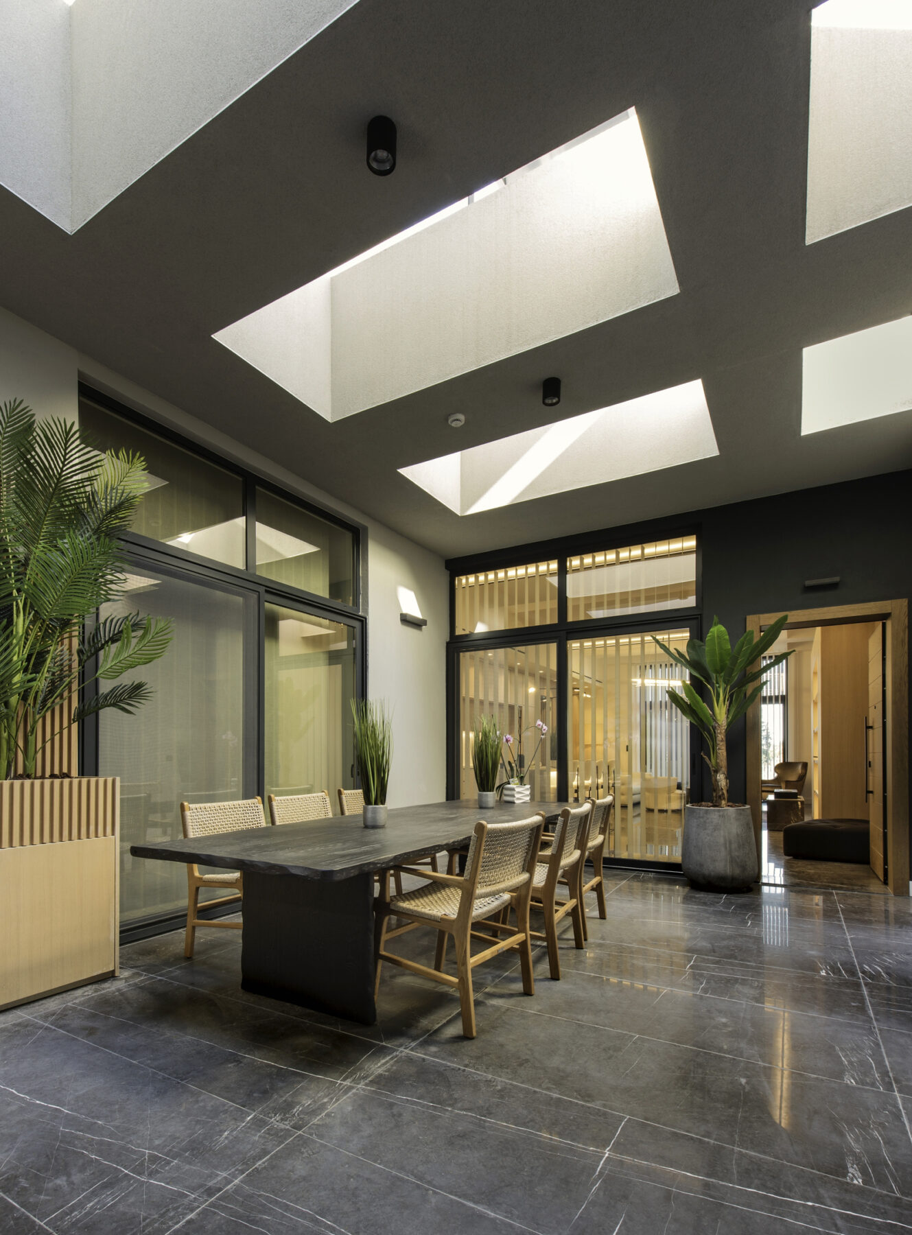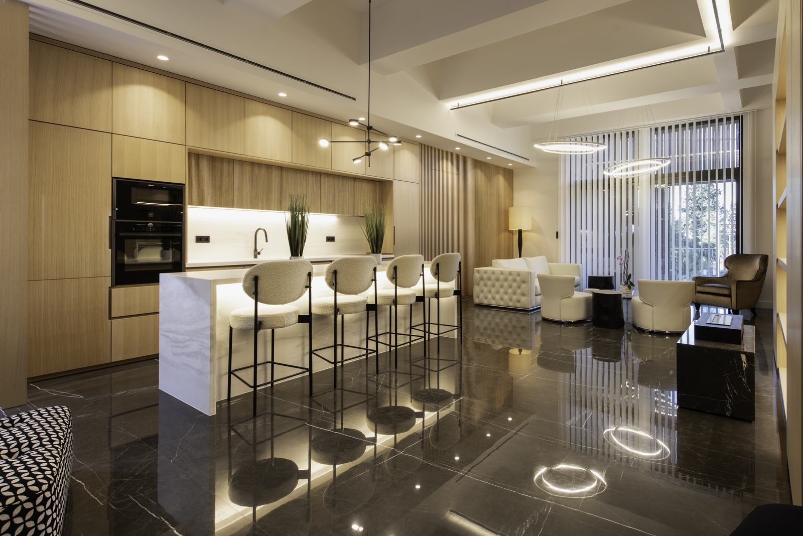 Μπαίνοντας εσωτερικά συναντάμε έναν ενιαίο χώρο καθιστικού και κουζίνας με κύρια στοιχεία το ξύλο, το μάρμαρο και το μέταλλο. Το σαλόνι αποτελεί τον πυρήνα της κατοικίας, δημιουργώντας χώρους αντάμωσης και επικοινωνίας. Για το λόγο αυτό δημιουργήθηκε μια διαμπερή και ξεκάθαρη χάραξη μεταξύ των χώρων διημέρευσης και των αίθριων/ημιυπαίθριων τμημάτων.