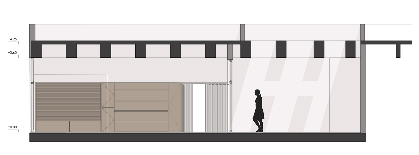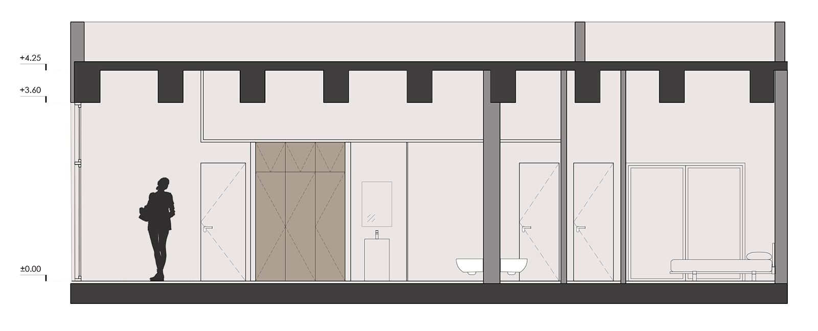 A design key was the height of the floor, combined with the beams and the concrete slab. Due to these details, we decided not to apply ceiling but leave the slab structure visible.