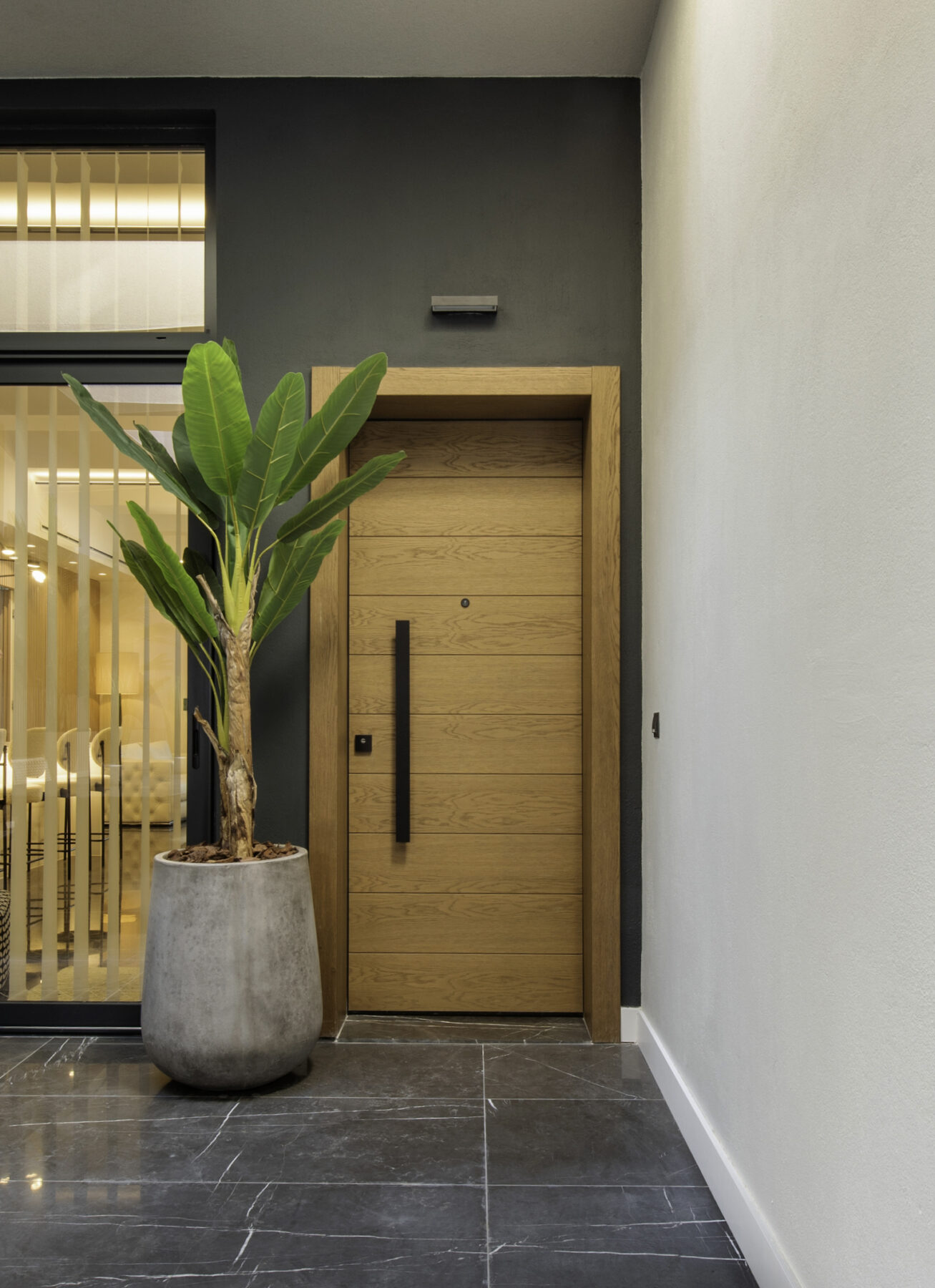 Πιο λεπτομερώς, η είσοδος στην κατοικία πραγματοποιείται από έναν ημιυπαίθριο χώρο που χρησιμοποιείται ως κλειστή αυλή και αποτελεί πηγή φωτισμού για το δευτερεύον υπνοδωμάτιο. Χαρακτηριστικό στοιχείο του κτιρίου που συναντάμε από την είσοδο ακόμα, είναι τα υψίκορμα δοκάρια που τρέχουν κατά μήκος και των δύο διευθύνσεων και θέλαμε να τα συμπεριλάβουμε στη σύνθεση ως ένα πιο industrial/brutal στοιχείο.