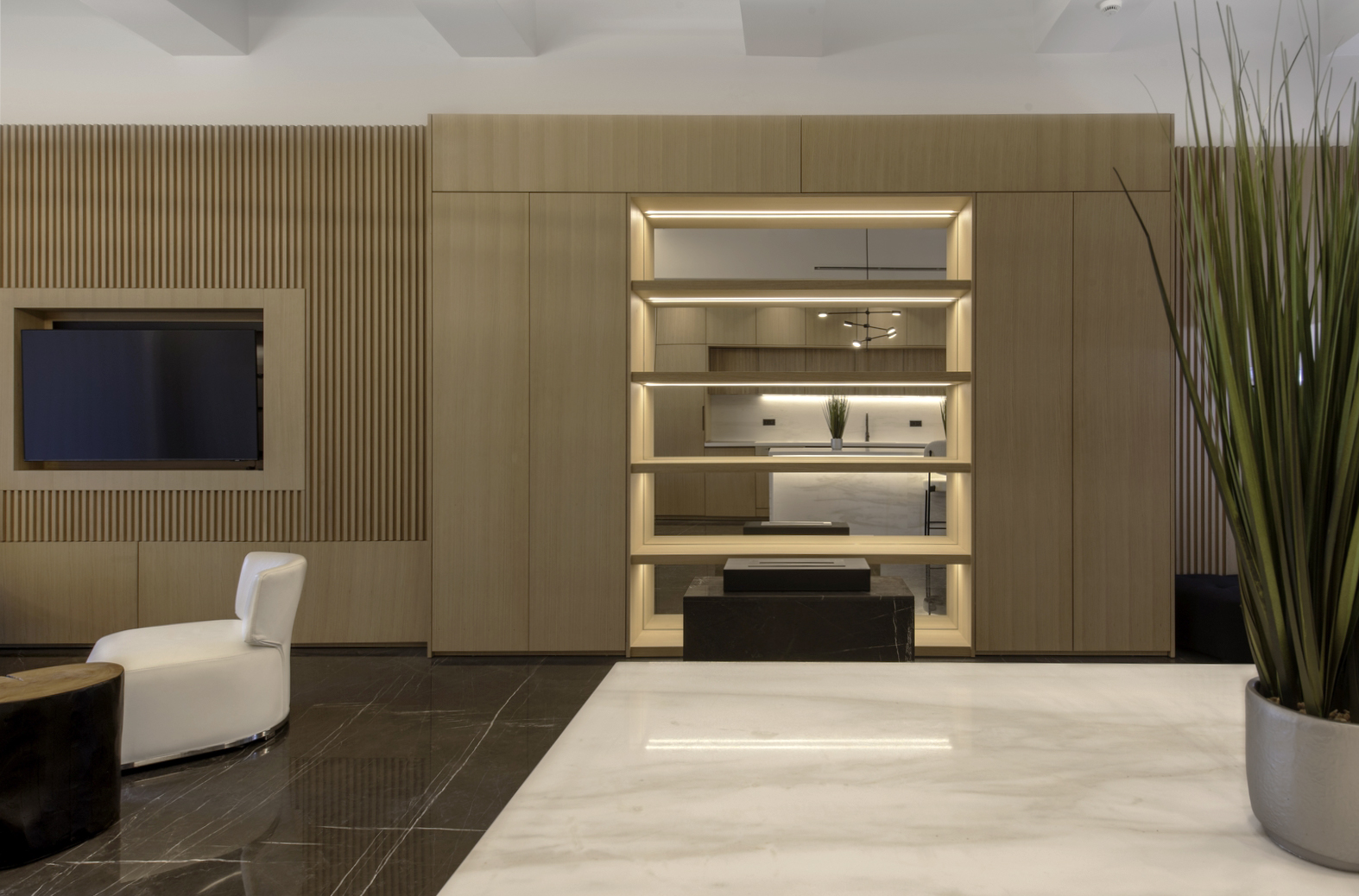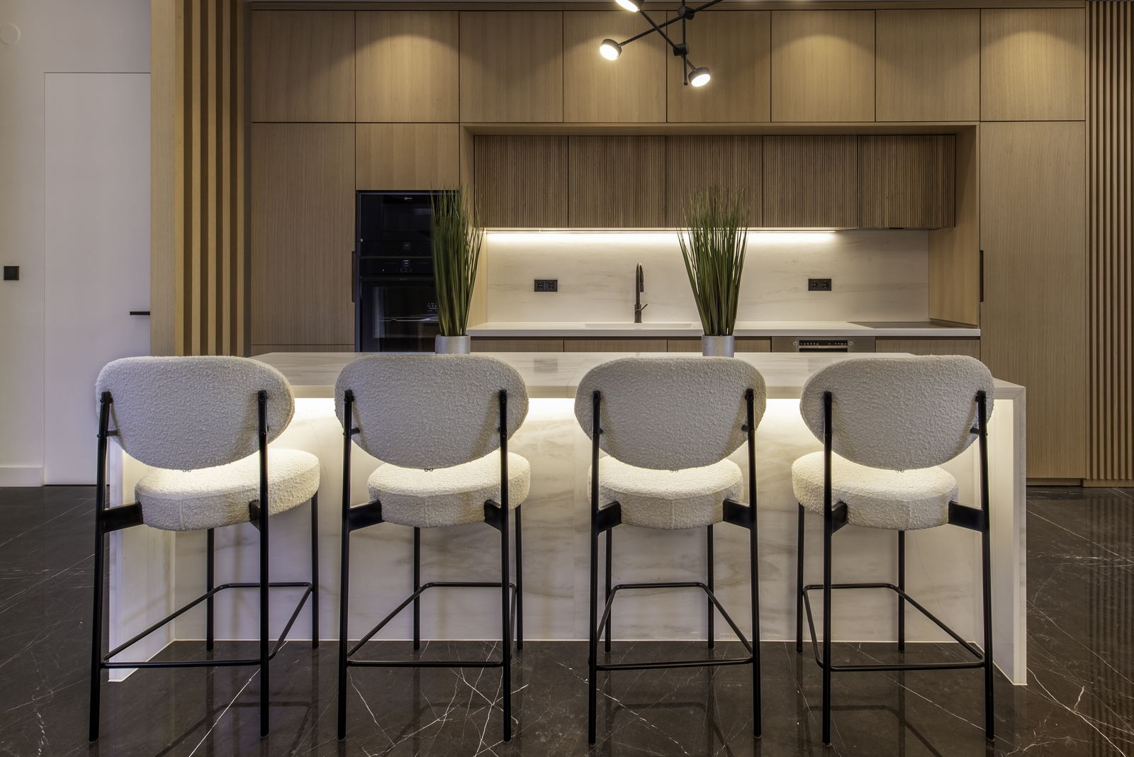 Σε συνέχεια της ανοιχτής κουζίνας βρίσκεται ο χώρος του master bedroom. Η ξύλινη επένδυση με τα κατακόρυφα πηχάκια δημιουργεί μια minimal και καλαίσθητη εσωτερική όψη, όπου «κρύβεται» εντέχνως η πρόσβαση στο δωμάτιο. Επίσης δημιουργεί μια ενδιαφέρουσα εναλλαγή υφών και υλικών. Εν αντιθέσει με το χώρο του καθιστικού, στο μεγαλύτερο μέρος των οροφών των δωματίων έχουν δημιουργηθεί ψευδοροφές προκειμένου να καλυφθούν οι ανάγκες φωτισμού και ΗΜ εγκαταστάσεων.
