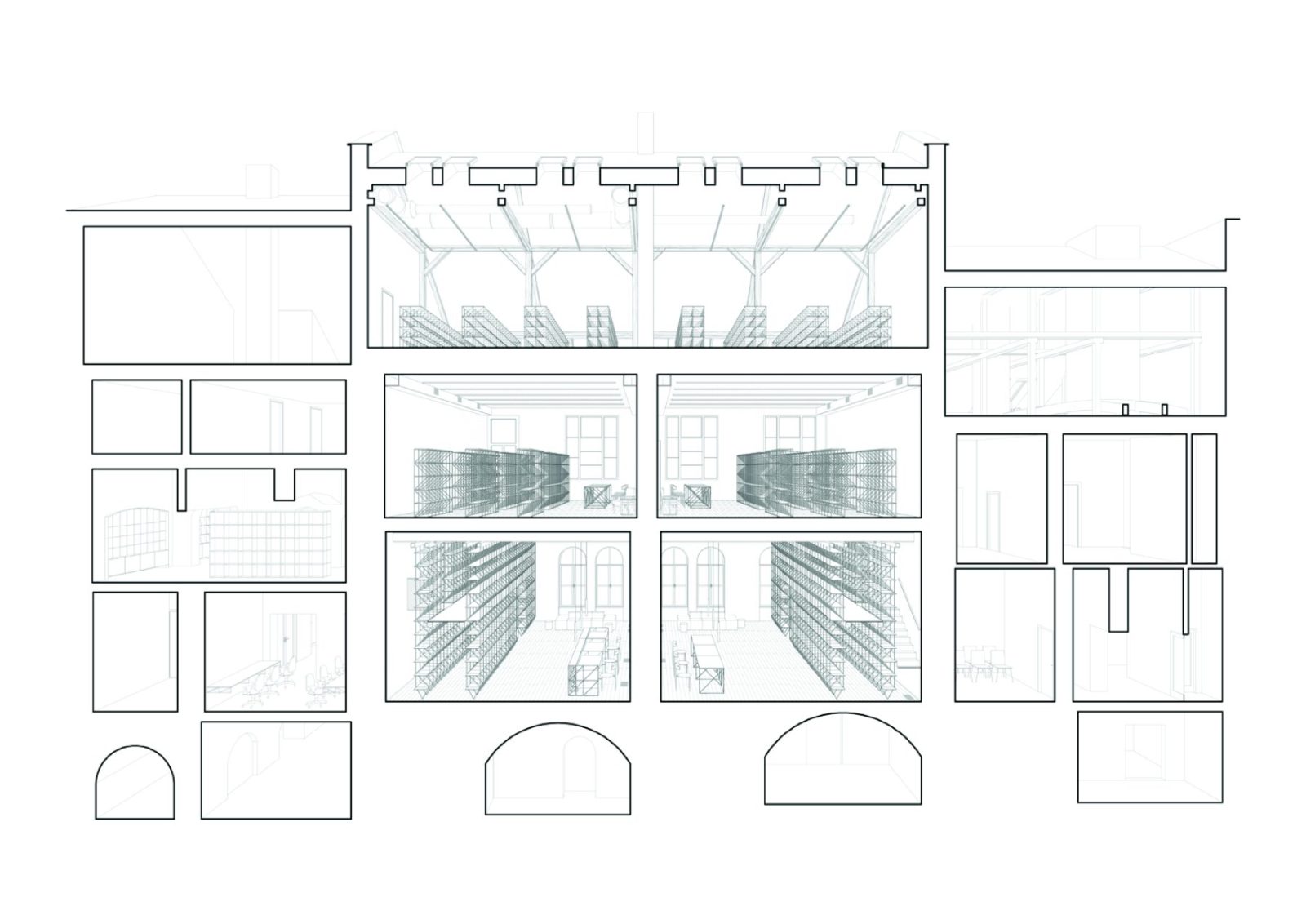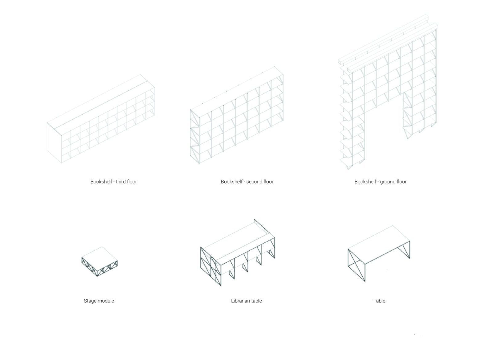 As one ascends, the environment gradually shifts: shelving density increases, spatial occupation intensifies, and multifunctionality recedes, culminating in focused, book-dominated spaces on the upper levels. This progression is reinforced through varying shelf heights, which act as subtle tools of orientation within the interior.