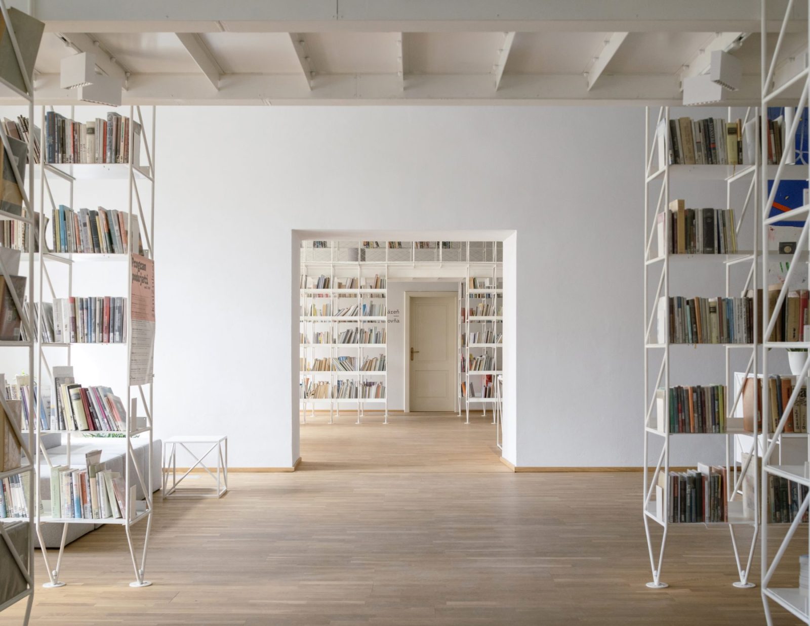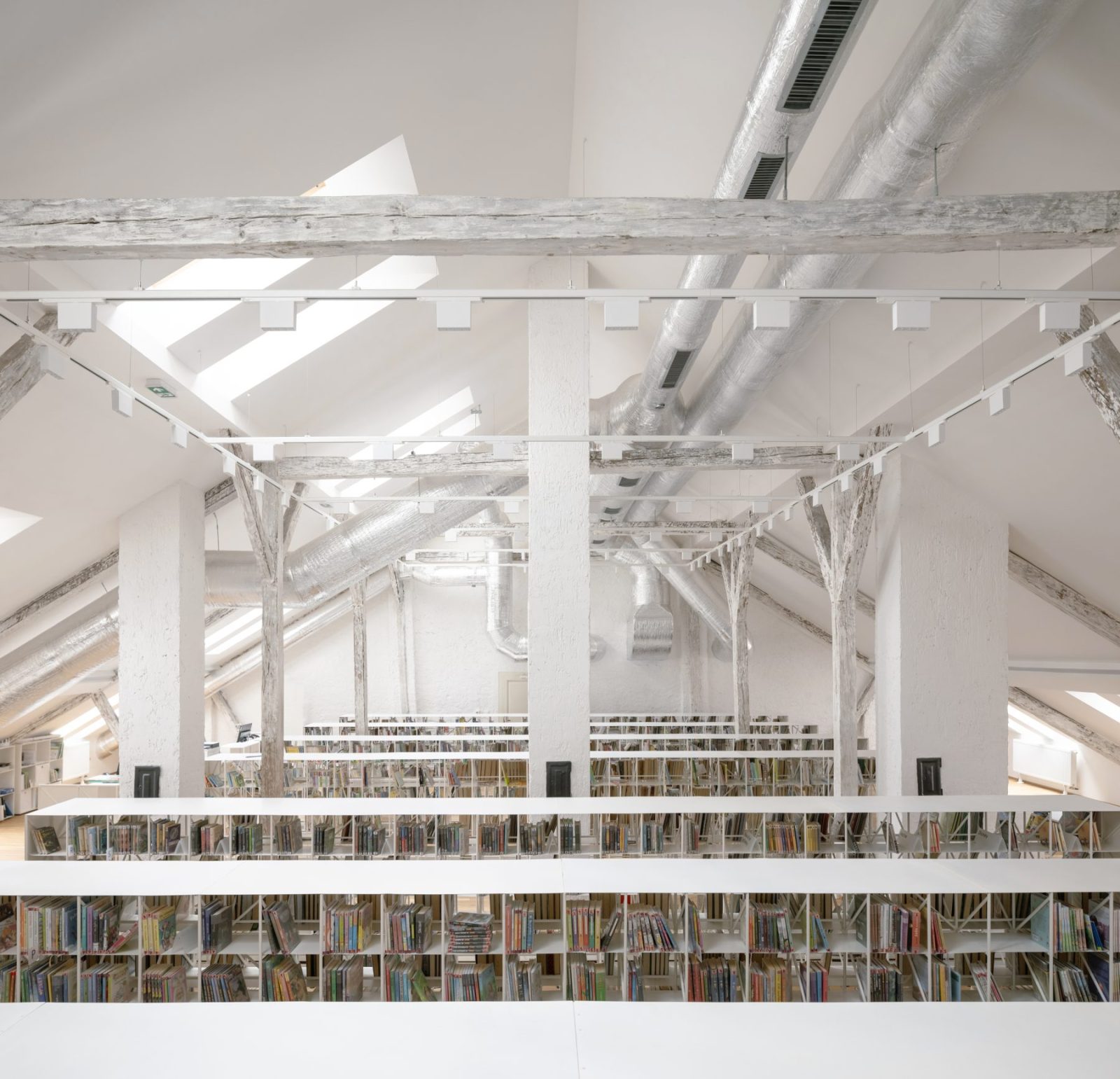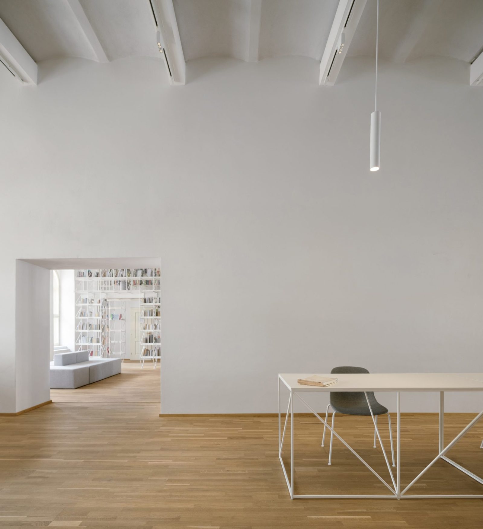 Daylight reveals the palatial scale of the historic halls, activating the genius loci of the space. The project brings together three interconnected historic townhouses, transforming them into a unified cultural institution that accommodates departments for non-fiction, fiction, and children’s literature.