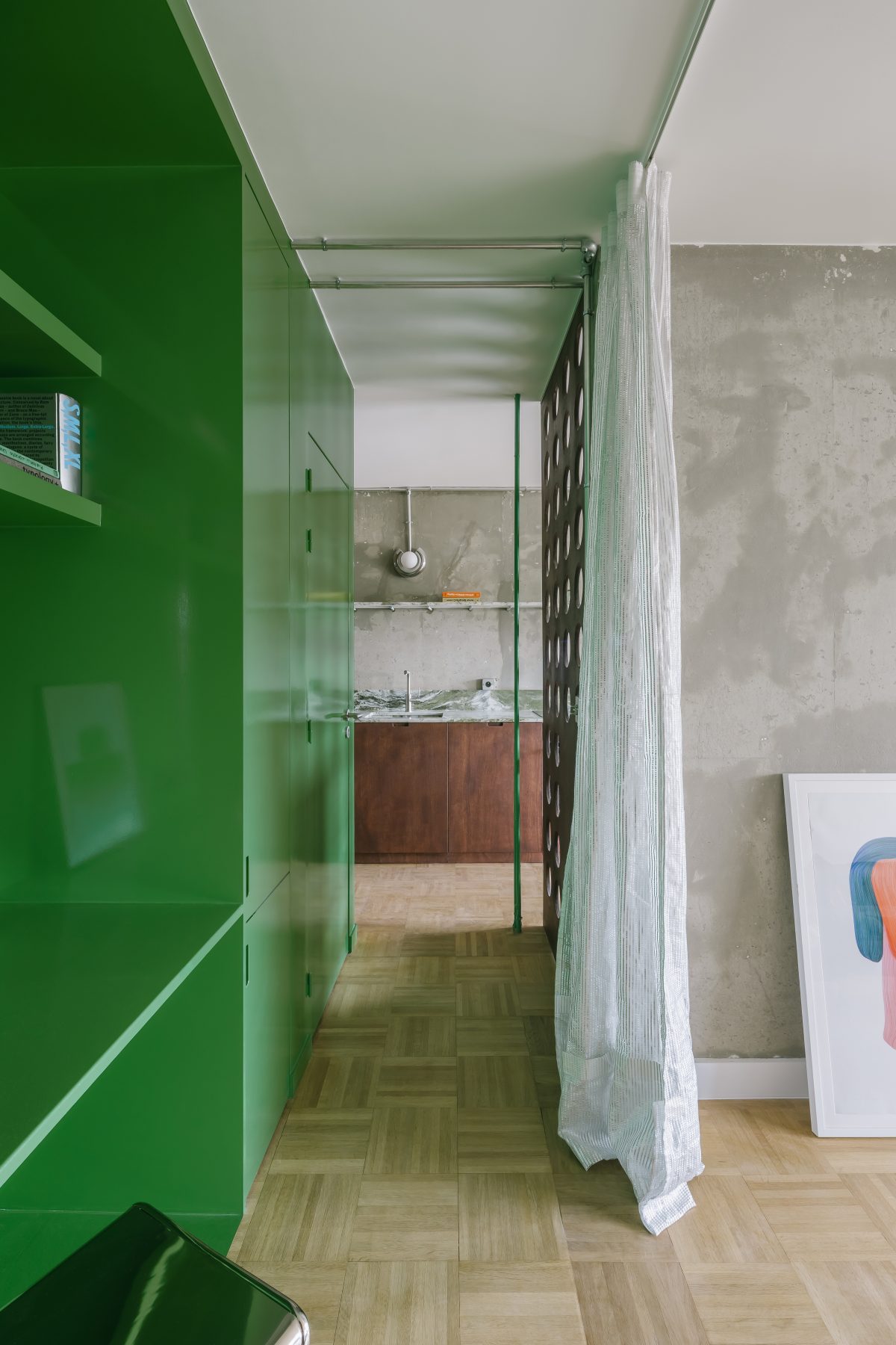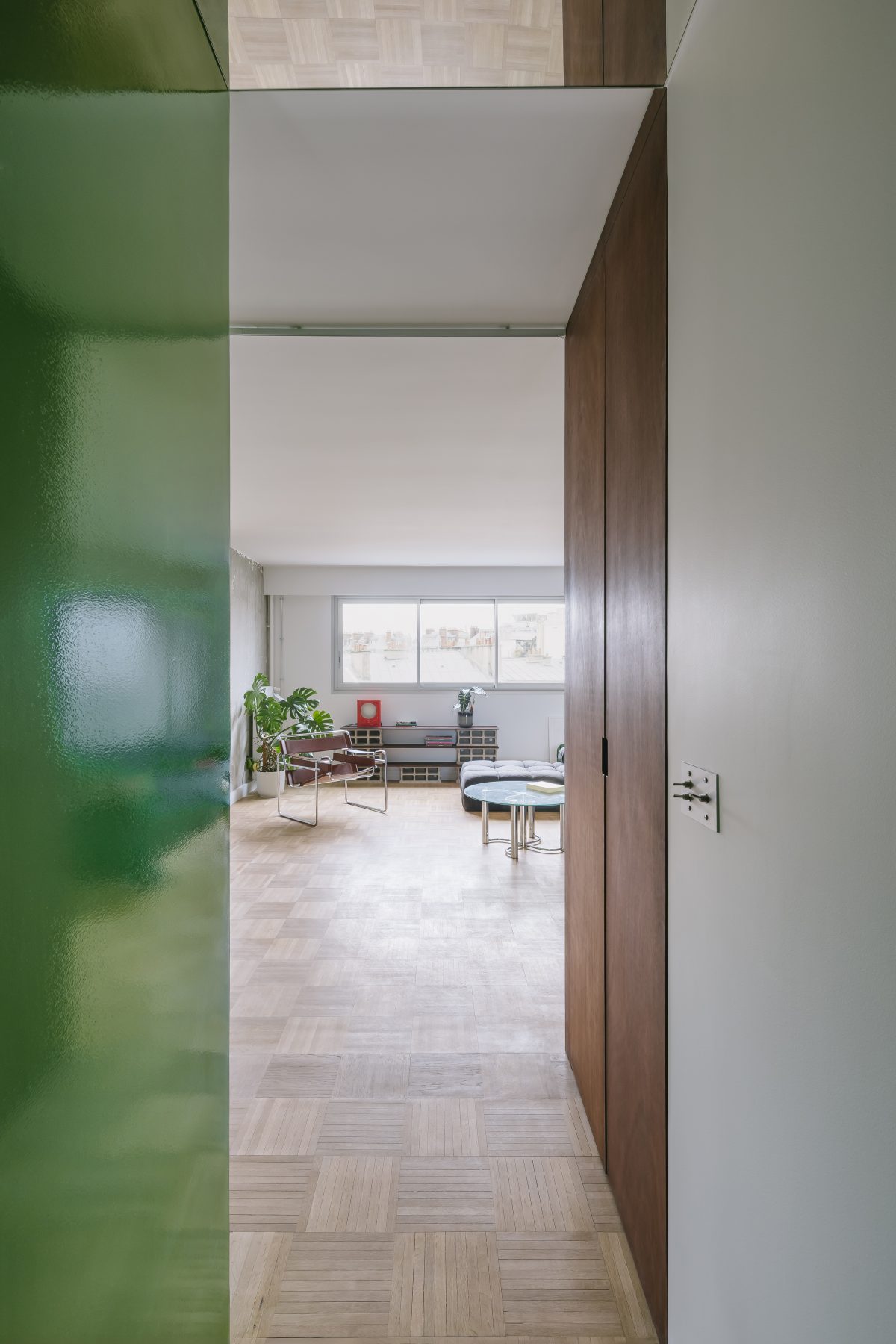 A compact central volume —a glossy green cube— is introduced to reorganize the apartment from within. This object-like element concentrates technical functions and storage, while structuring circulation.