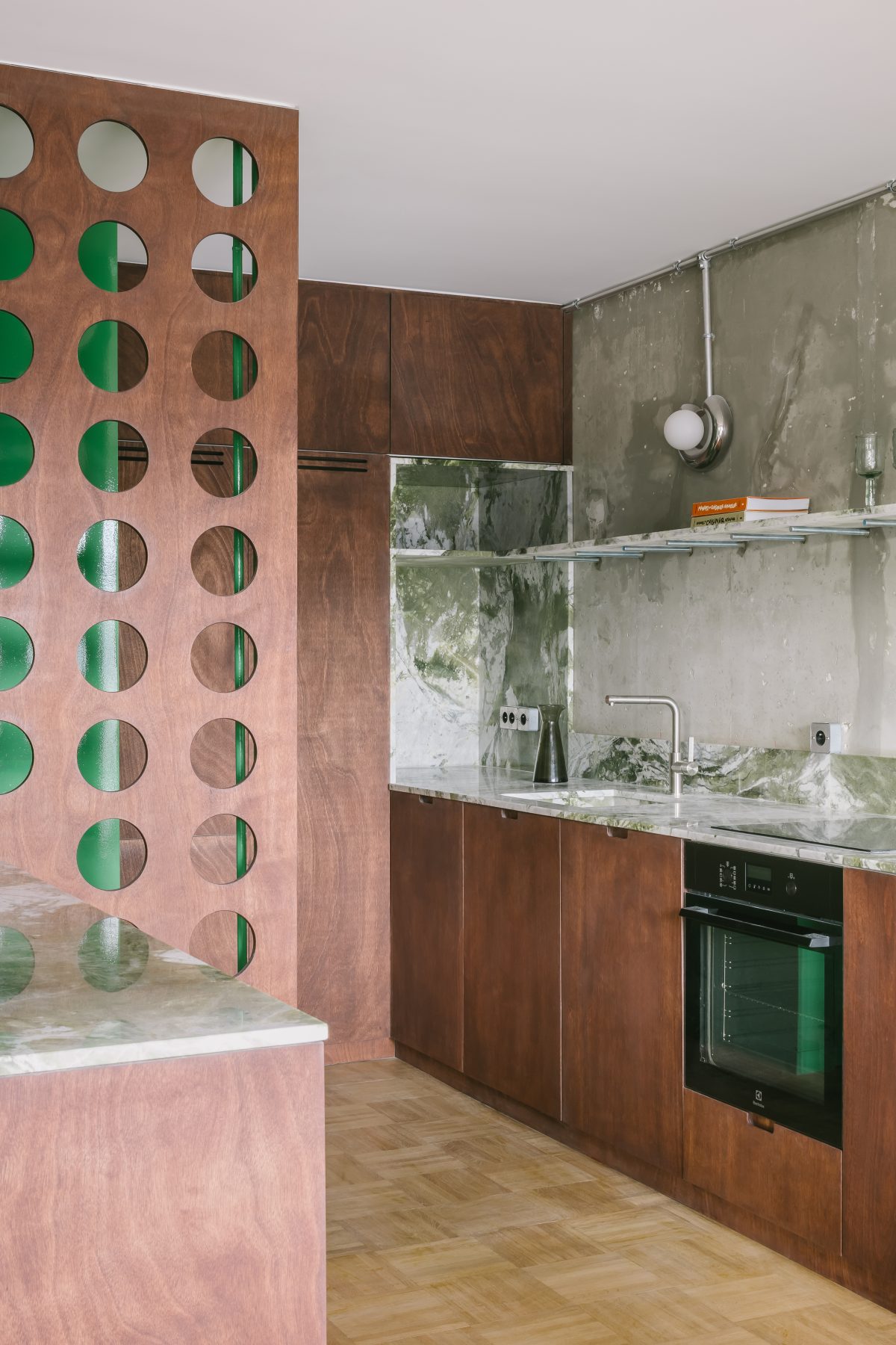 This detail encapsulates the project’s ethos—an equilibrium between refinement and constructional honesty. By juxtaposing noble materials with industrial fixing systems, Atelier Apara establishes a language that is both understated and sophisticated.