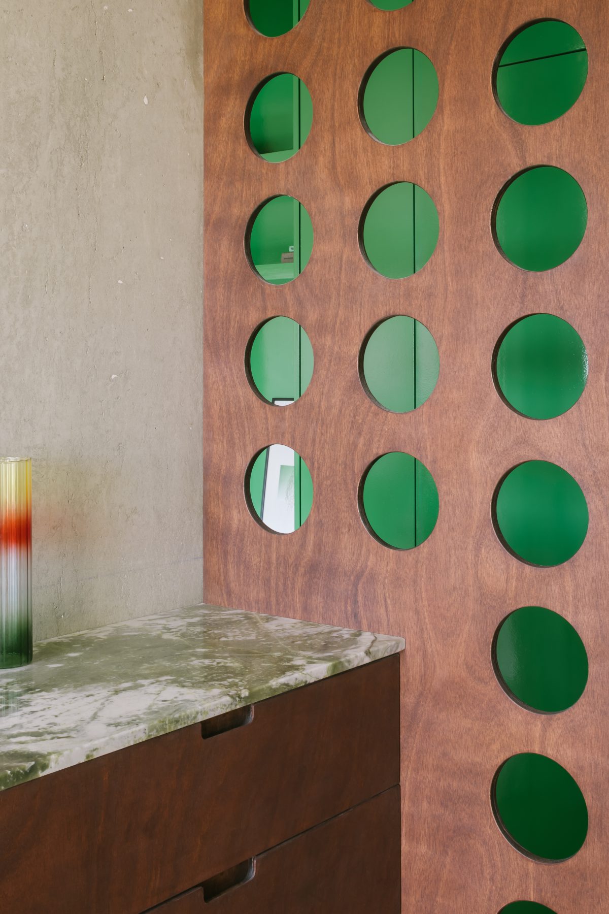 Atelier Apara renovates a 93 m² family house within a post-war apartment building in Paris through an object-like insertion: a reflective green cube forming the domestic nucleus. Color operates as an architectural tool over formal excess, reinforcing orientation and spatial legibility. Noble materials and industrial fixing systems—restored parquet, exposed concrete, custom marble—establish a refined dialogue between existing structure and contemporary inhabitation, defined by clarity, material intelligence, and chromatic precision.