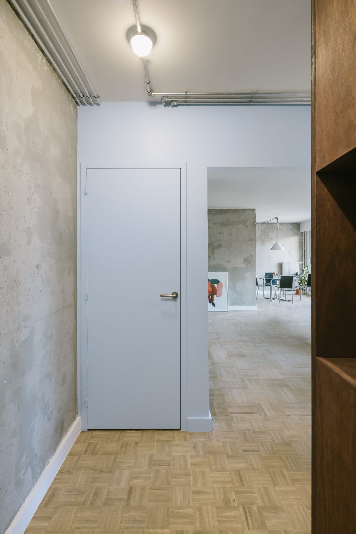 The existing parquet flooring is retained and extended, maintaining a tactile connection to the apartment’s original character while unifying the new layout. In parallel, exposed concrete surfaces reveal the building’s mineral qualities, embracing a raw aesthetic that is both economical and expressive. This dialogue between old and new, warm and cold, is articulated through carefully resolved details.