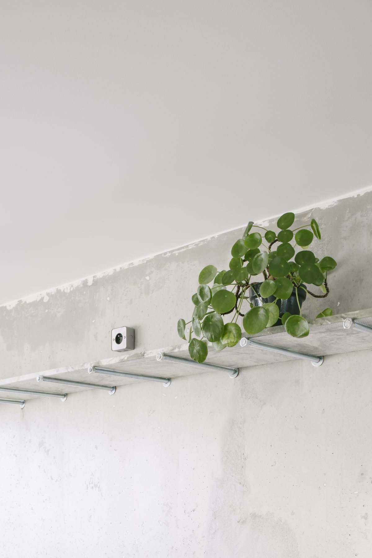 Among these, custom-designed marble shelving stands out: thin slabs supported by slender threaded rods with visible bolts.