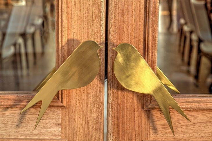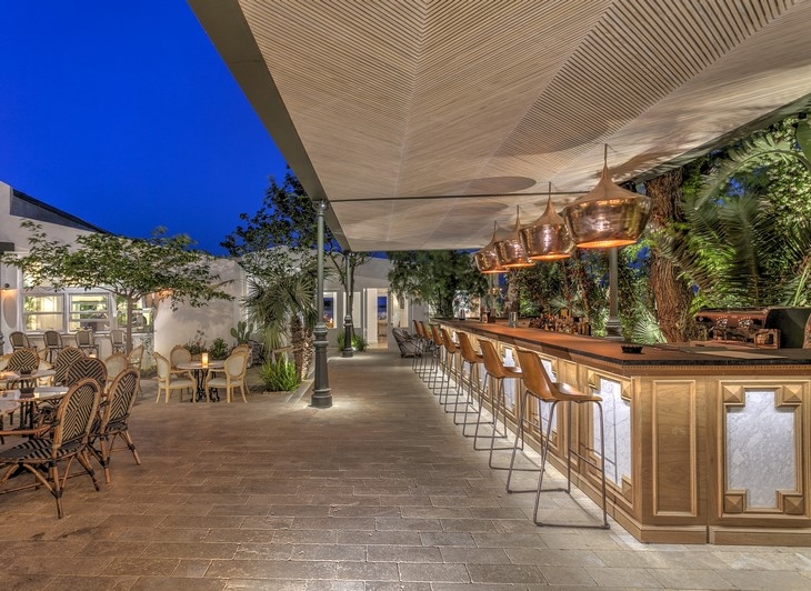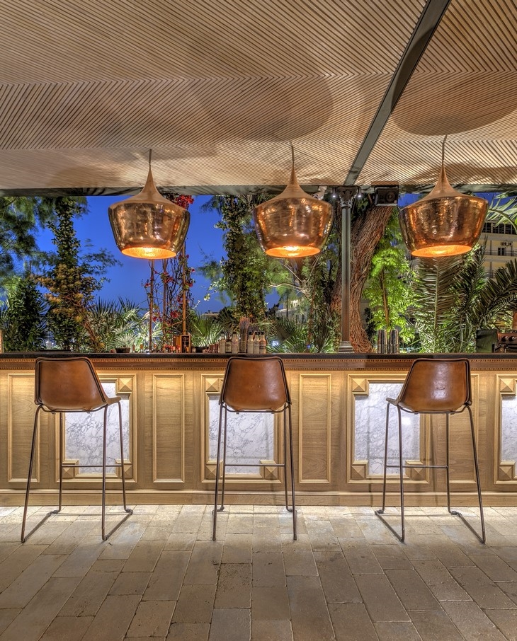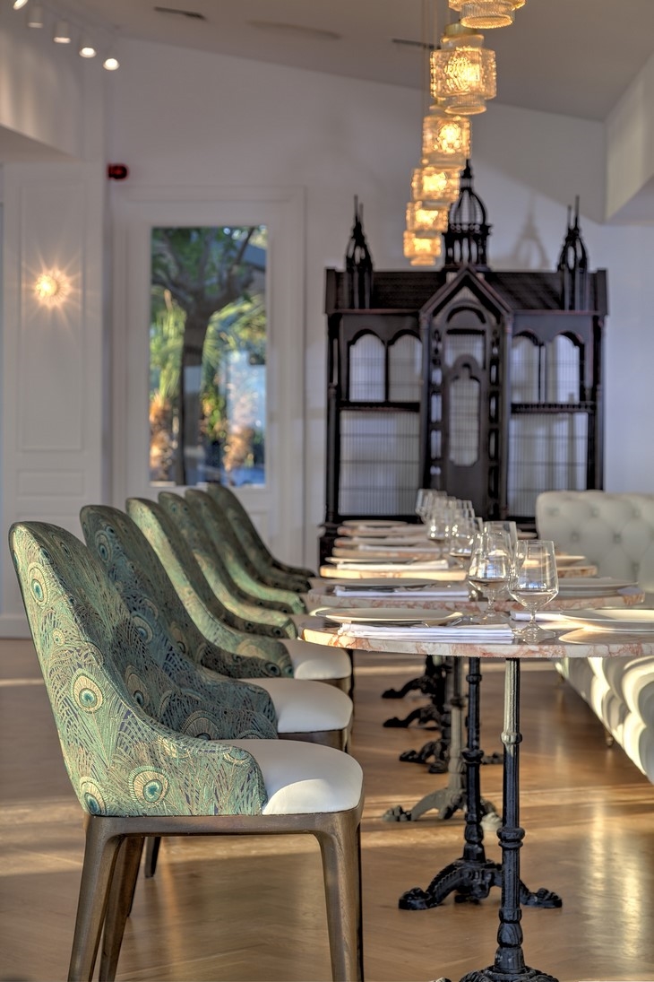 The existing building with its high ceilings and arched windows led the team to envision an eclectic space. The materials and elements used – herringbone floors, marble, wall moldings, vintage lighting fixtures and bespoke furniture – reference the original character of the interior. In contrast, industrial elements – concrete walls, raw iron and copper textures – used in the food and beverages preparation area are giving the space a contemporary edge. The coffee shop and the open kitchen are incorporated to the overall design in a way that stimulates the senses. The customer can watch the staff in action, hear, smell and observe the process, becoming part of the setting.