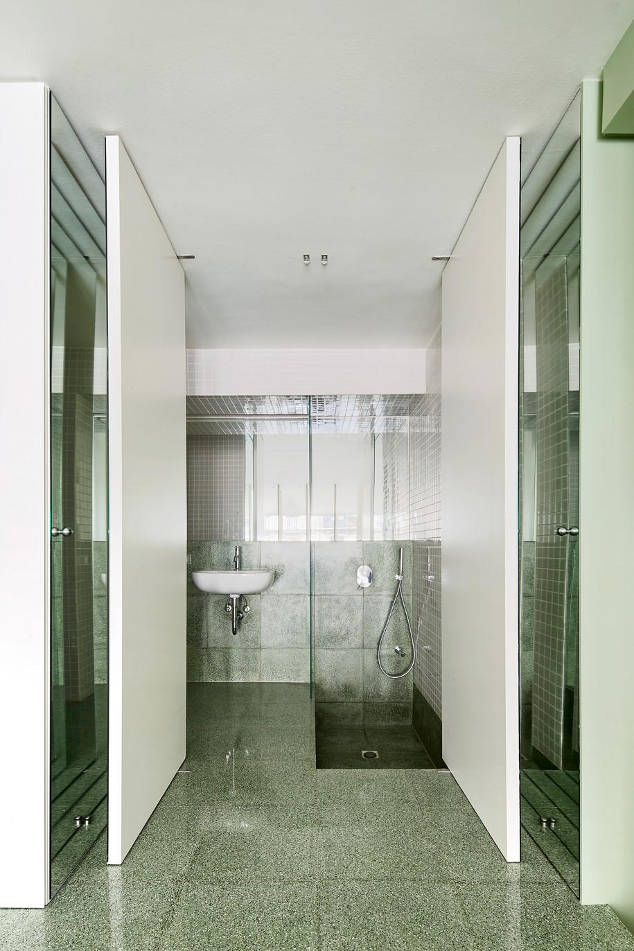 The thickness that generates the new level serves to define a volume of the height of a bench where people can sit down to eat, but also can place a tv or any other kind of objects. The raised bedroom is interconnected with the kitchen and the open area by steps and also its privacy can be regulated by a set of folding shutter doors.. A mirror wall gives back to the bedroom and opens up to the bathroom, which has a recessed bath.