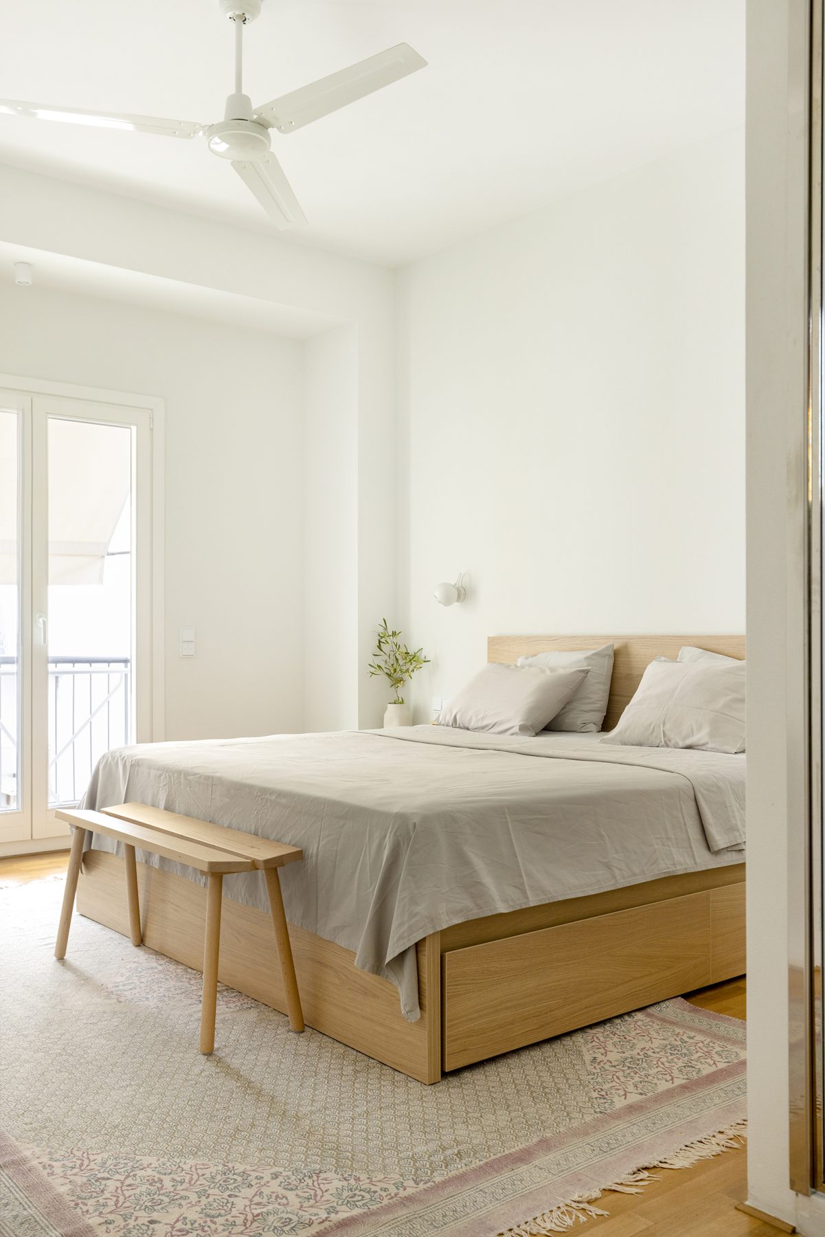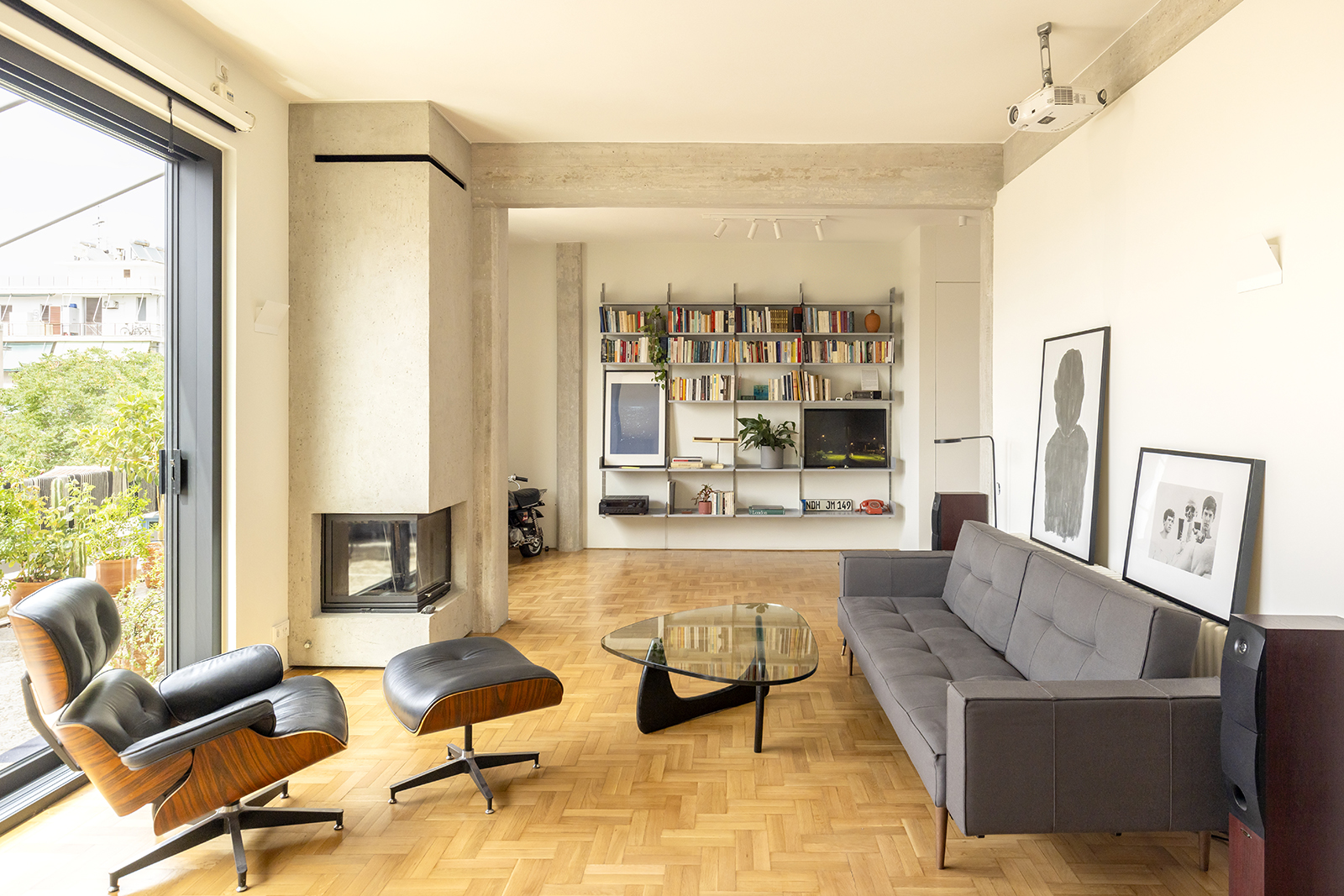 The Benaki Street apartment occupies the top floor of a typical Athenian polykatoikia from the early 1960s—a mid-century residential typology that has significantly shaped the city’s urban fabric. Its façade reflects the architectural language of the period, combining ground-floor commercial activity with repetitive residential levels defined by elongated balconies, and a recessed upper floor.