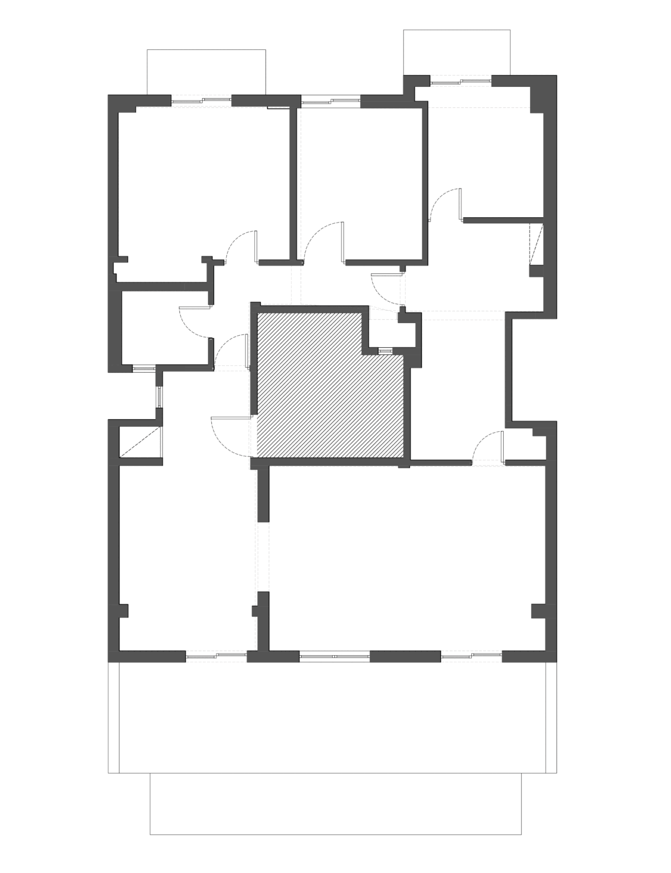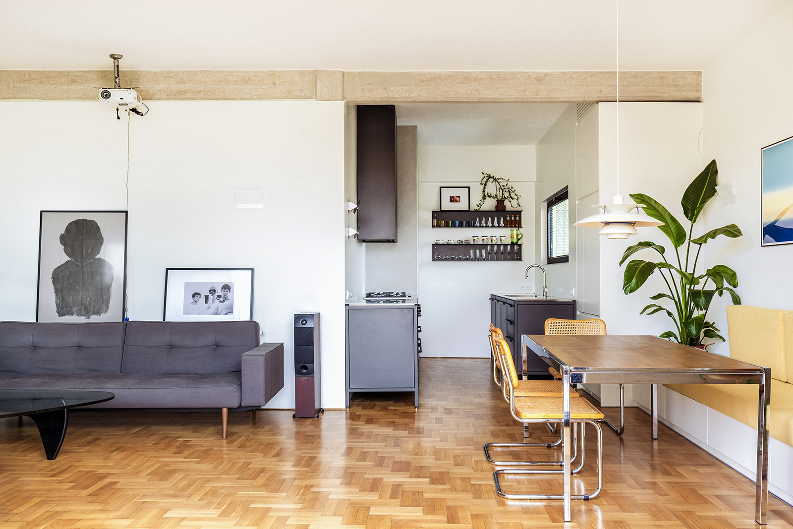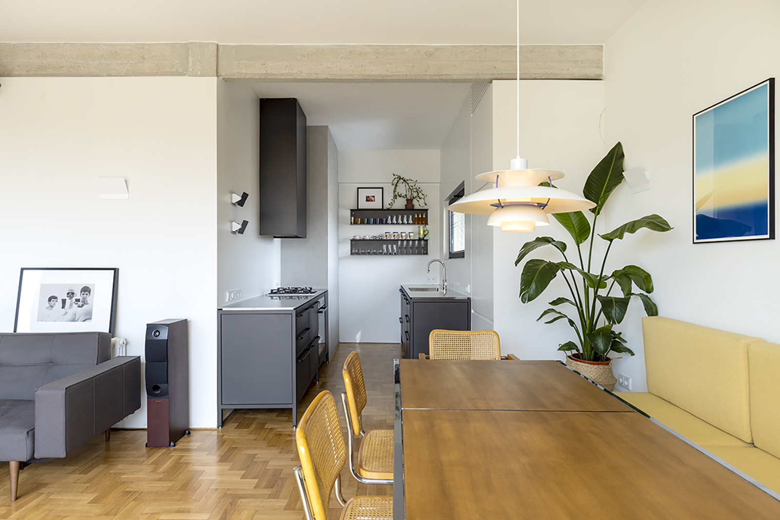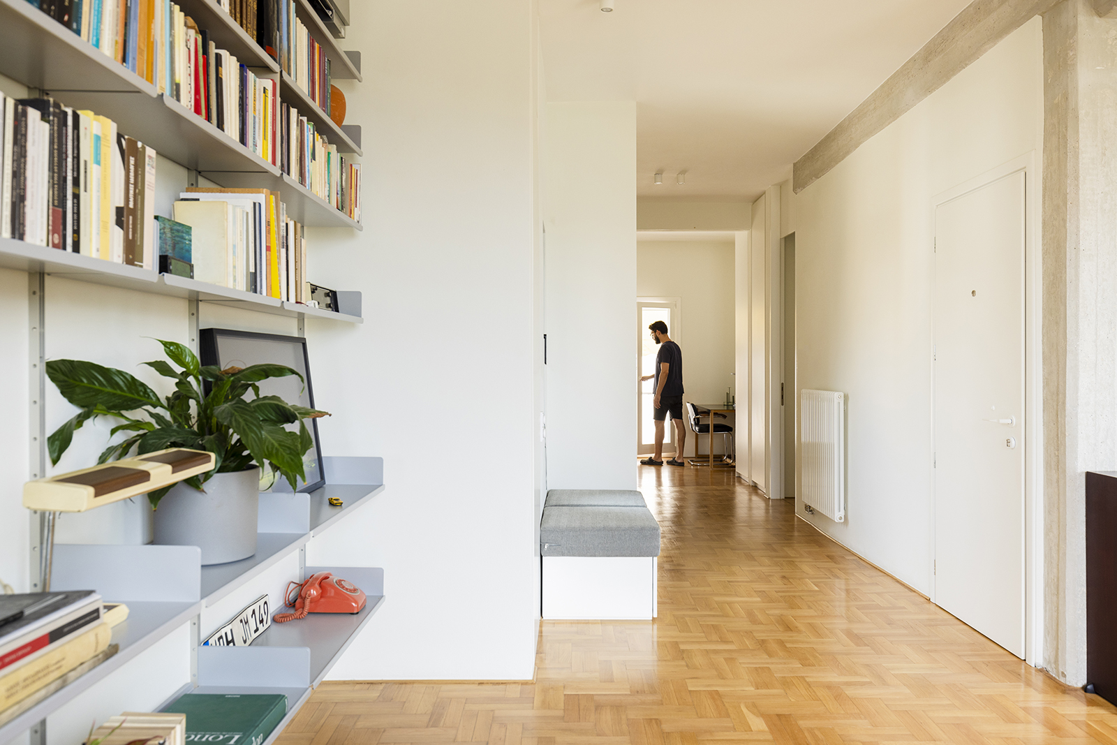 The original layout followed the conventions of its time, with small, enclosed rooms arranged around a central stairwell and connected by narrow corridors. This configuration resulted in fragmented, inward-looking interiors with limited access to natural light. Despite these spatial limitations, the apartment retained a rich material palette—wooden floors, mosaics, and marble—that continues to define the distinctive domestic identity of the Athenian polykatoikia.