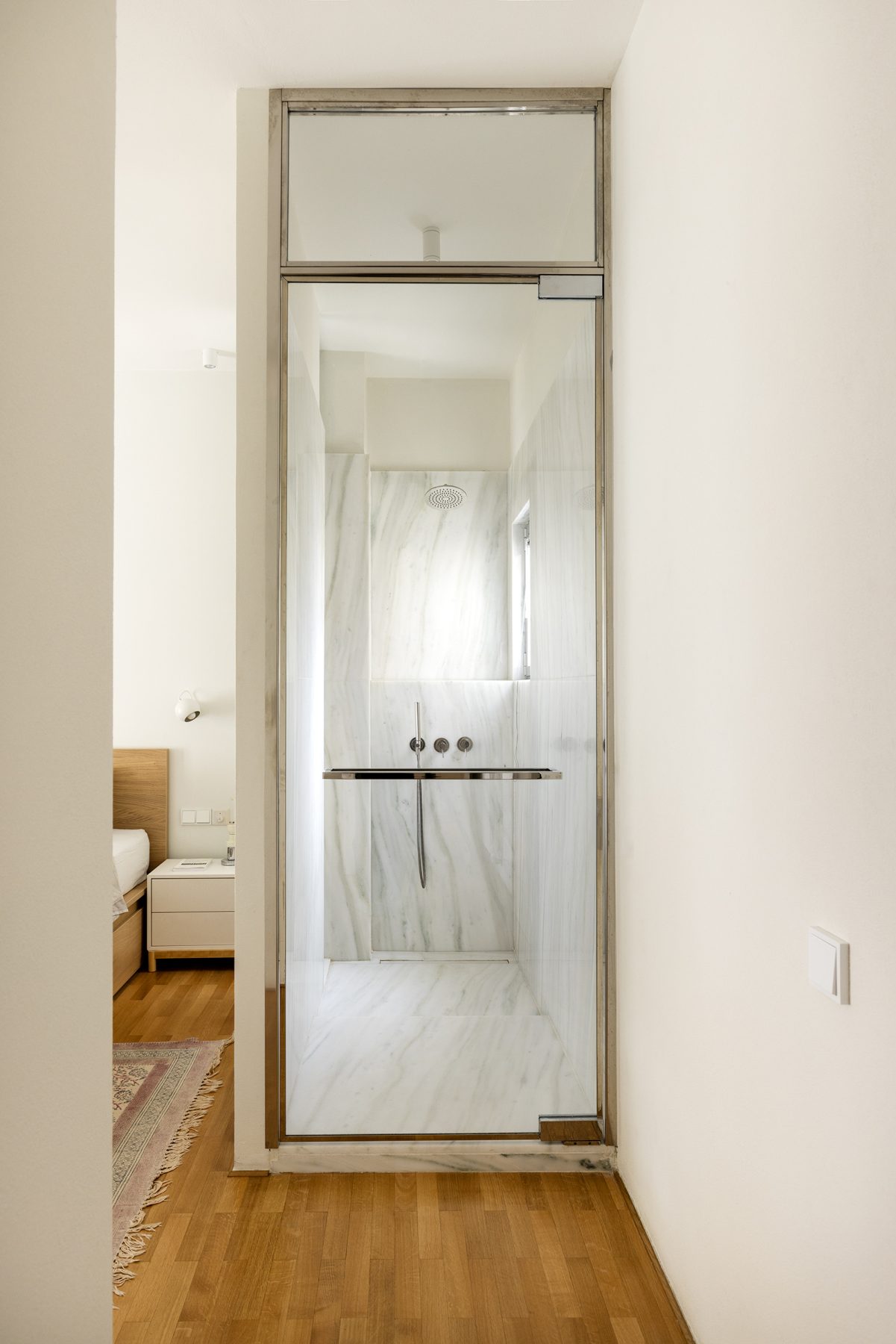 The intervention unfolds through three key operations. The first eliminates the corridors, redistributing their surface area to adjacent rooms and enhancing spatial openness. The second consolidates the living room, dining area, and kitchen into a unified open-plan environment, complemented by a newly articulated entrance threshold that functions as an organizational core, structuring movement and guiding light into the depth of the apartment. The third addresses materiality, combining restoration with contemporary insertions: existing wooden floors, mosaics, and marble are preserved, while Dionisos marble, powder-coated metal, and crafted wood elements define the new interventions.