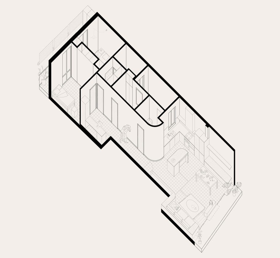 The second, is located on the facade of the street and has the public uses, giving rise to a single open space that includes the kitchen, the dining room, the living room and a tiny office. The proposal aims to take full advantage of natural light and ventilation and provide a sensation of spaciousness and fluidity to the apartment.