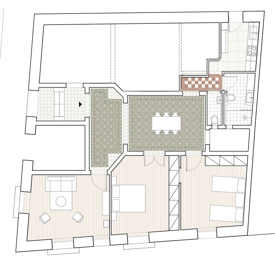 It has been the present owner’s father family residence and in the 1950s his dentistry was hosted in what is now the living room. The apartment now measuring 105 sq.m. consists of two central spaces -the entrance hall and the dining room (around which the house was originally organized), two bedrooms, a sitting room, a new kitchen, a bathroom and a WC. Having lost its symmetry and its access to direct light from the one side, an intervention that would brighten up the central space became part of the brief.