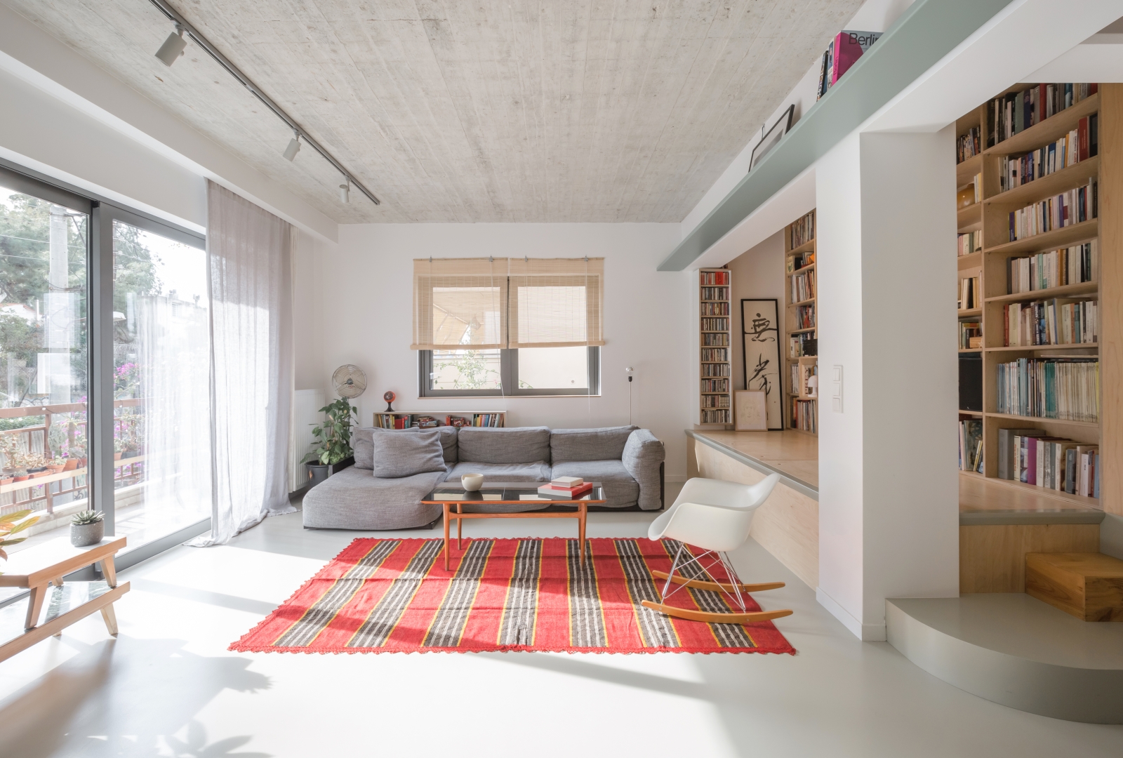 Πρώτον, οι ιδιωτικοί χώροι αντιμετωπίζονται όχι ως απομονωμένα δωμάτια, αλλά ως μέρη ενός ενιαίου, συνεχούς χώρου και δεύτερον, η αποθήκευση, συνήθως αθέατη και περιθωριακή, μεταφέρεται στο κέντρο της κατοικίας. Το πατάρι, αντί να κρύβεται πάνω από βοηθητικούς χώρους, γίνεται ορατό και λειτουργικό στοιχείο του καθιστικού, επαναπροσδιορίζοντας τη σχέση χρήσης και χώρου.
