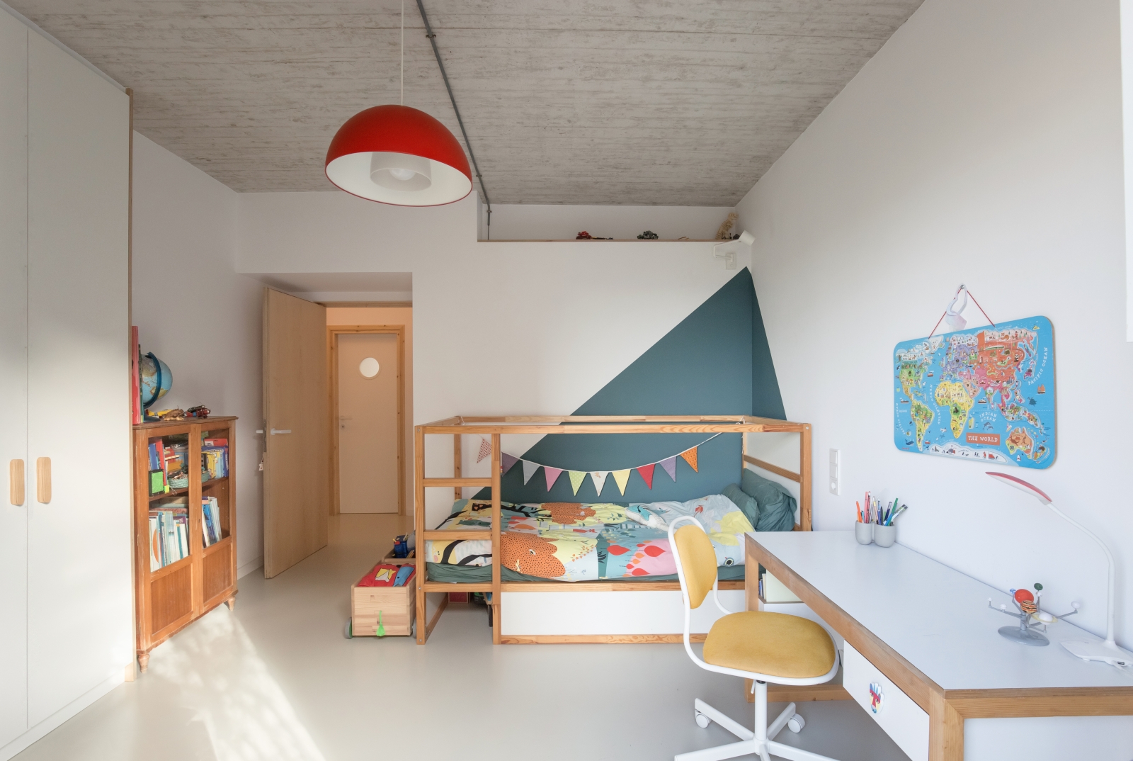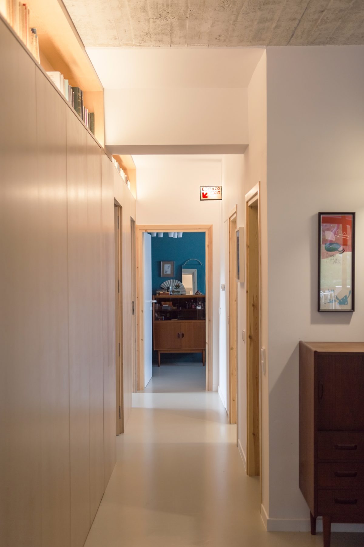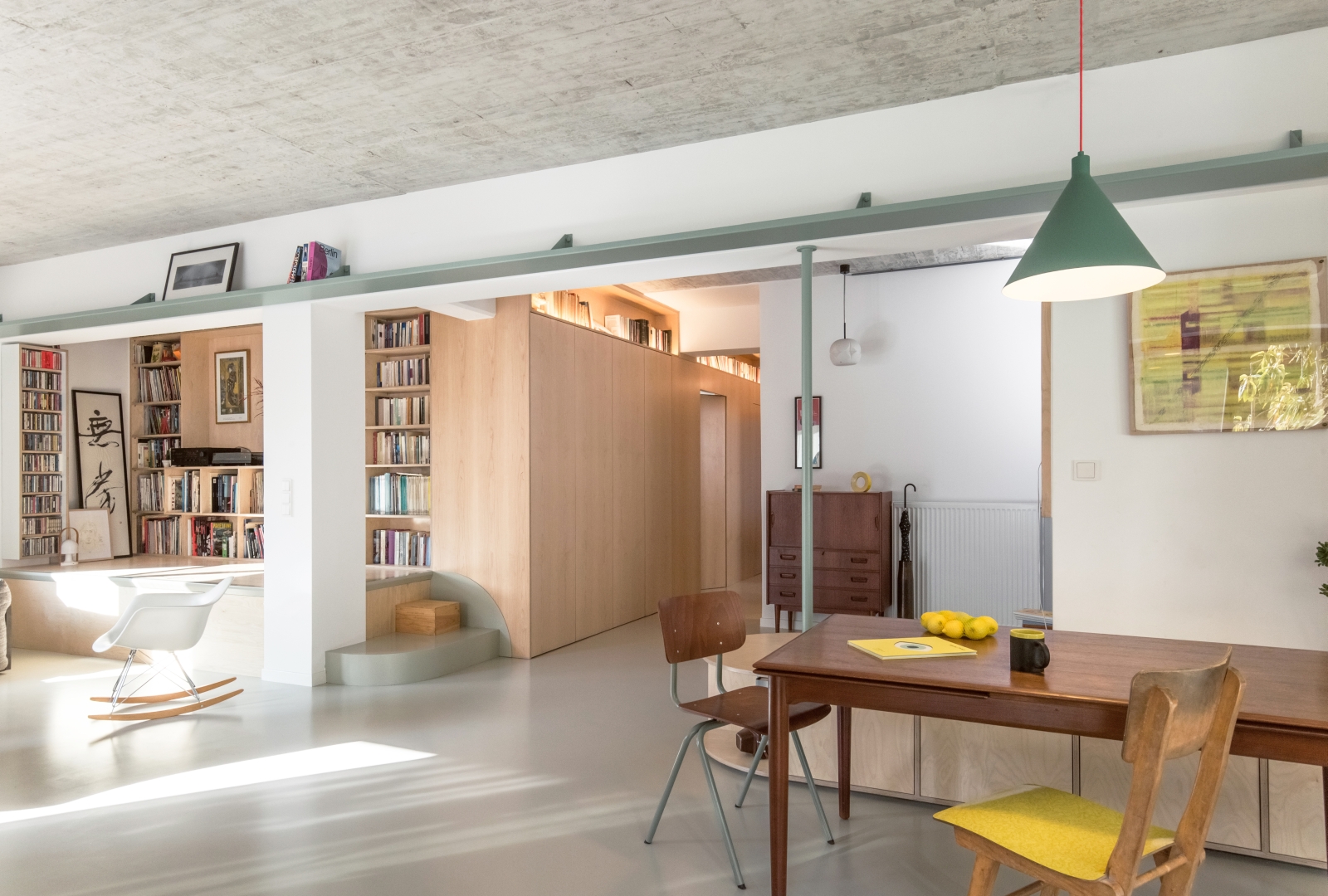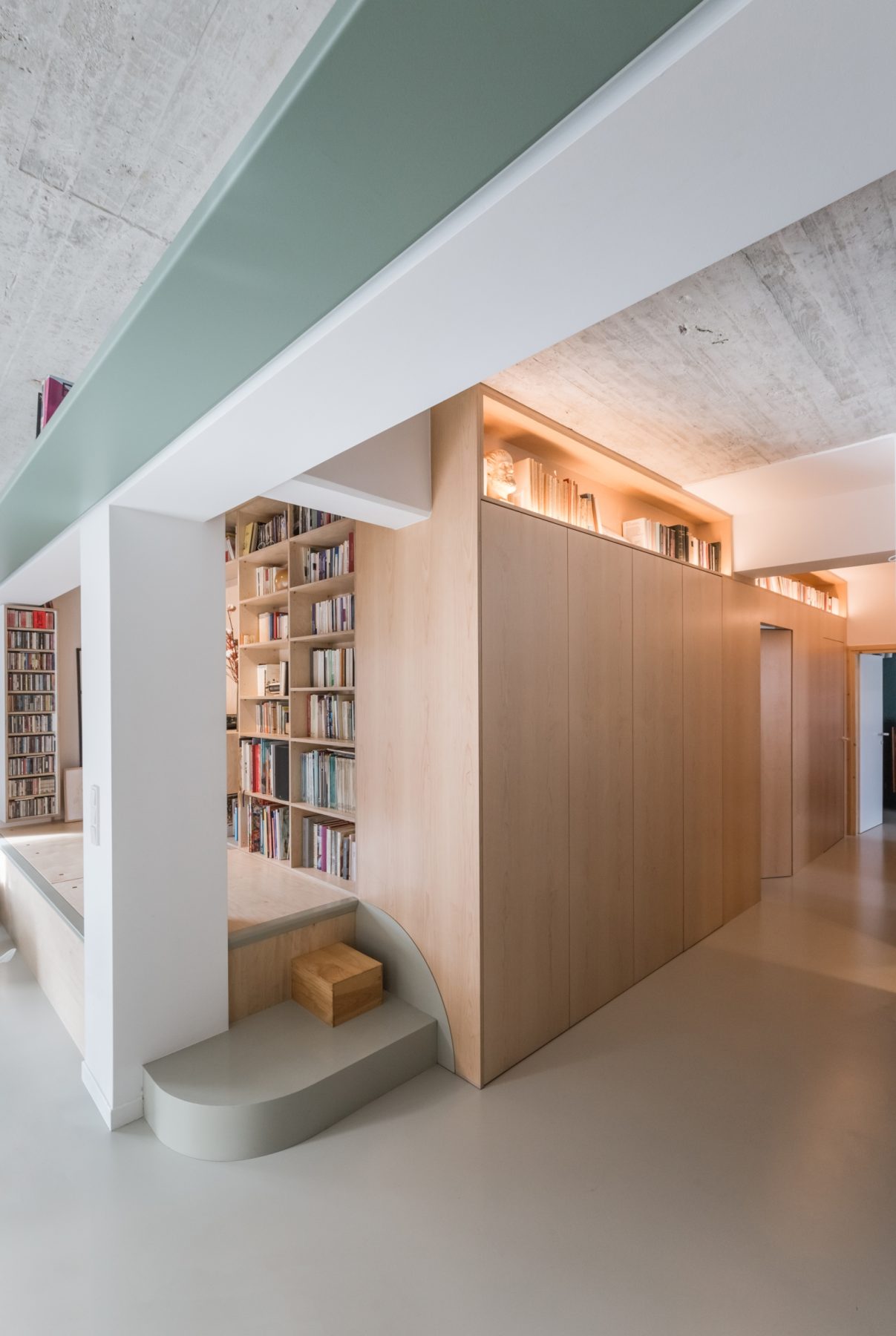 P22 originally functioned as a typical open-plan professional space, fragmented by lightweight partitions and suspended ceilings. The removal of these elements revealed its true spatial potential: an expansive, unified floor plan with an exposed concrete ceiling and a strong sense of continuity. Rather than reinstating conventional subdivisions, the architects chose to preserve and intensify this sense of unity, adapting it to the needs of a family.