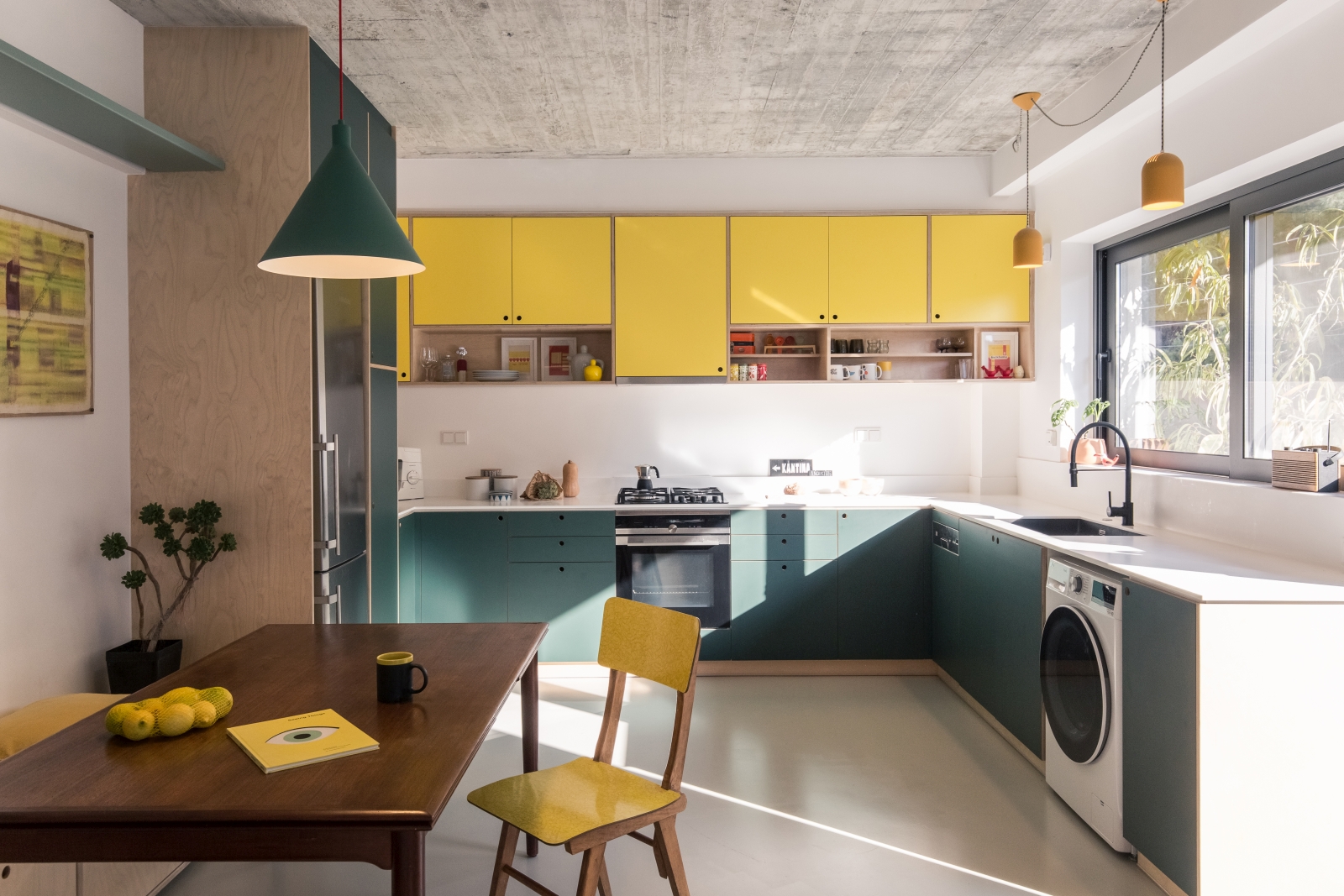 Plywood surfaces extend horizontally throughout the apartment, forming a warm zone between the rough, exposed concrete ceiling and the new, unified floor. In the kitchen, this zone is enriched with bold colors on the cabinet fronts, subtly defining the space without disrupting the overall coherence of the design.