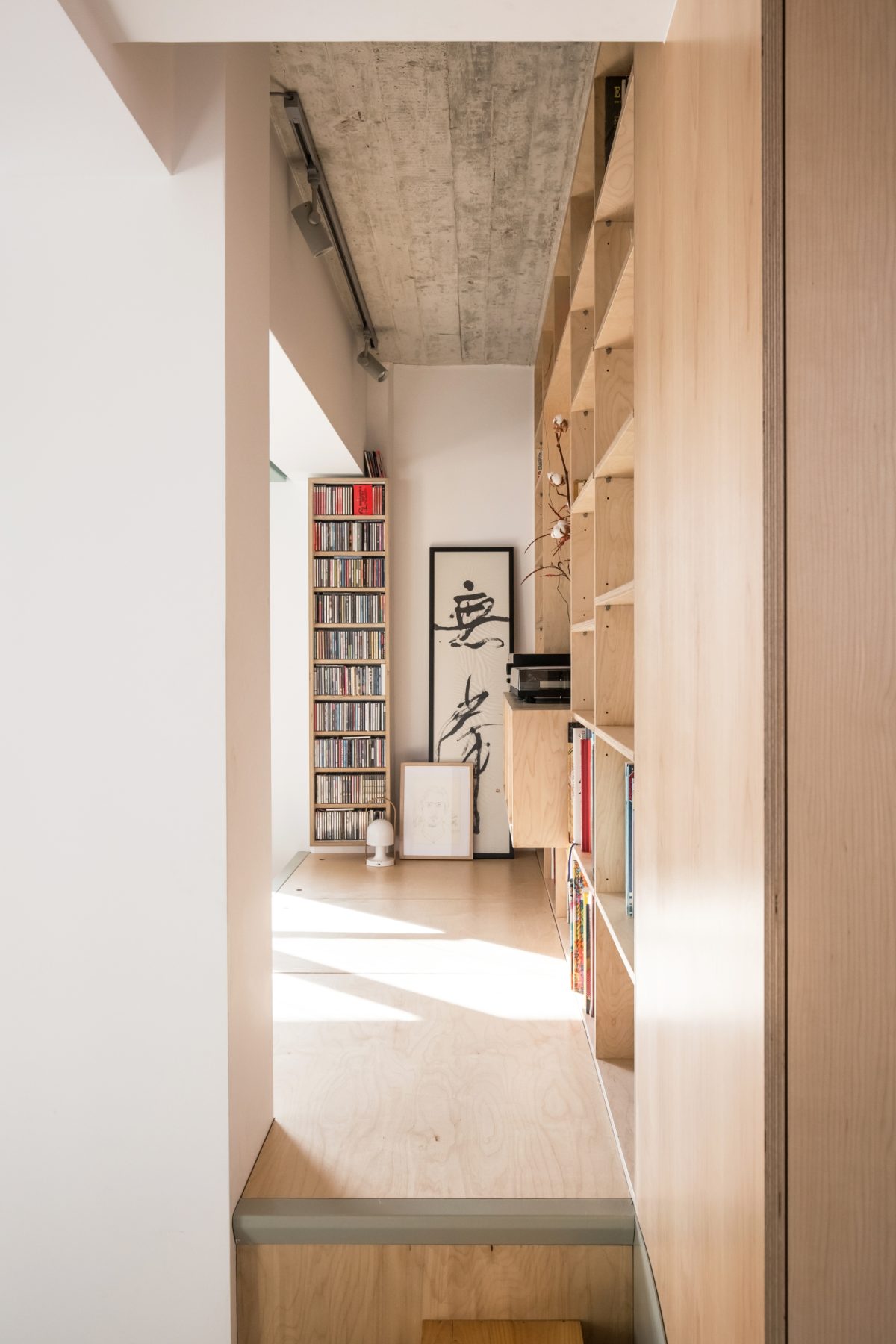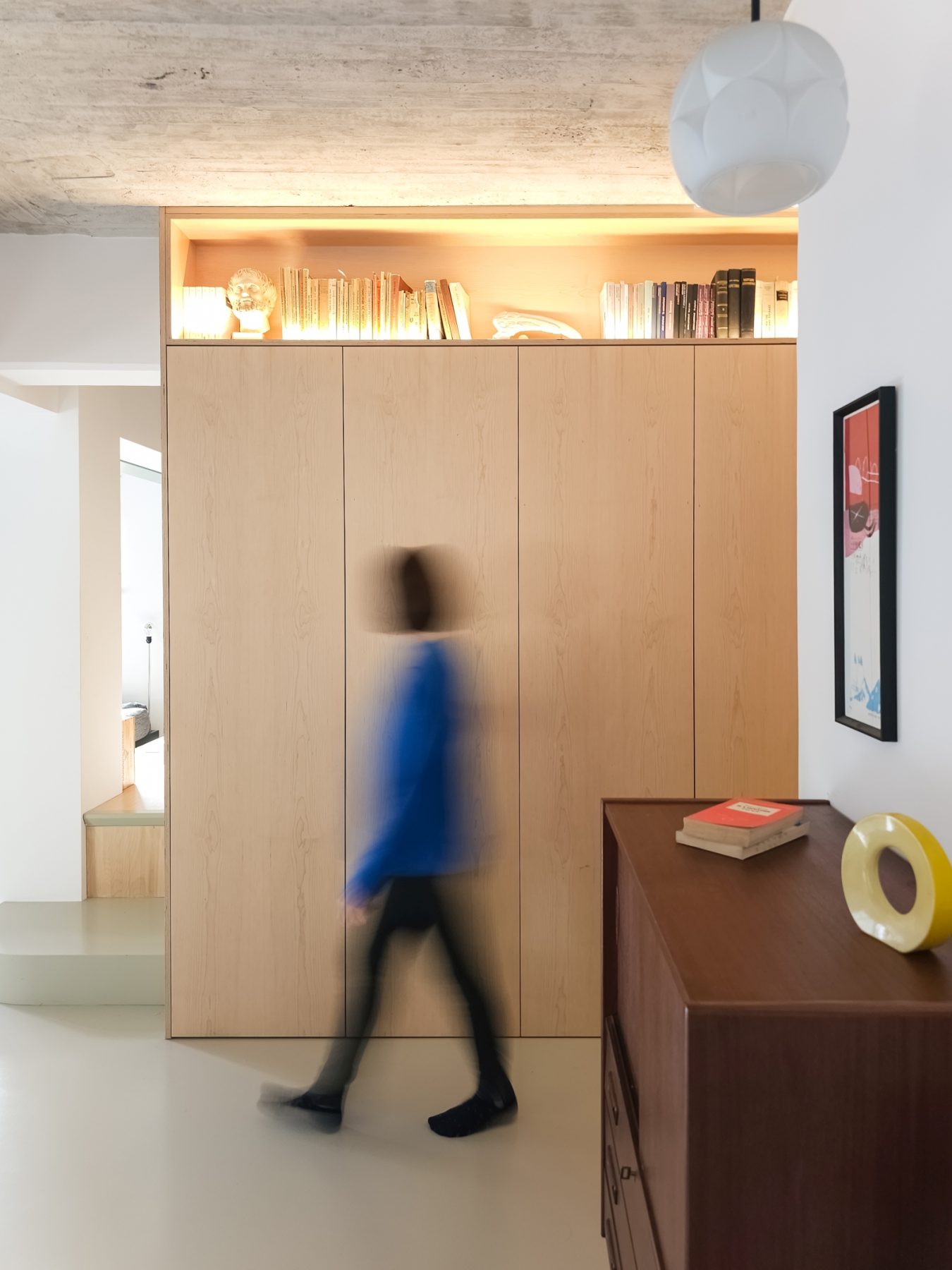 At the heart of the apartment stands an autonomous plywood structure, a compact “box” that accommodates the bedrooms.