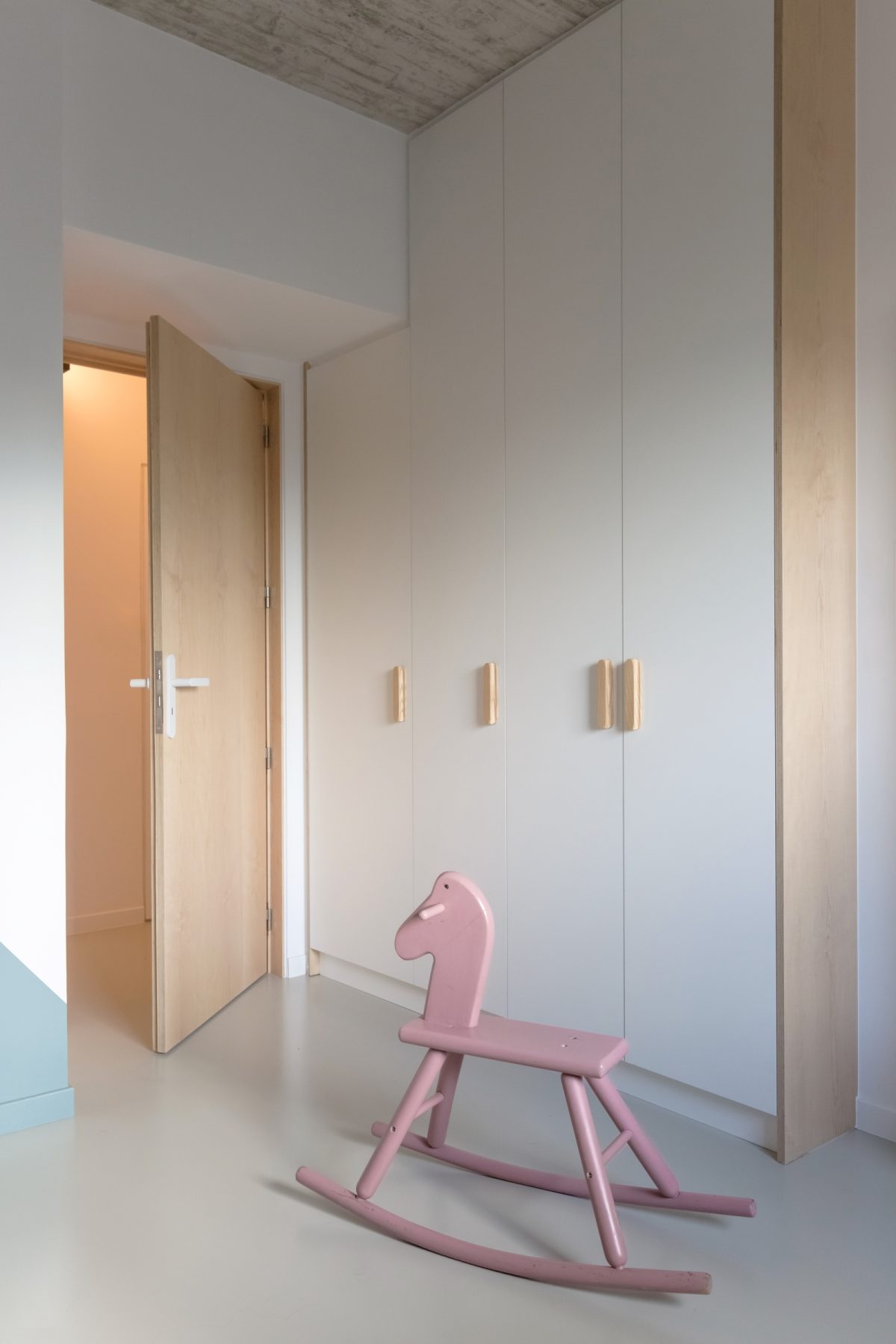 All wooden constructions are oriented inward, freeing the apartment’s perimeter and allowing unobstructed views toward the surrounding environment. In this way, the apartment is shaped as a clearly organized yet fluid dwelling: a space that supports the everyday life of a family while simultaneously inviting exploration, movement, and alternative readings of the domestic environment.